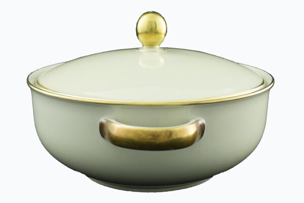 Vajilla Vintage de porcelana alemana «Hutschenreuther Turvel» (Selb Bavaria Germany), en color marfil, con filo y asas en dorado.