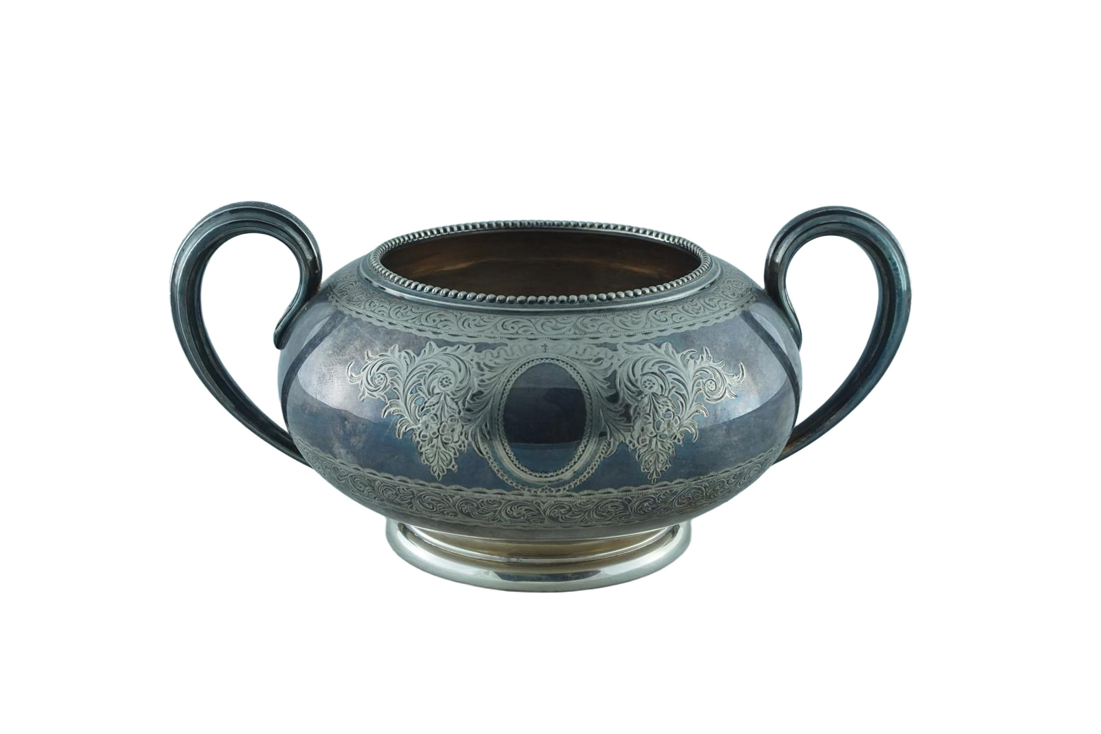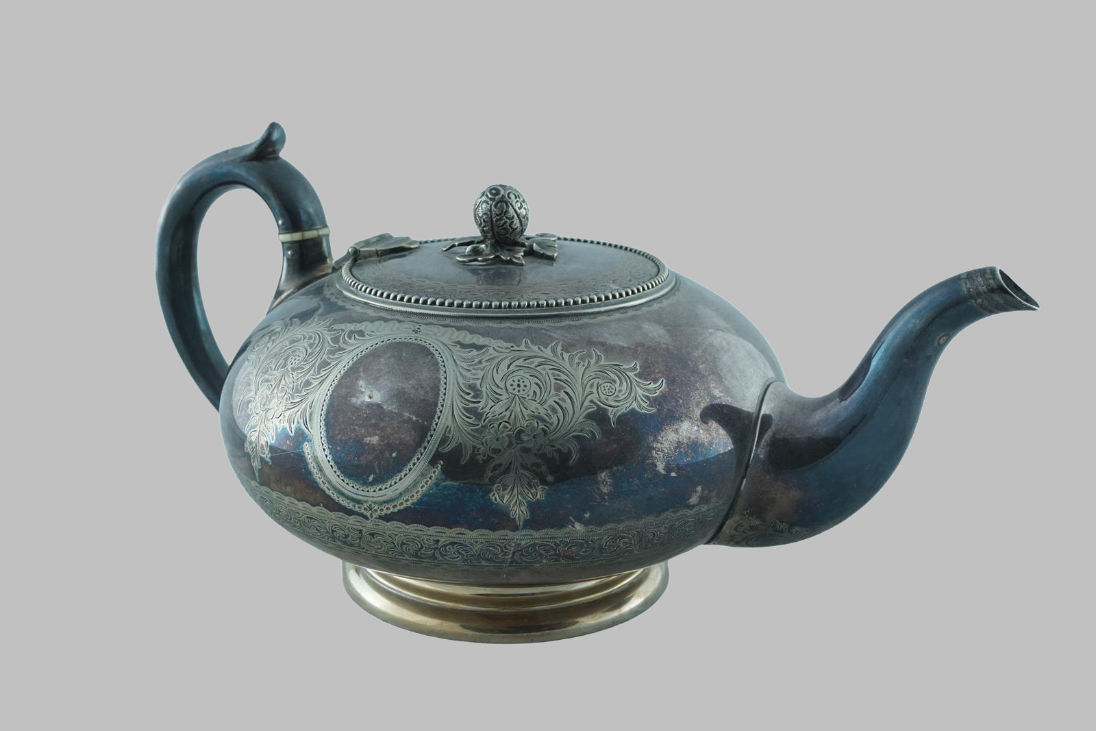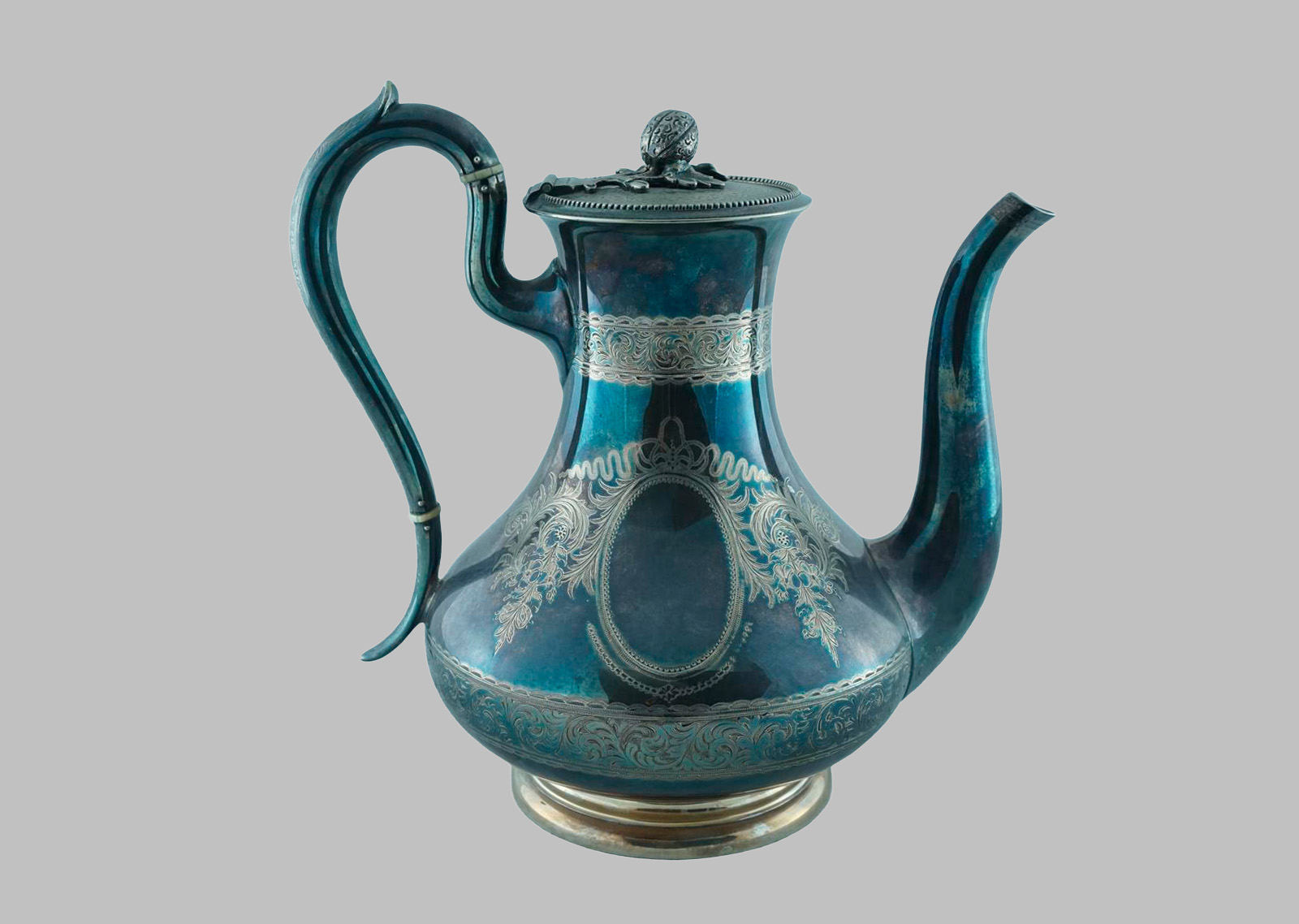Juego Té/Café de plata inglesa «Elkington & Co.» (1840 – 1897), compuesto de cuatro piezas (cafetera, tetera, azucarero y lechera) y con una bandeja de plata de Meneses.