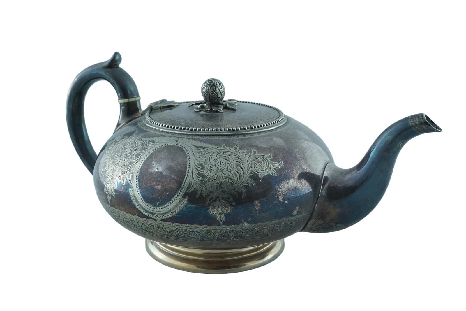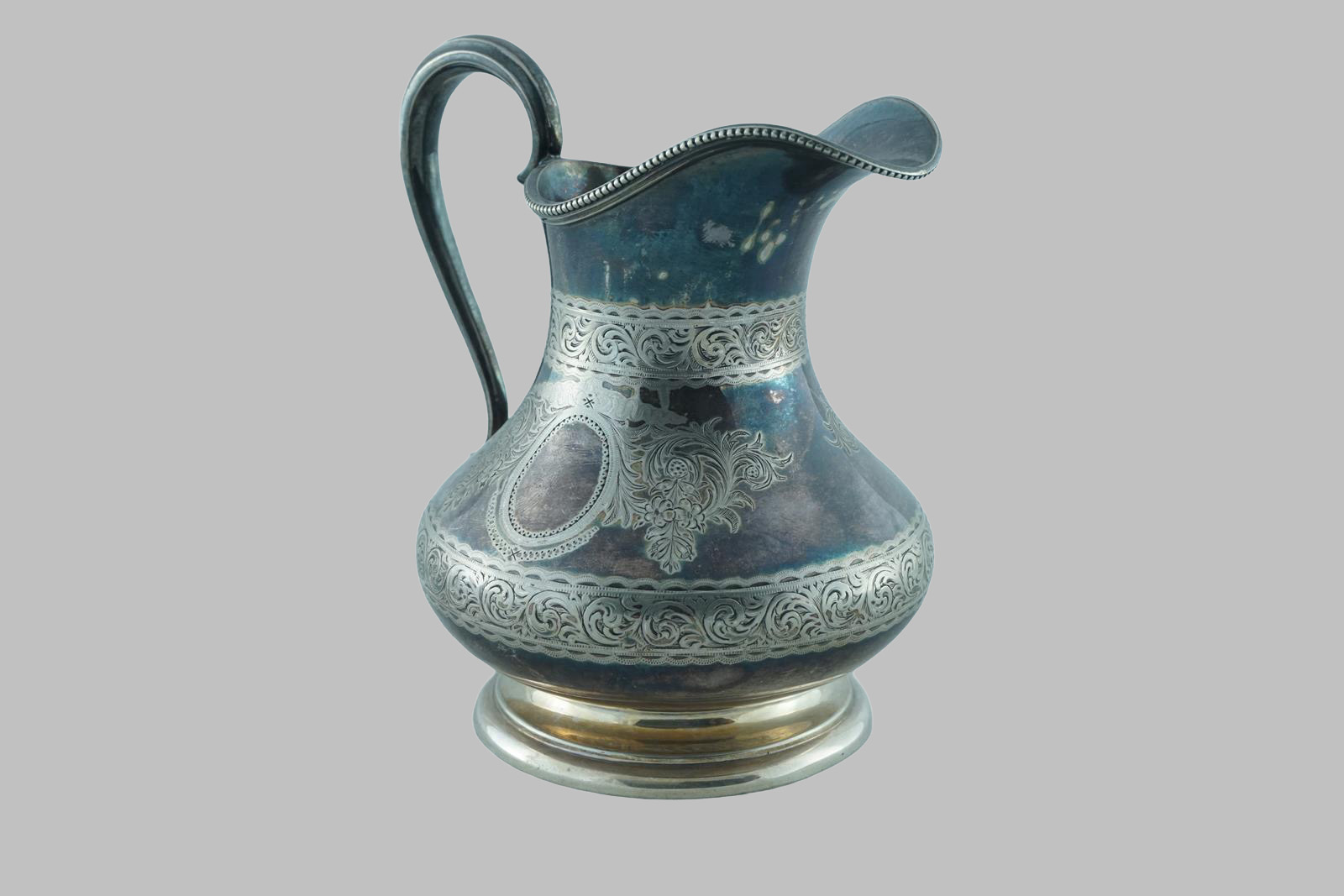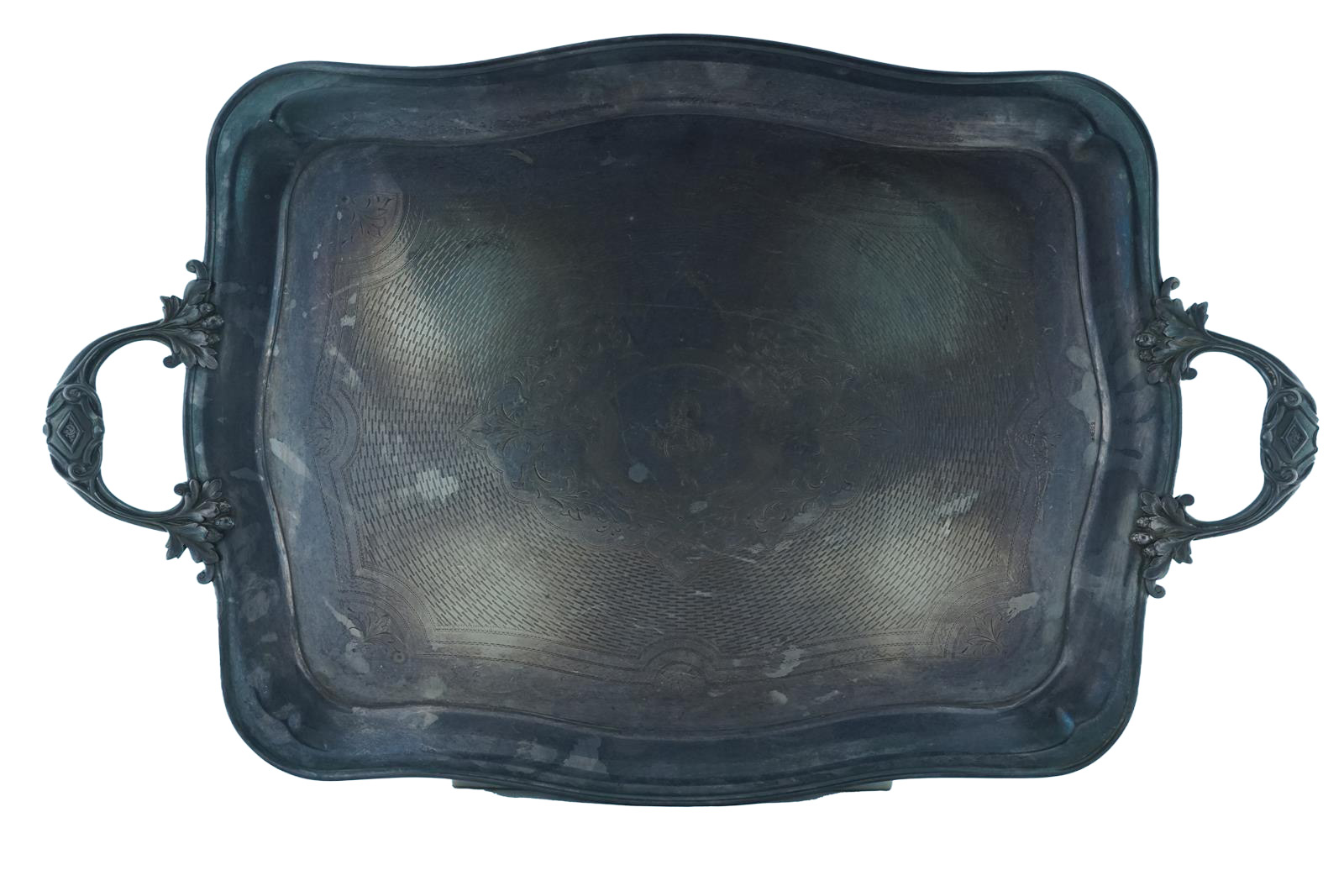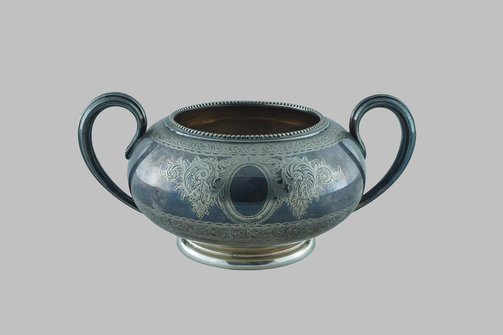 Juego Té/Café de plata inglesa «Elkington & Co.» (1840 – 1897), compuesto de cuatro piezas (cafetera, tetera, azucarero y lechera) y con una bandeja de plata de Meneses.