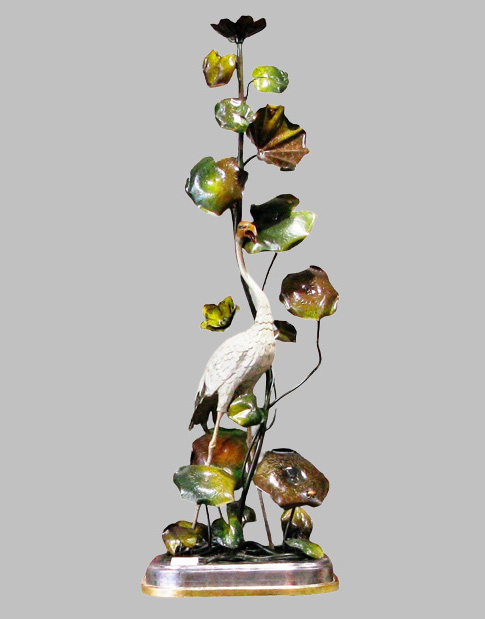 Lámpara de pie Modernista «Art Nouveau» de bronce policromado en forma de una planta de nenúfar con grandes hojas y flores rojizas, ranas, insectos y la figura de una garza junto al tronco.