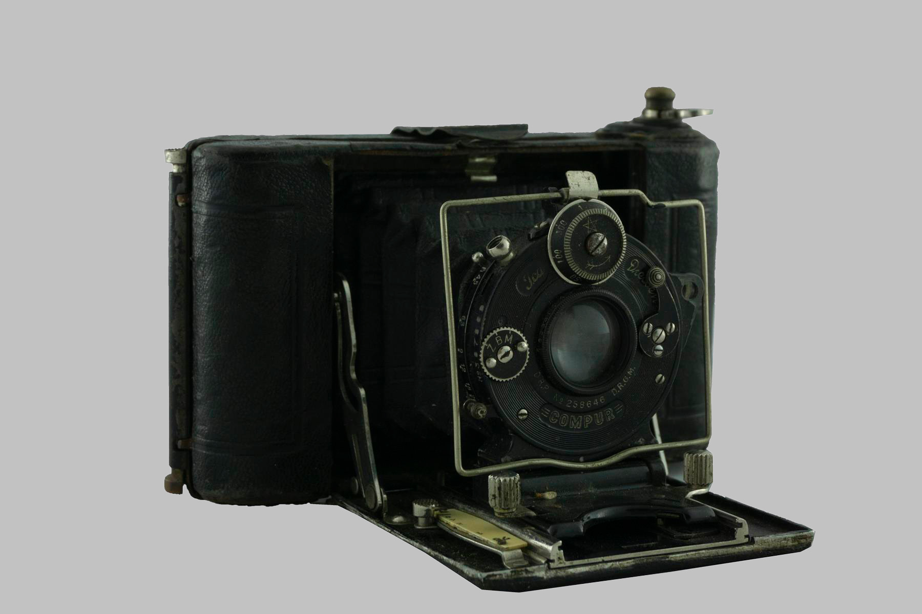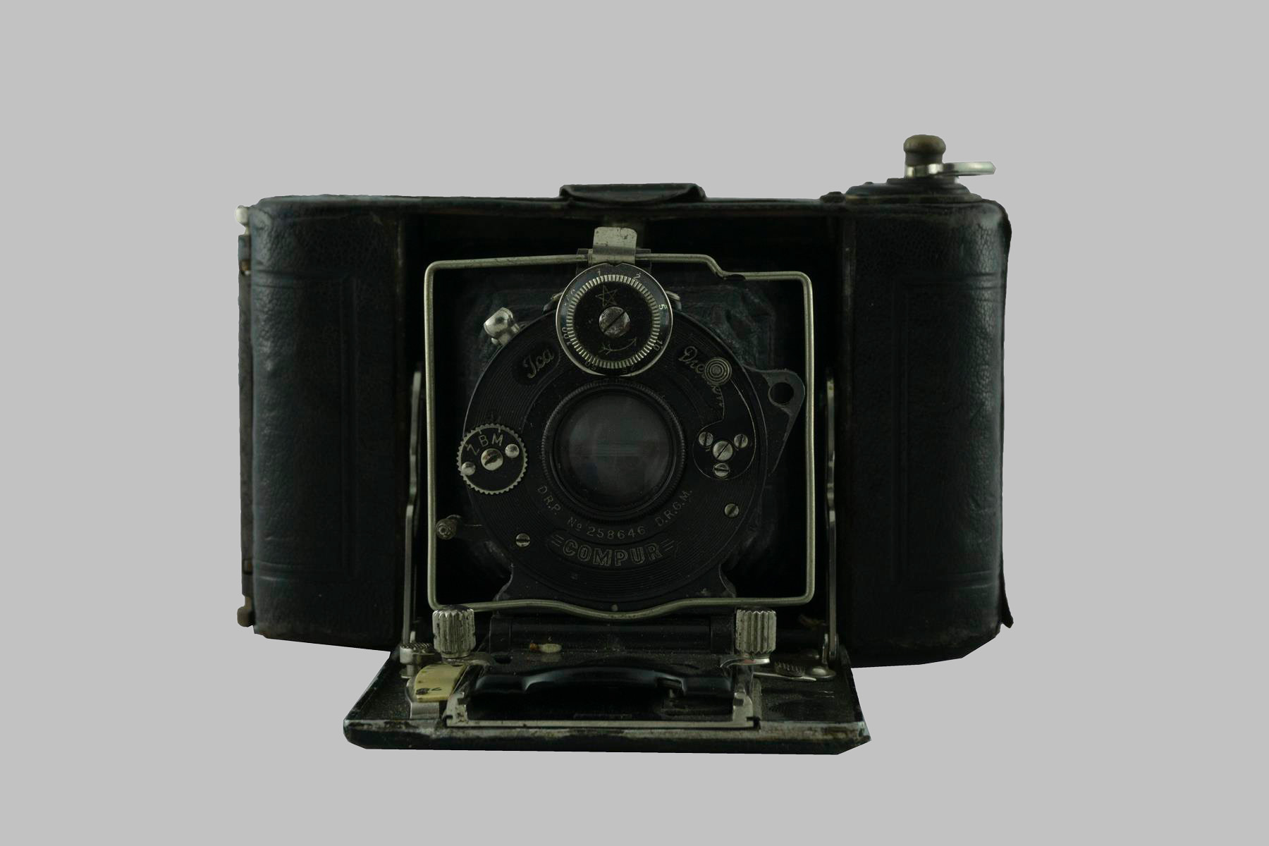 Antigua cámara fotográfica con fuelle «Ica («International Camera Aktiengeschelschaft») Icarette Dresden» Compur D.R.P. Nº258646 D.R.G.M., con estuche de piel negra.