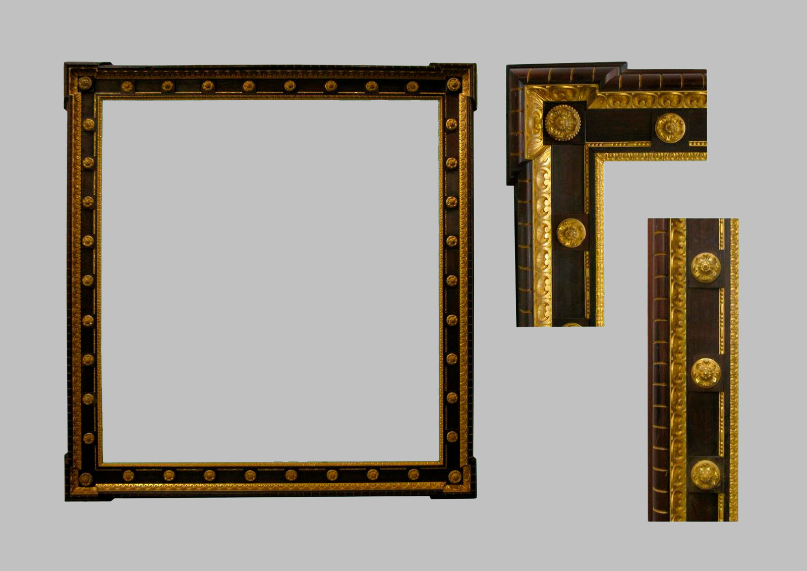 Marco de madera de palisandro con talla dorada en oro fino y adornado con rosetones también de talla dorada alrededor de todo el marco.