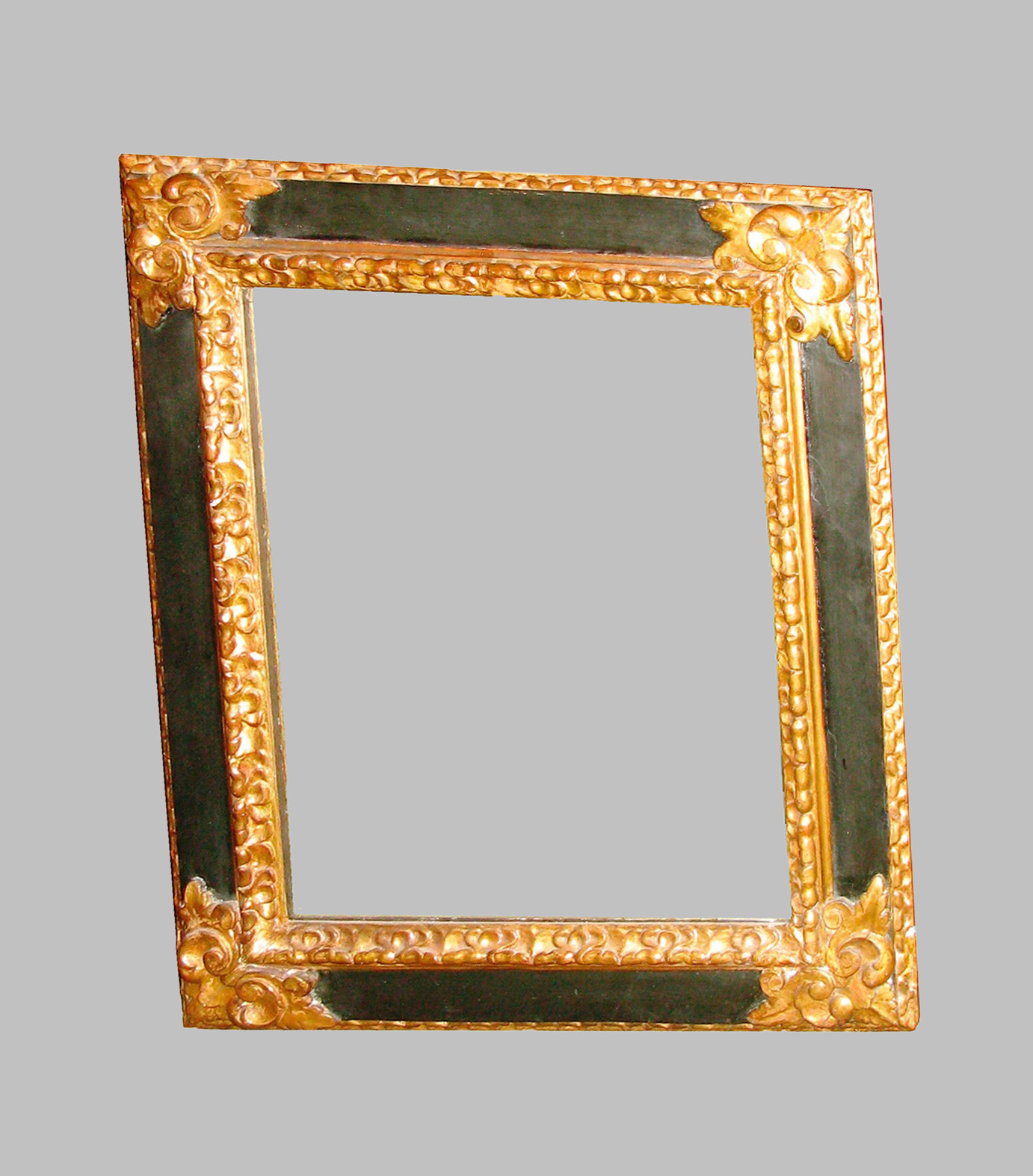 Marco de Talla policromado en negro, con los bordes interiores y exteriores tallados y dorados con oro fino y motivos florales en esquinas, también tallados y dorados.