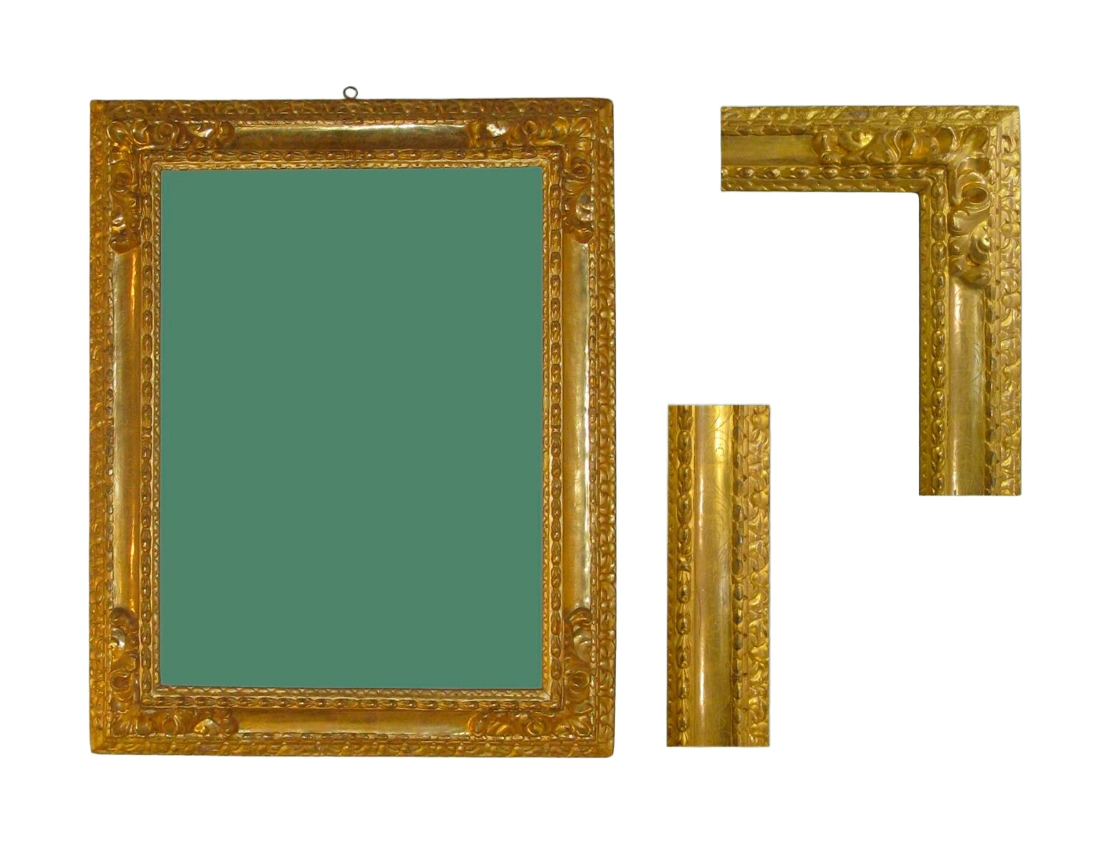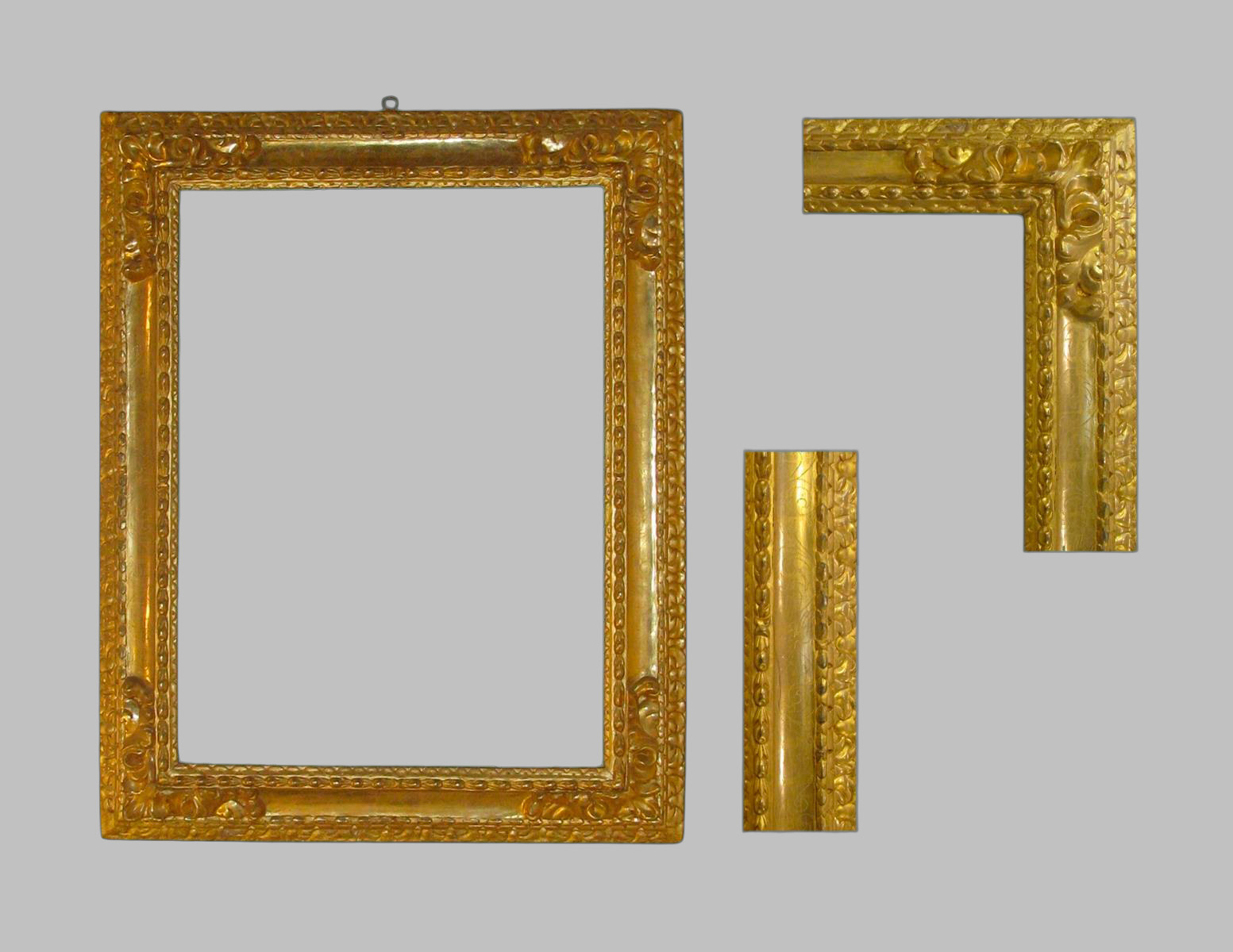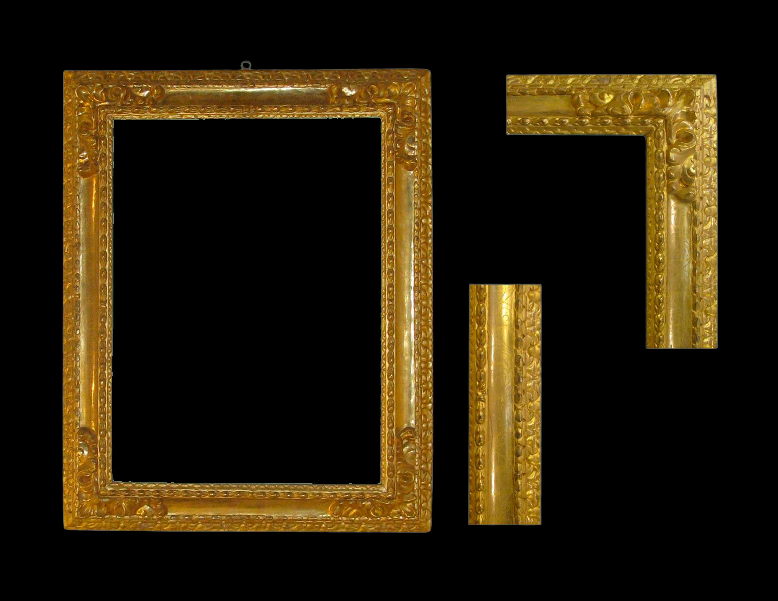 Marco de talla dorado con oro fino, punteado y con tallas en relieve en las cuatro esquinas.
