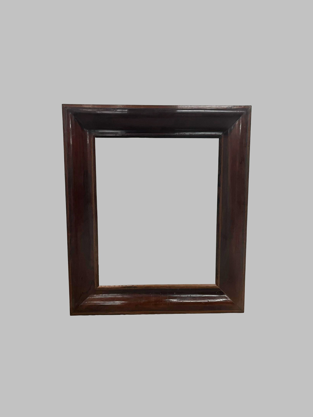 Marco abombado, realizado en caoba maciza y decorado con marquetería de limoncillo, que destaca por su contraste de maderas nobles y su refinada ejecución artesanal.