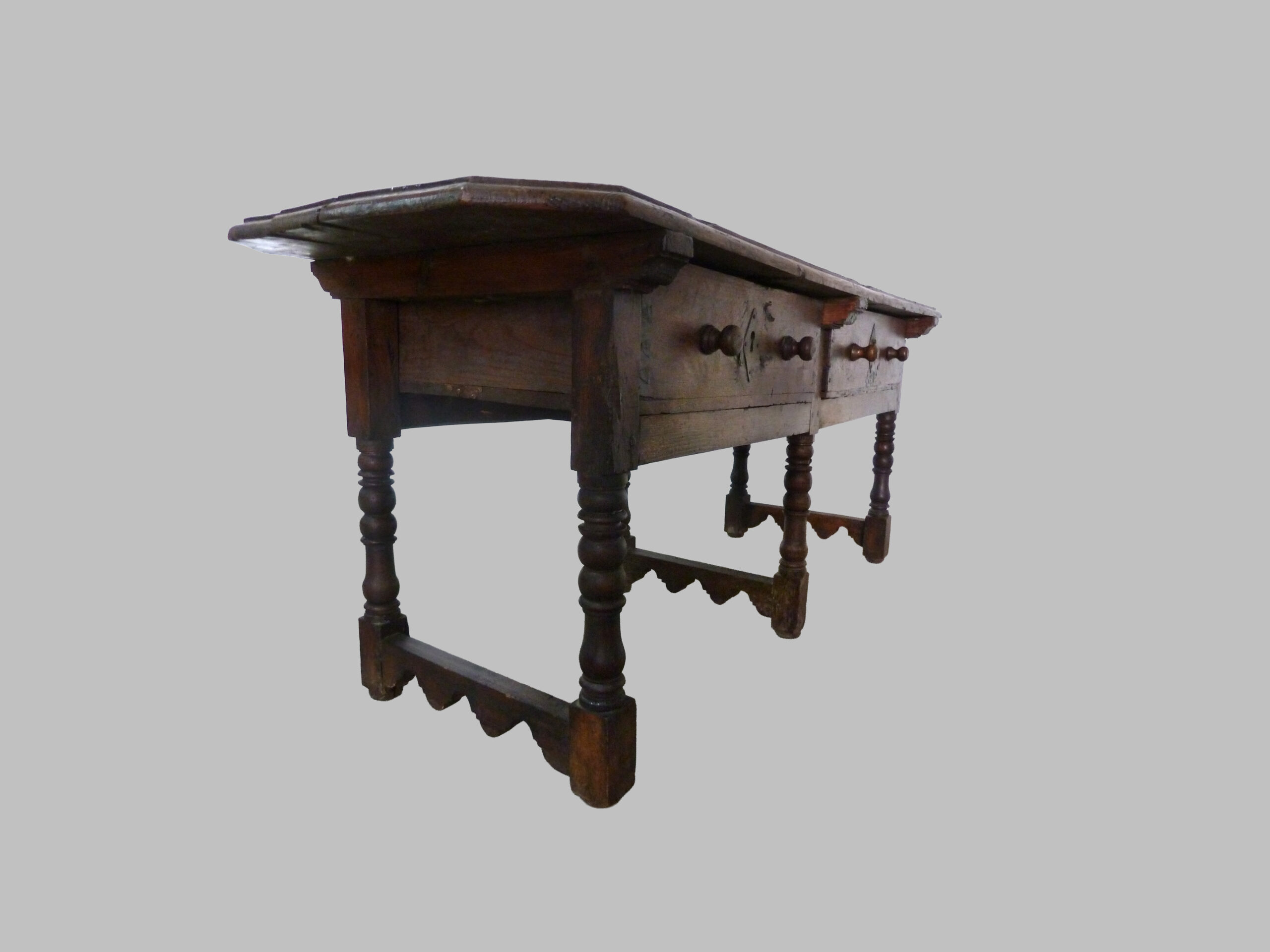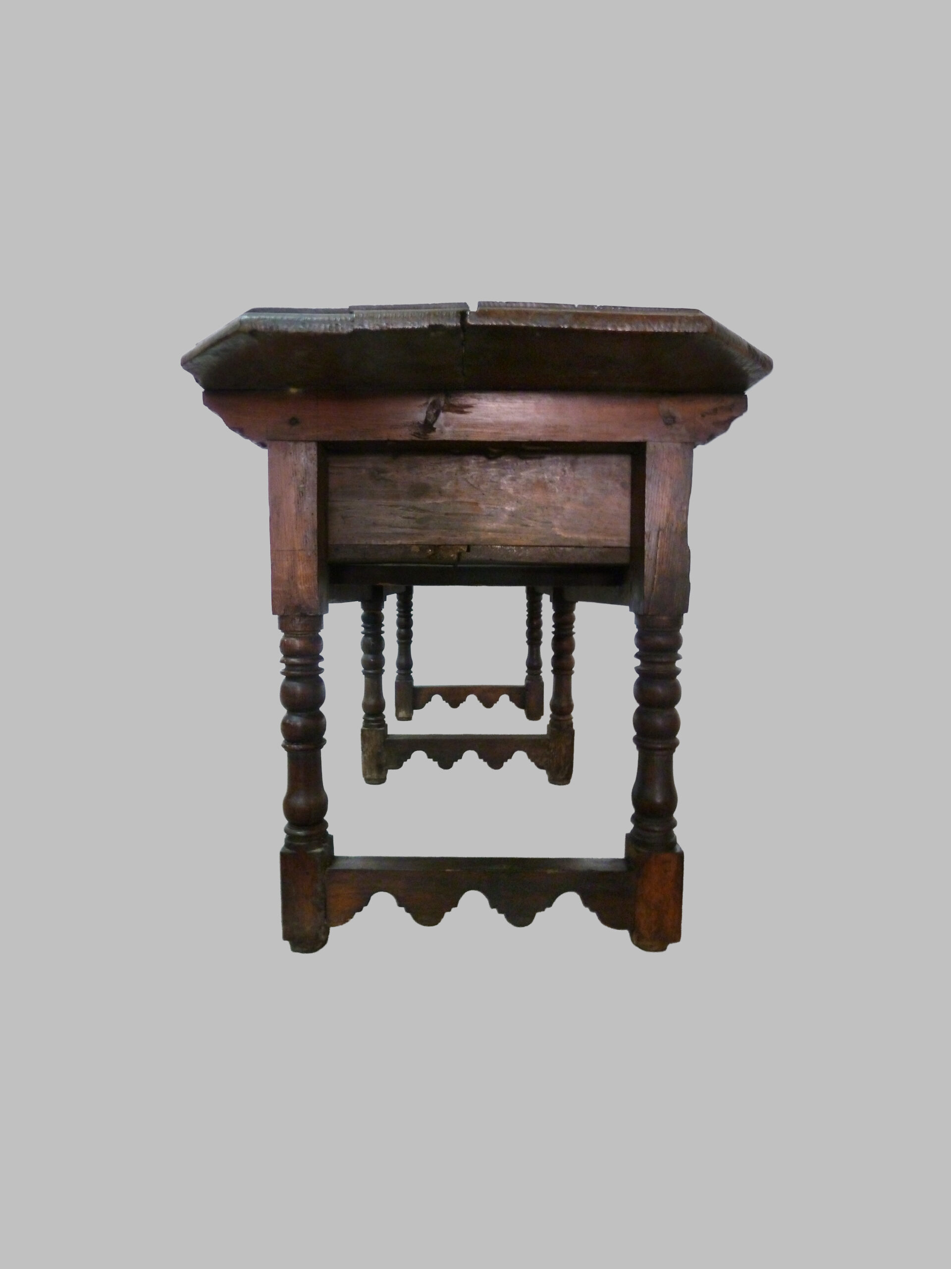 La mesa destaca por su sobre de forma octogonal, un detalle singular que aporta personalidad al diseño, y por sus pies torneados, característicos de los muebles del siglo XVII. Esta estructura robusta refleja la maestría artesanal de la época y aporta equilibrio visual al conjunto.