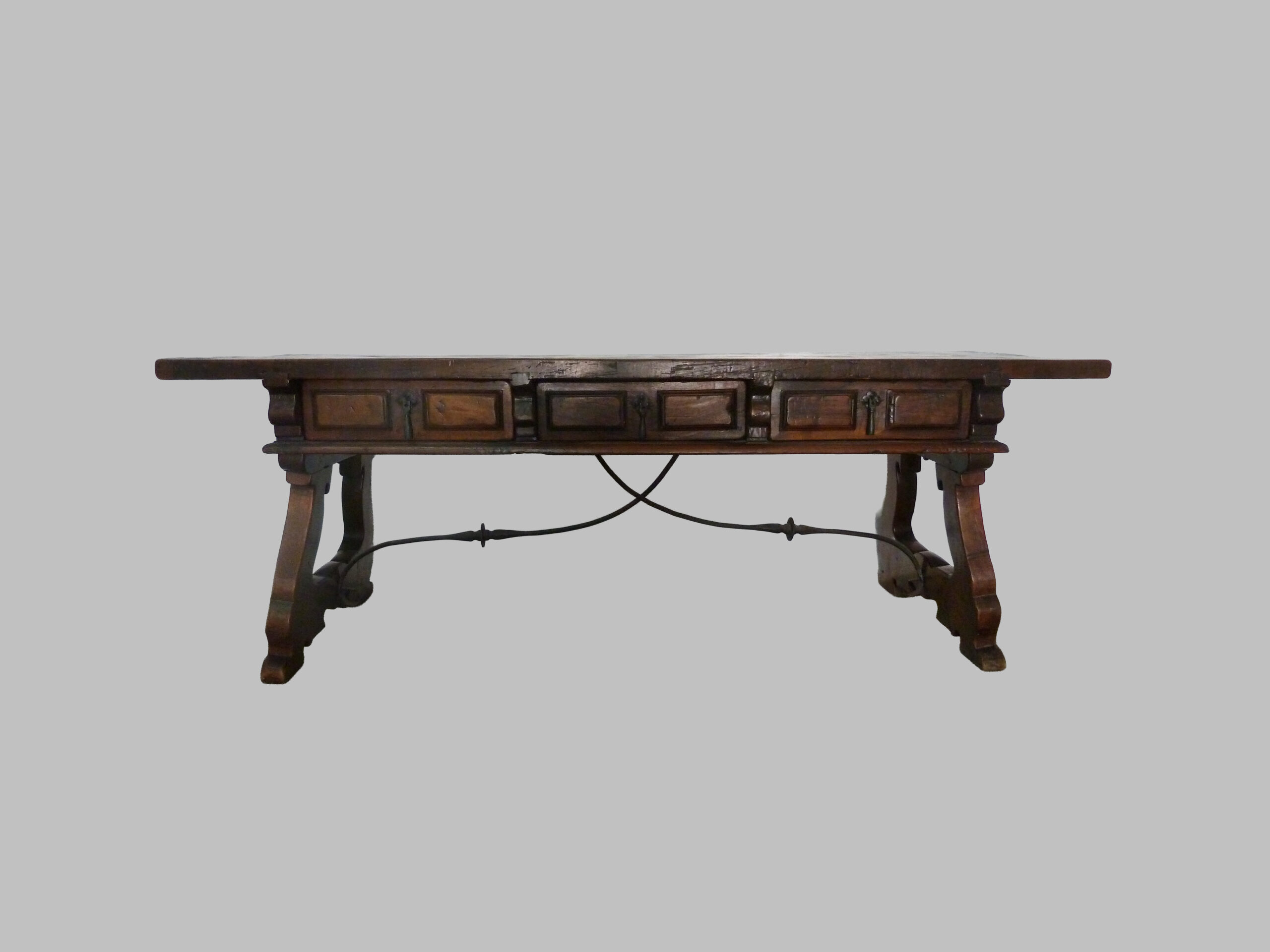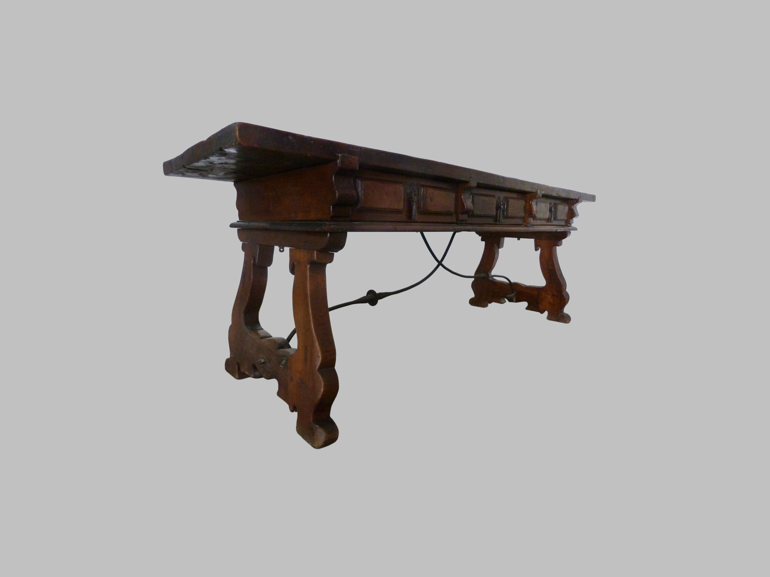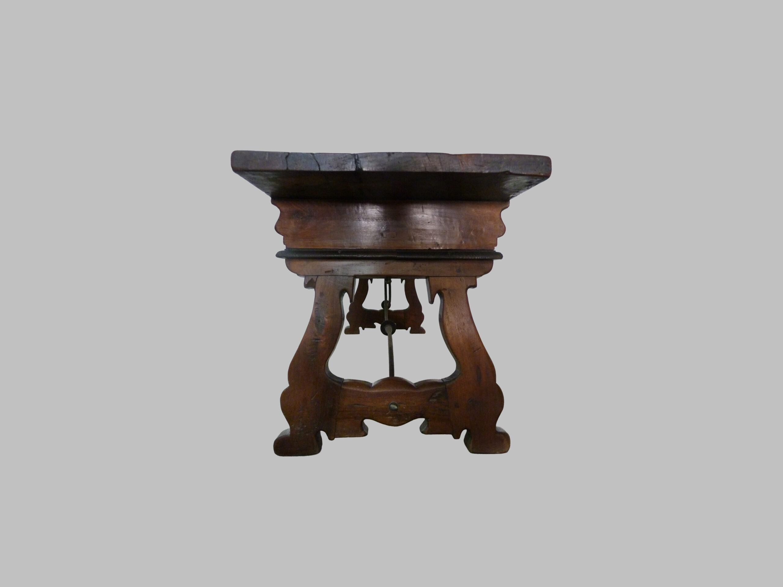 Mesa castellana de nogal del siglo XVIII, una pieza de mobiliario tradicional que refleja la solidez y la funcionalidad características de la ebanistería española de la época.