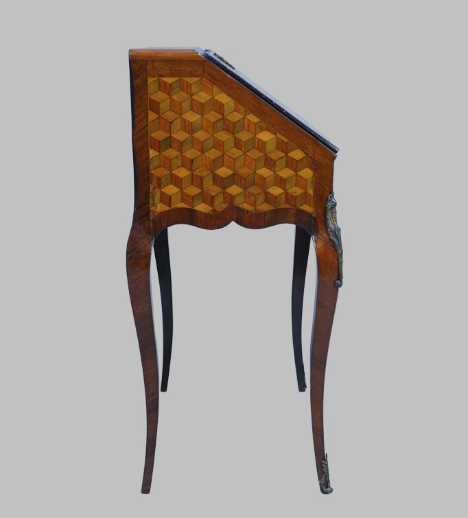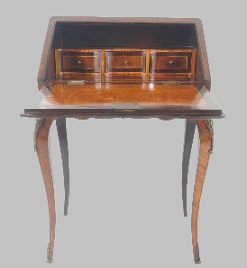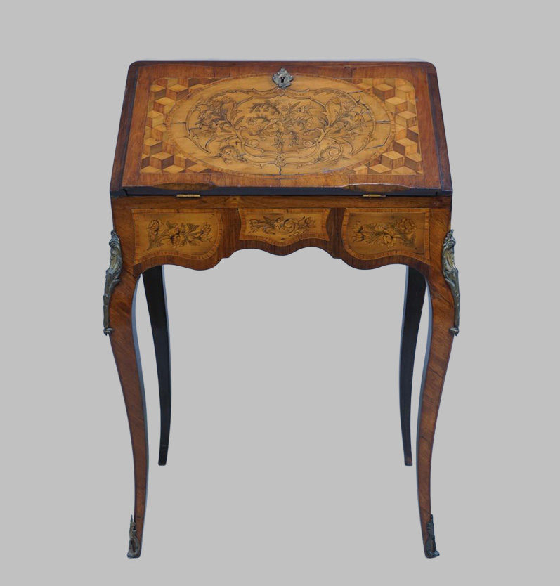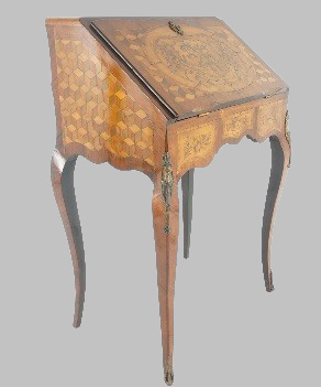 Pequeño Buró holandés de madera de nogal con incrustaciones de limoncillo y pies cabriolé, con aplicaciones metálicas en las patas delanteras y decoración floral en tapa y frontal y el resto decorado con formas romboidales. En el interior tiene la tapa forrada con terciopelo color ocre, cajón secreto y tres cajoncitos frontales.