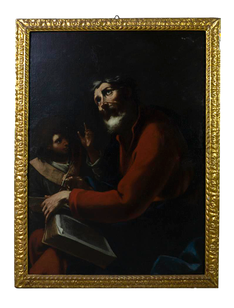 Oil on canvas: Image of a Saint with a red robe writing in a book, with a young disciple next to him.