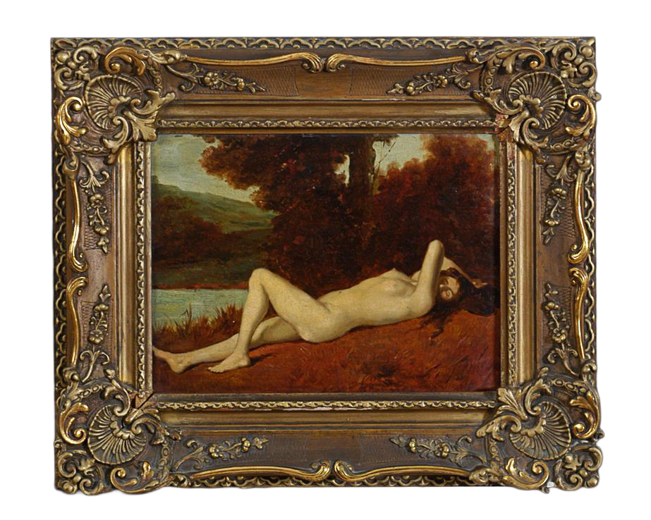 The oil represents: “Baigneur au repos”, a naked woman lying on the grass, after bathing in a river.