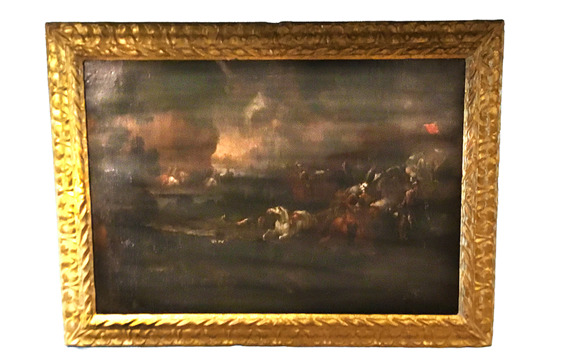 Magnífico óleo sobre tela de la Escuela Española, siglo XVIII, que representa una escena de batalla con gran fuerza visual. La composición se centra en un caballo en el eje central, acompañado por dos guerreros situados a la derecha, generando equilibrio y dinamismo en la obra. La obra transmite dramatismo y vigor narrativo, propios de la tradición pictórica del periodo.