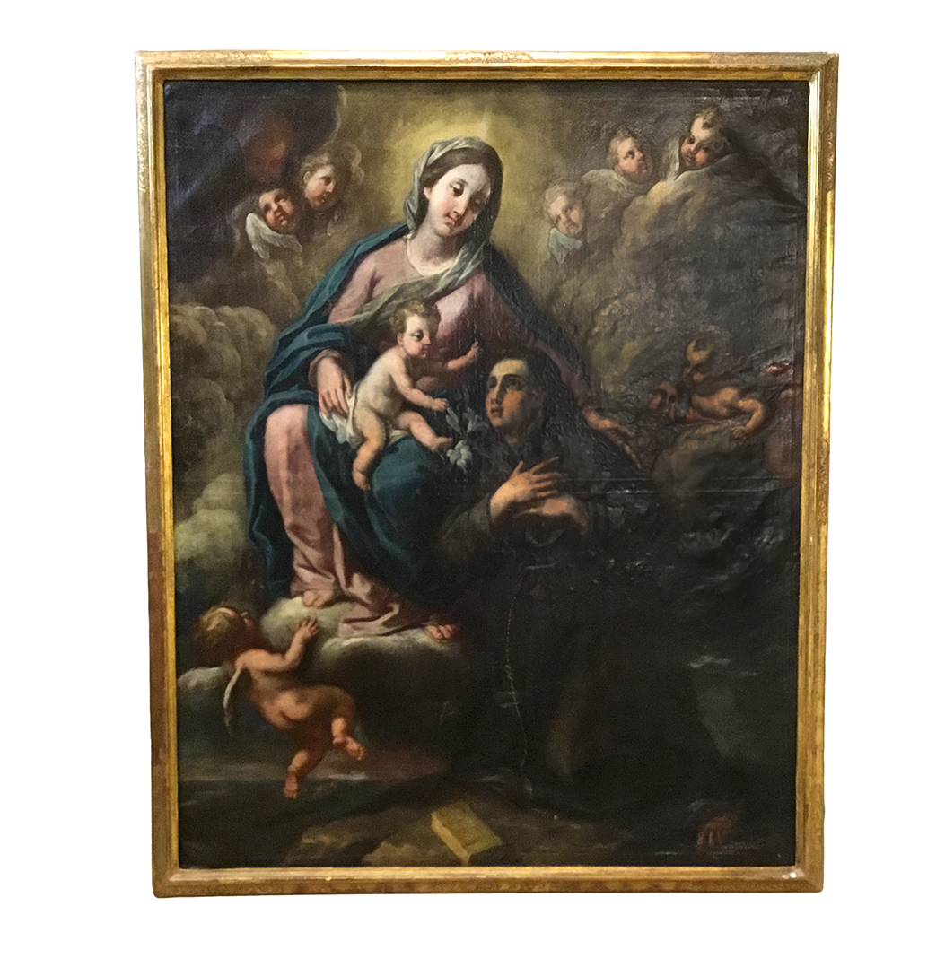 Magnífico óleo sobre tela del siglo XVI que representa a la Virgen con el Niño, acompañados por un santo y rodeados de ángeles en actitud devocional. La composición refleja la espiritualidad y el refinamiento del Renacimiento religioso, con un delicado tratamiento de las figuras y un fuerte simbolismo sagrado.