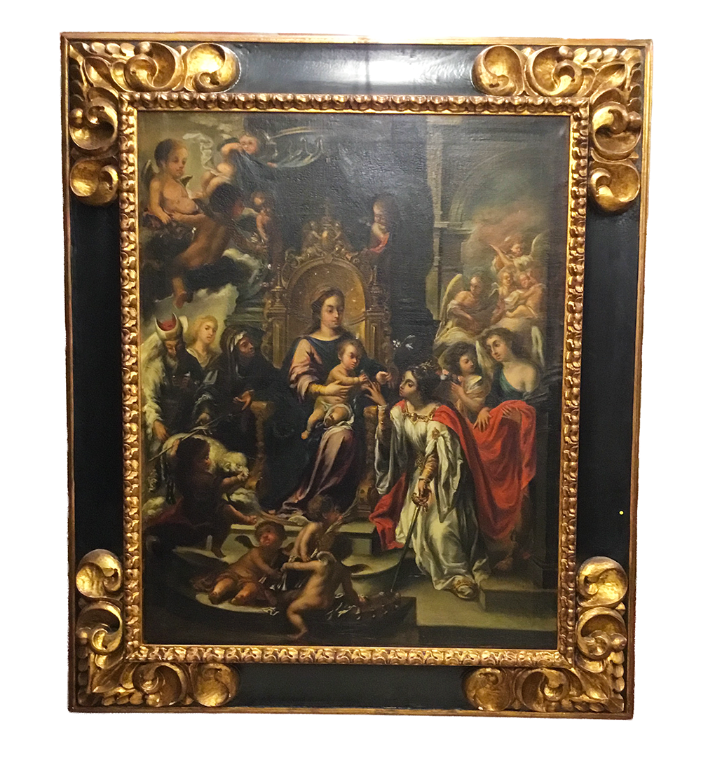 Imponente óleo sobre tela del siglo XVIII que representa a la Virgen con el Niño, sentada sobre un majestuoso trono y rodeada por numerosos personajes y ángeles celestiales. La obra transmite solemnidad y devoción, mostrando la riqueza iconográfica del arte religioso barroco.