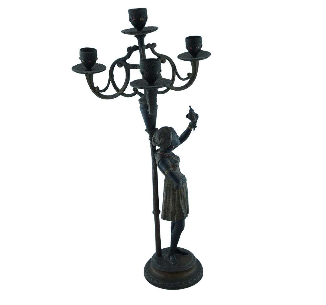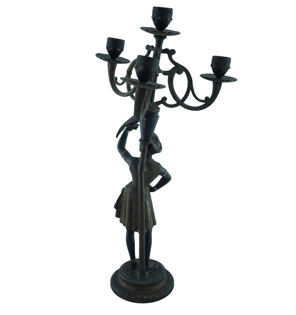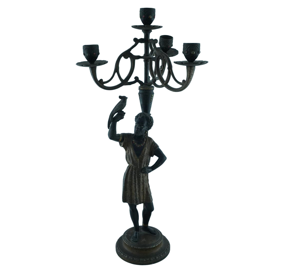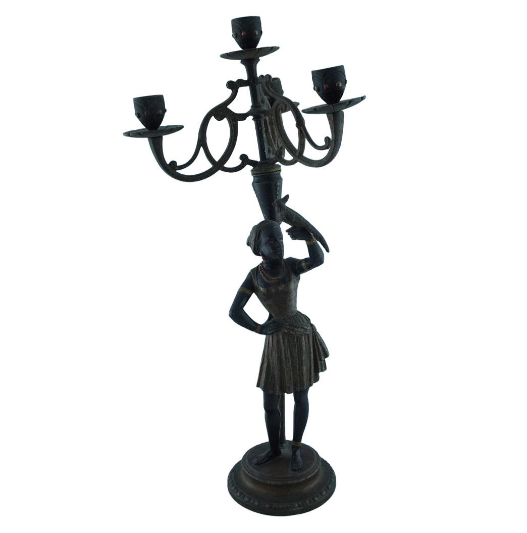 Pair of calamine candlesticks for four candles and with a circular base, each one of them has a Moorish figure (man and woman) holding a bird in his hand, they are supported by the shaft in the lower part of the candlestick.