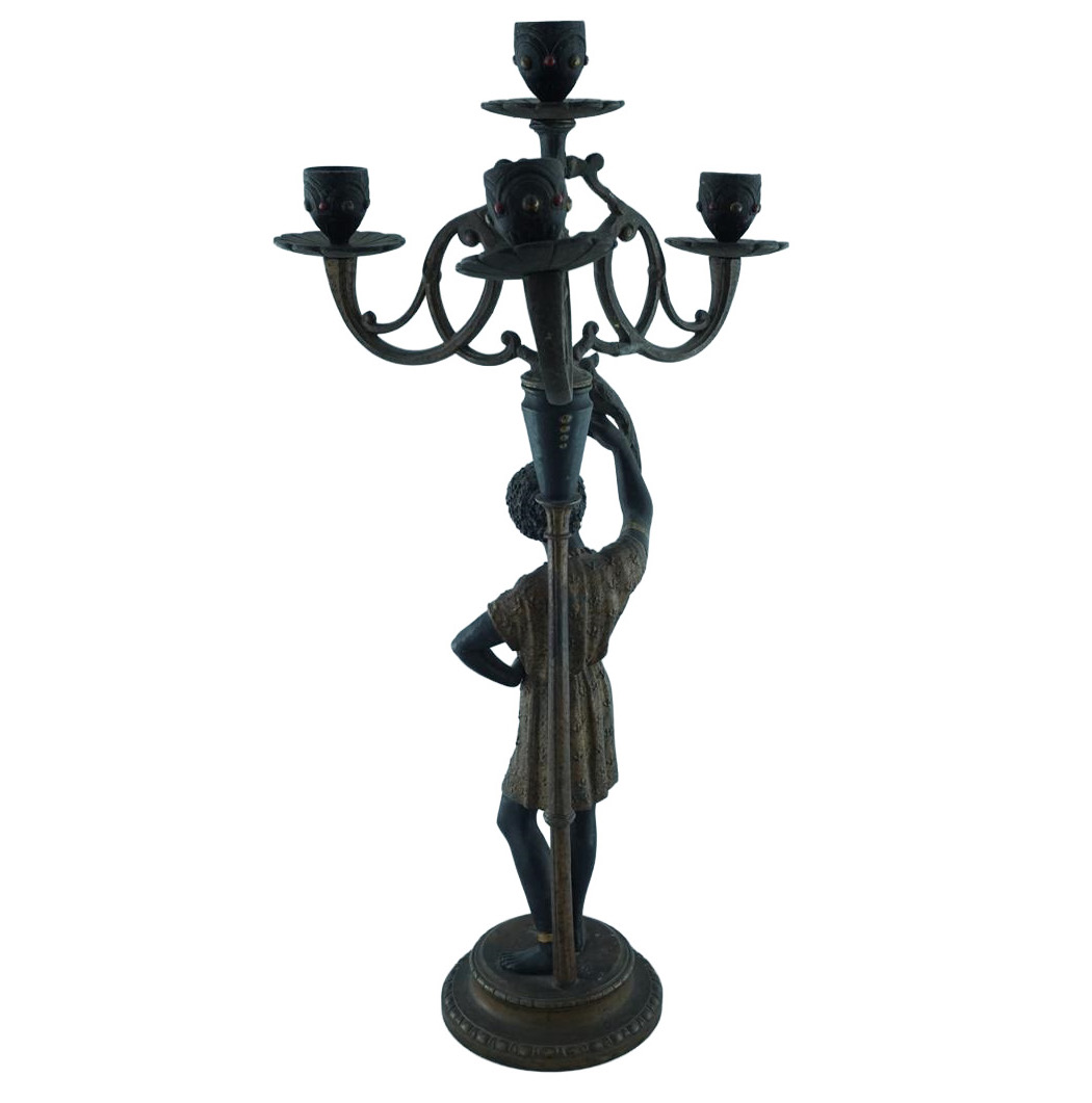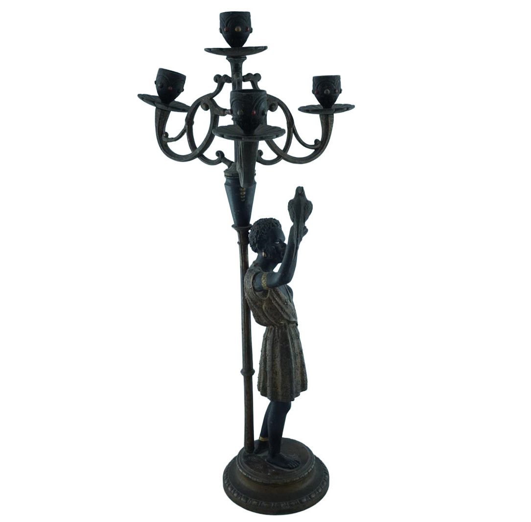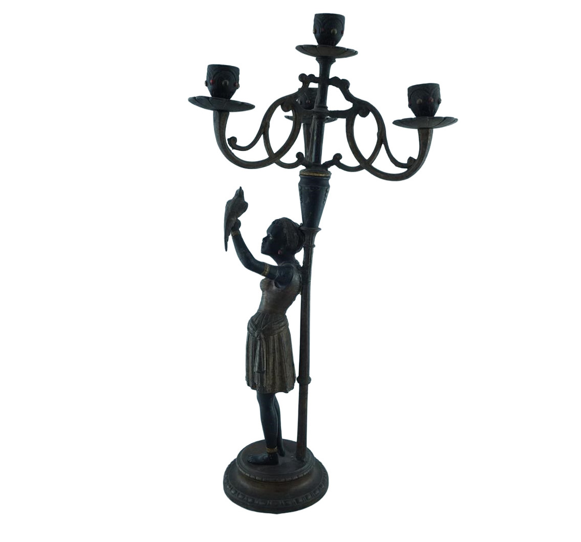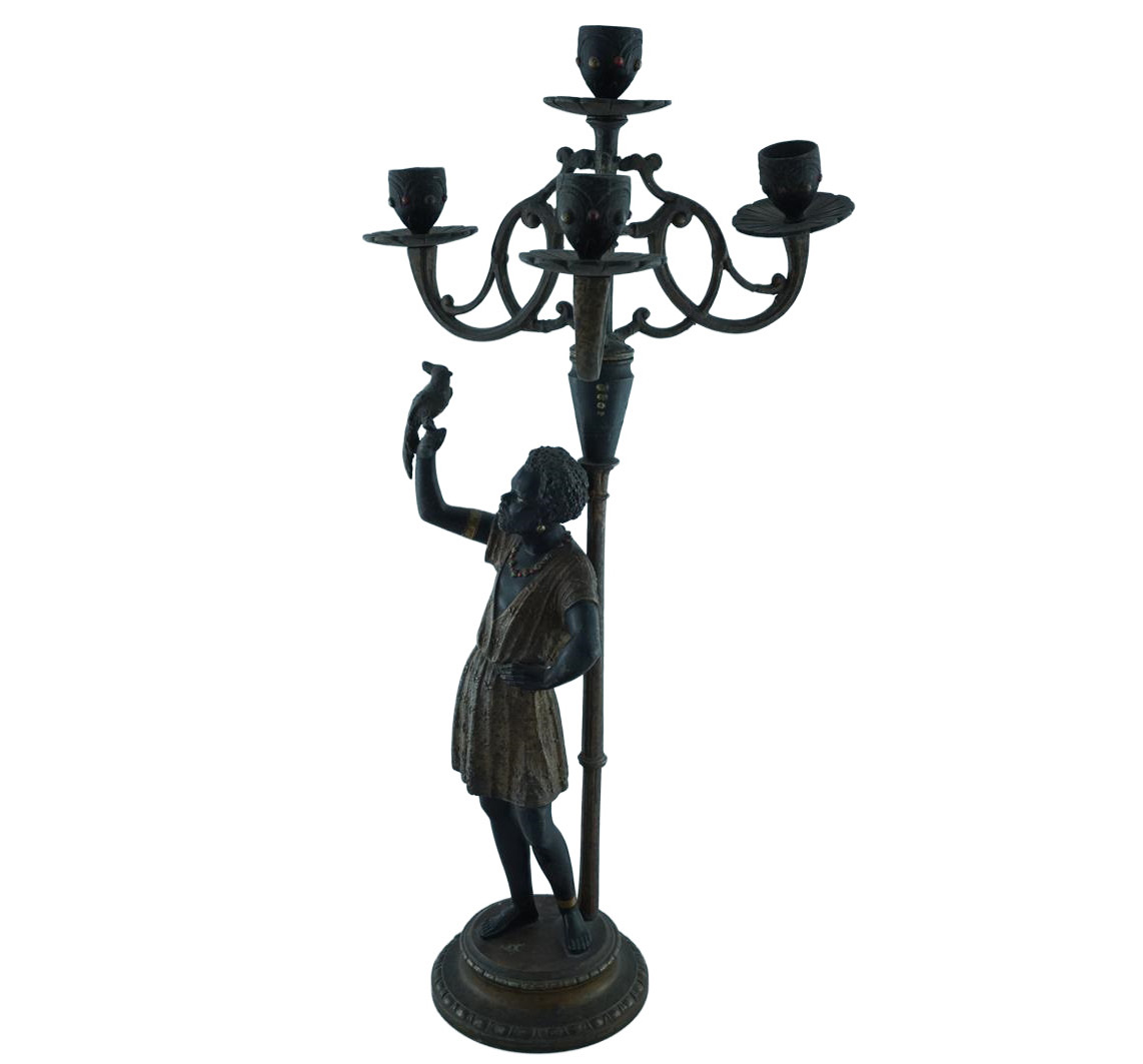 Pair of calamine candlesticks for four candles and with a circular base, each one of them has a Moorish figure (man and woman) holding a bird in his hand, they are supported by the shaft in the lower part of the candlestick.