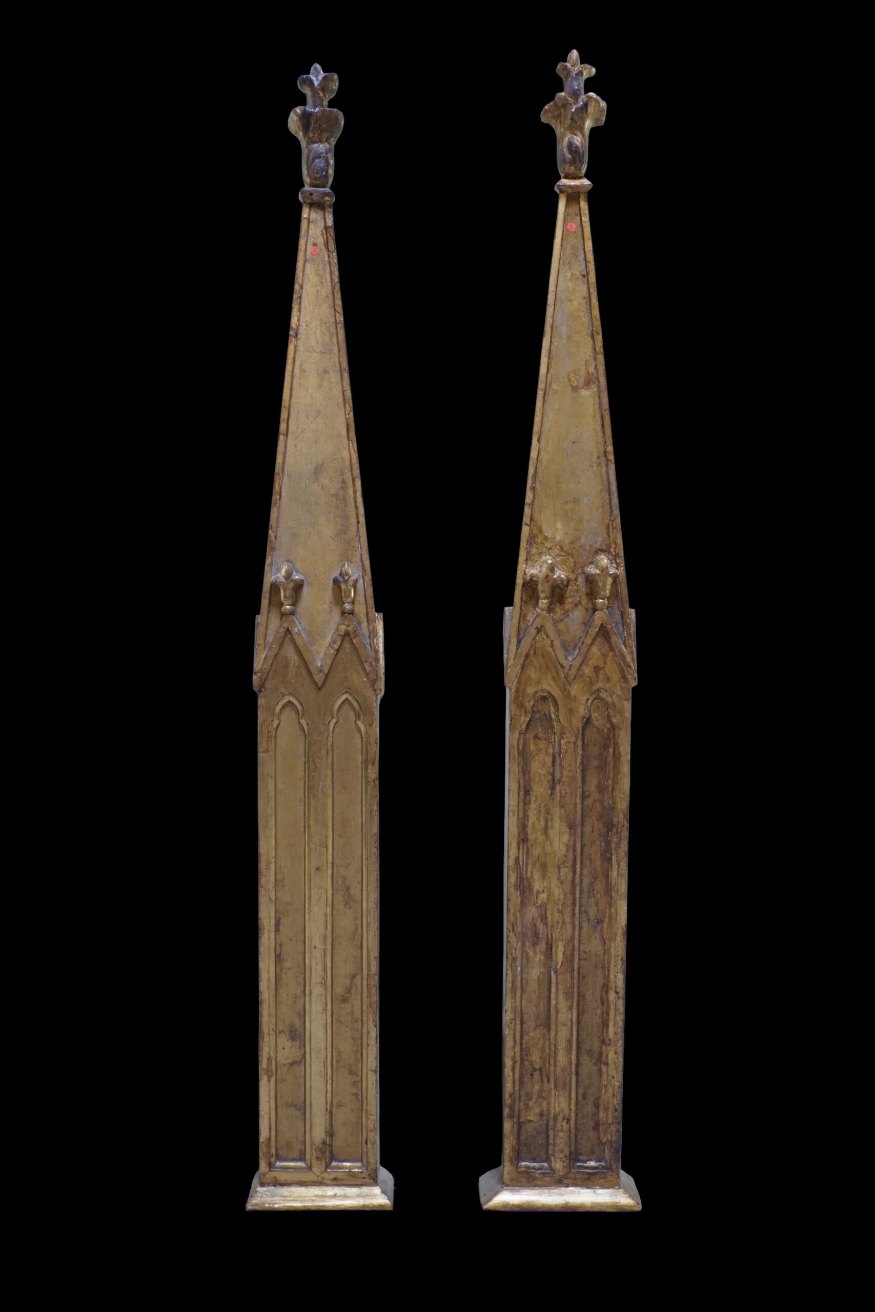 Pair of Neo-Gothic carving ornaments in the shape of a truncated-pyramide tower, gilded in fine gold, with a square base and an ornament on the minaret.