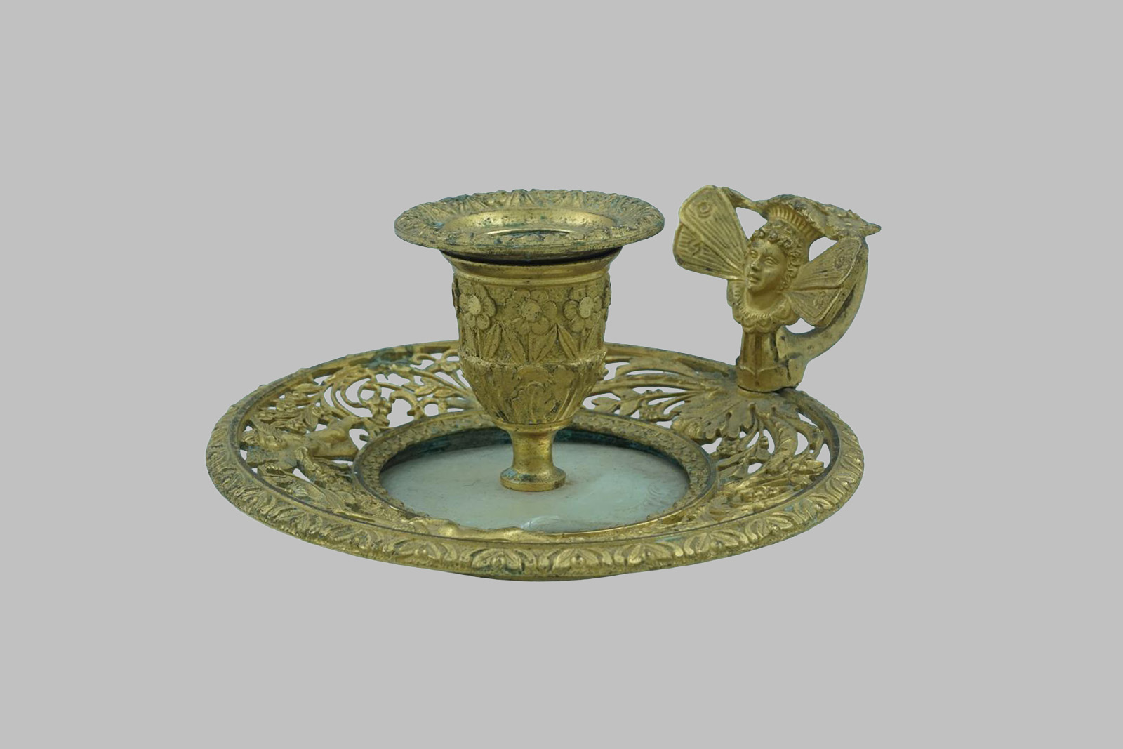 Palmatoria Imperio redonda de bronce labrado dorado con oro fino y nácar. Con bonita pátina natural y asa en forma de cabeza.   (Deteriorada)