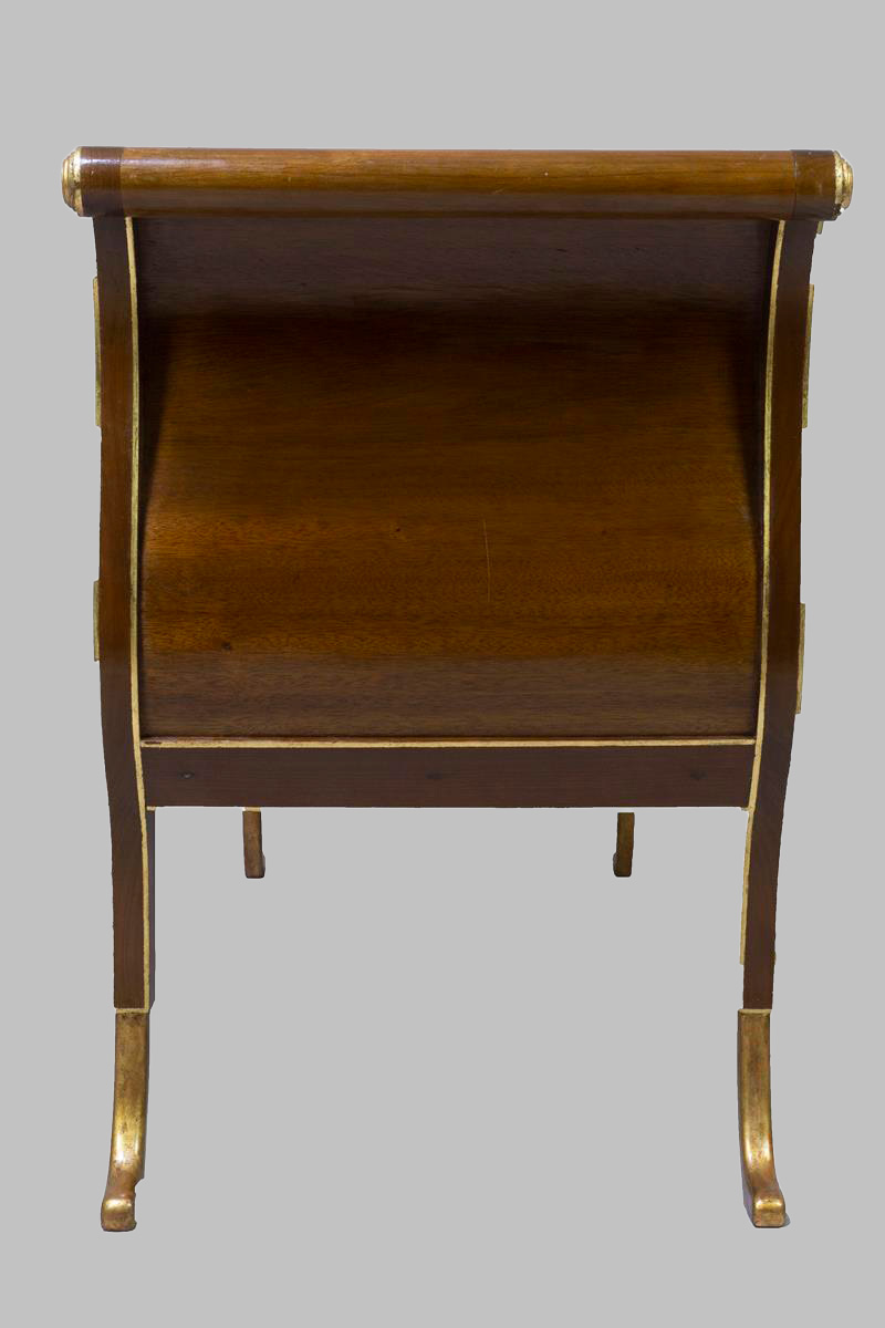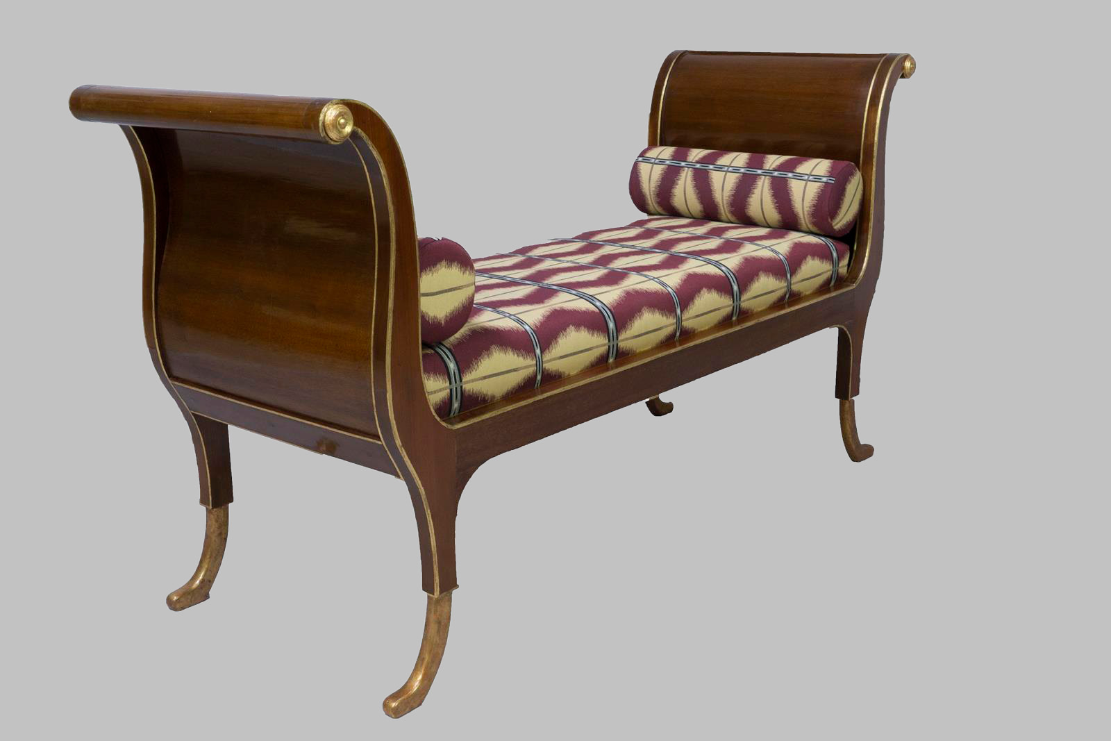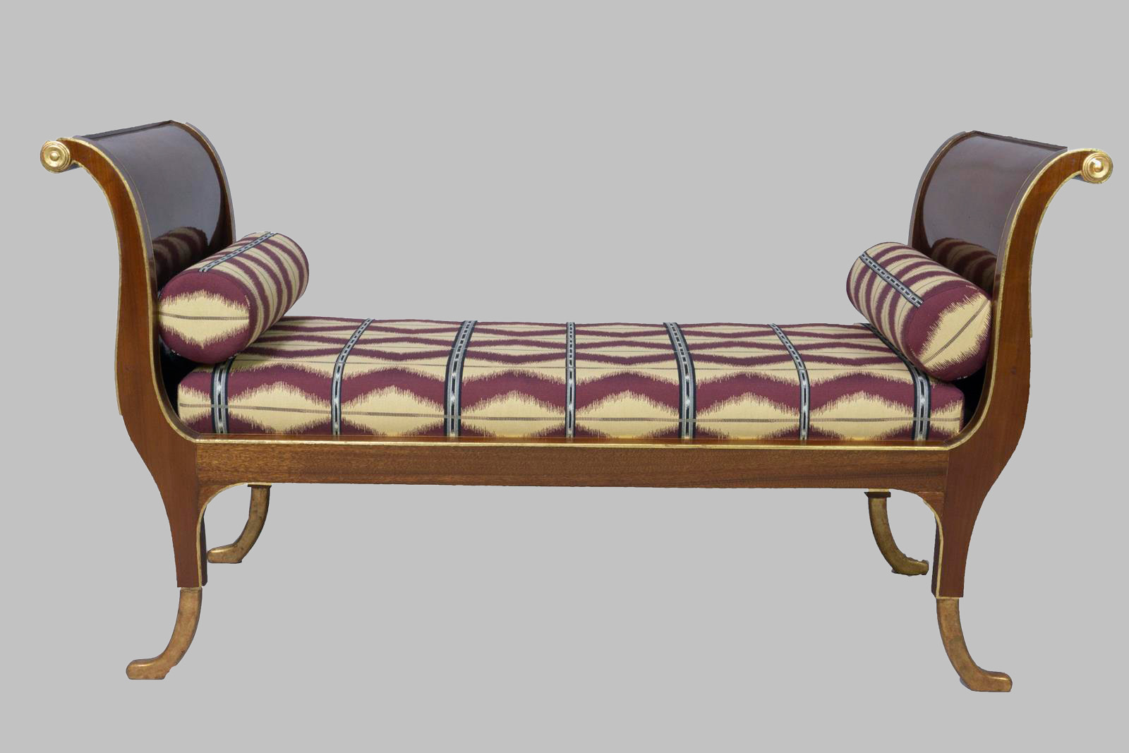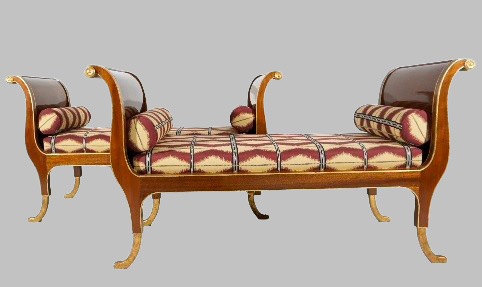Pareja de Sofás Imperio, con filetes, adornos y patas dorados en oro fino y asiento con dos cojines tapizado en color vainilla y burdeos con finas franjas en tonos gris y negro.