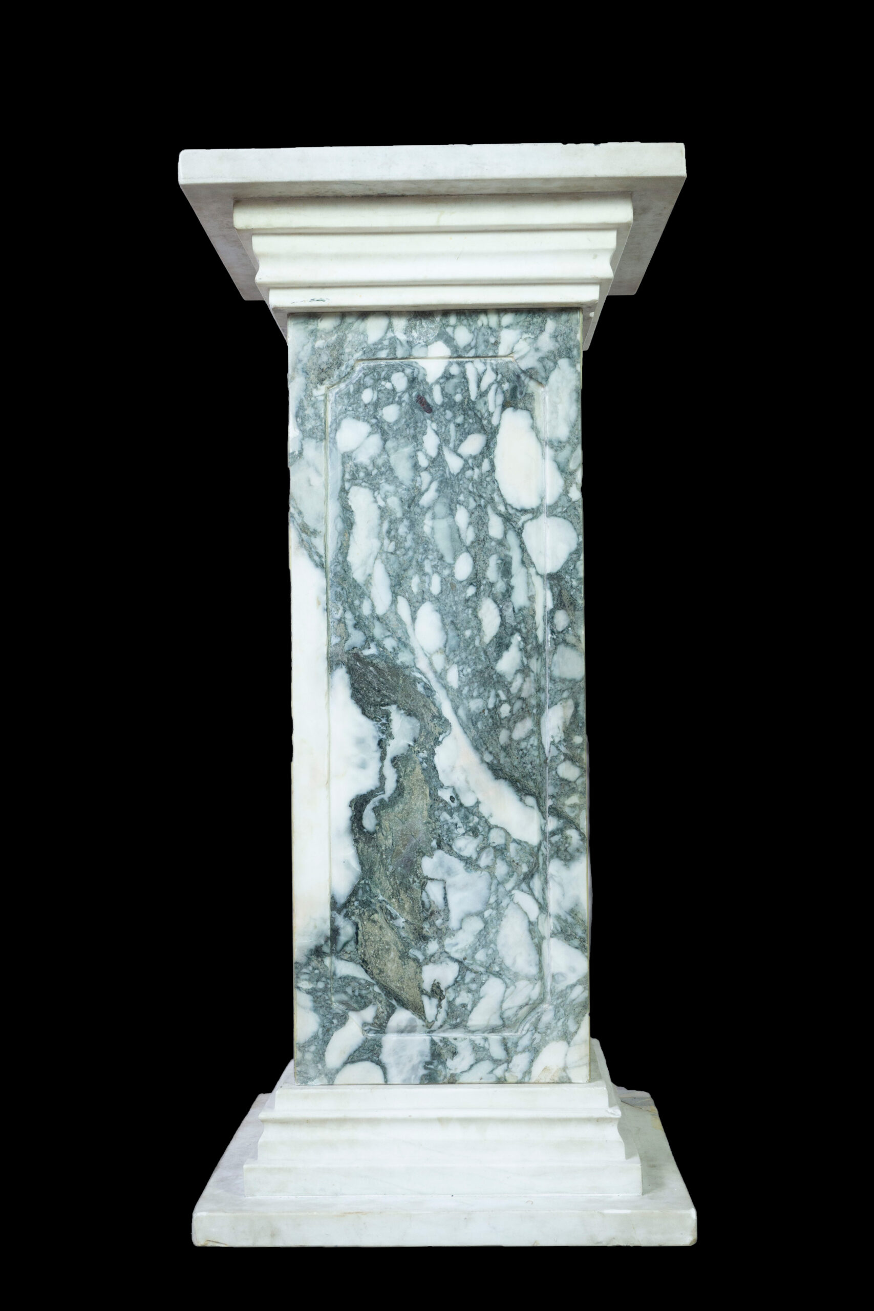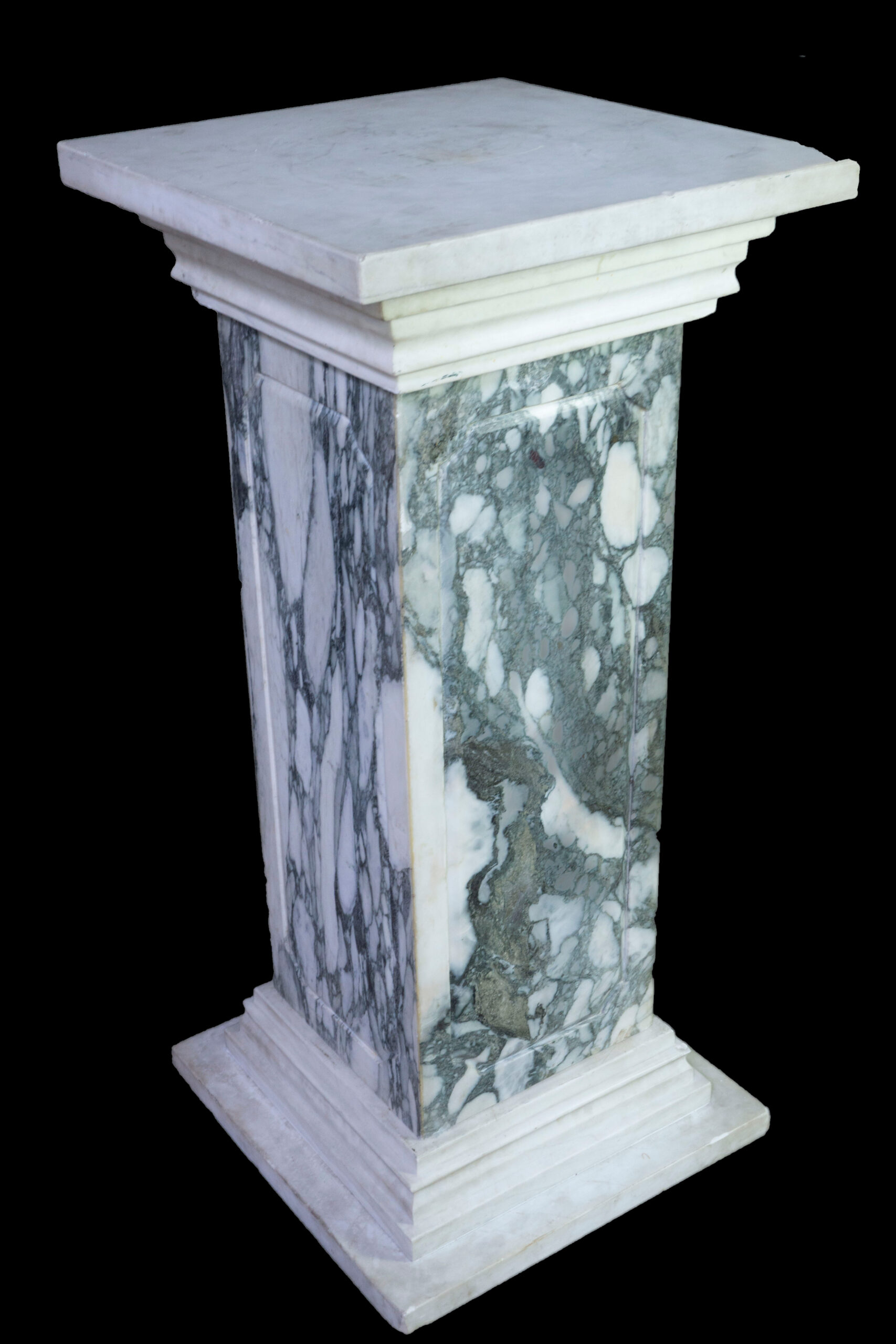 Pareja columnas cuadradas de mármol Arabescato (blanco con venas grises), con base y capitel blanco.