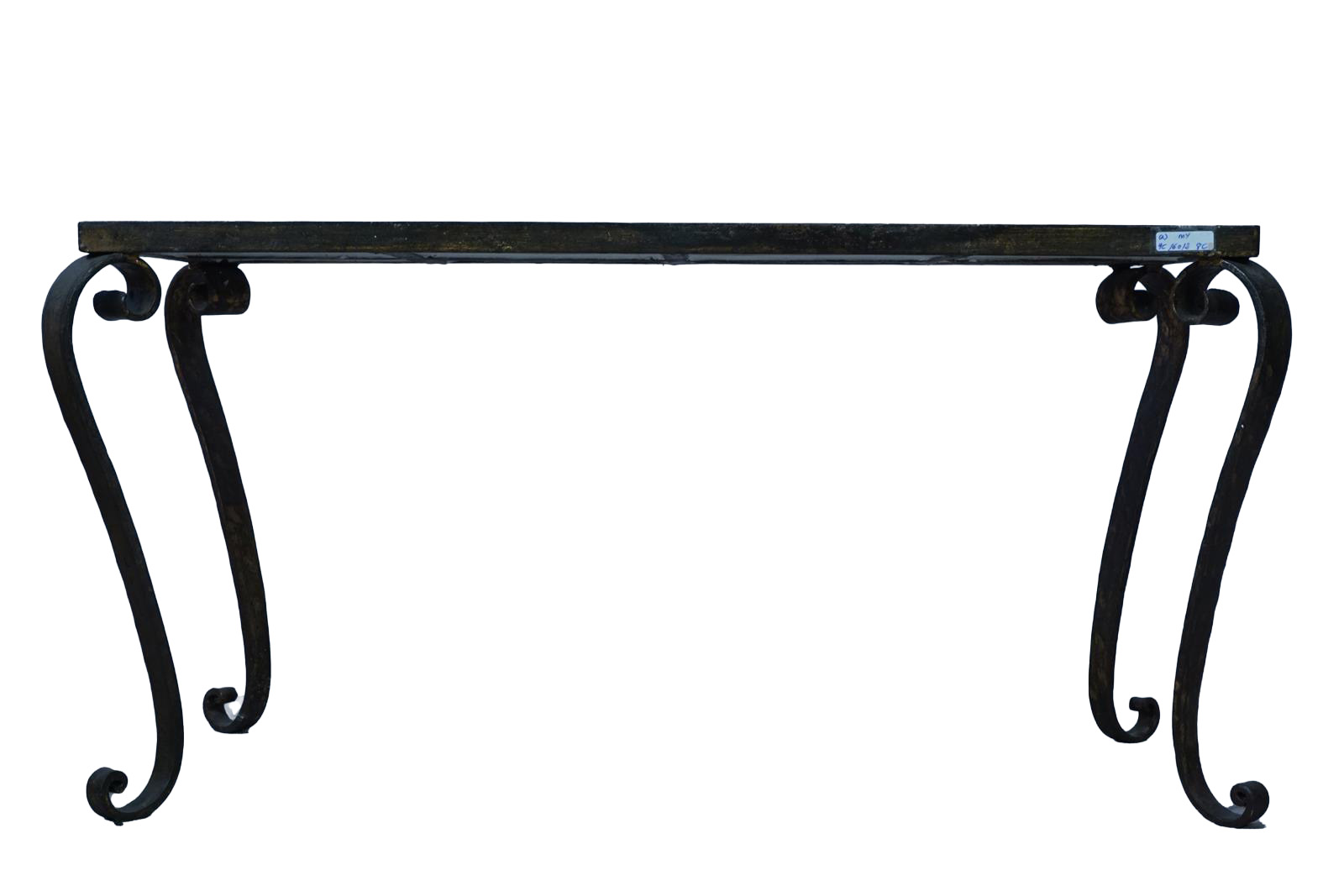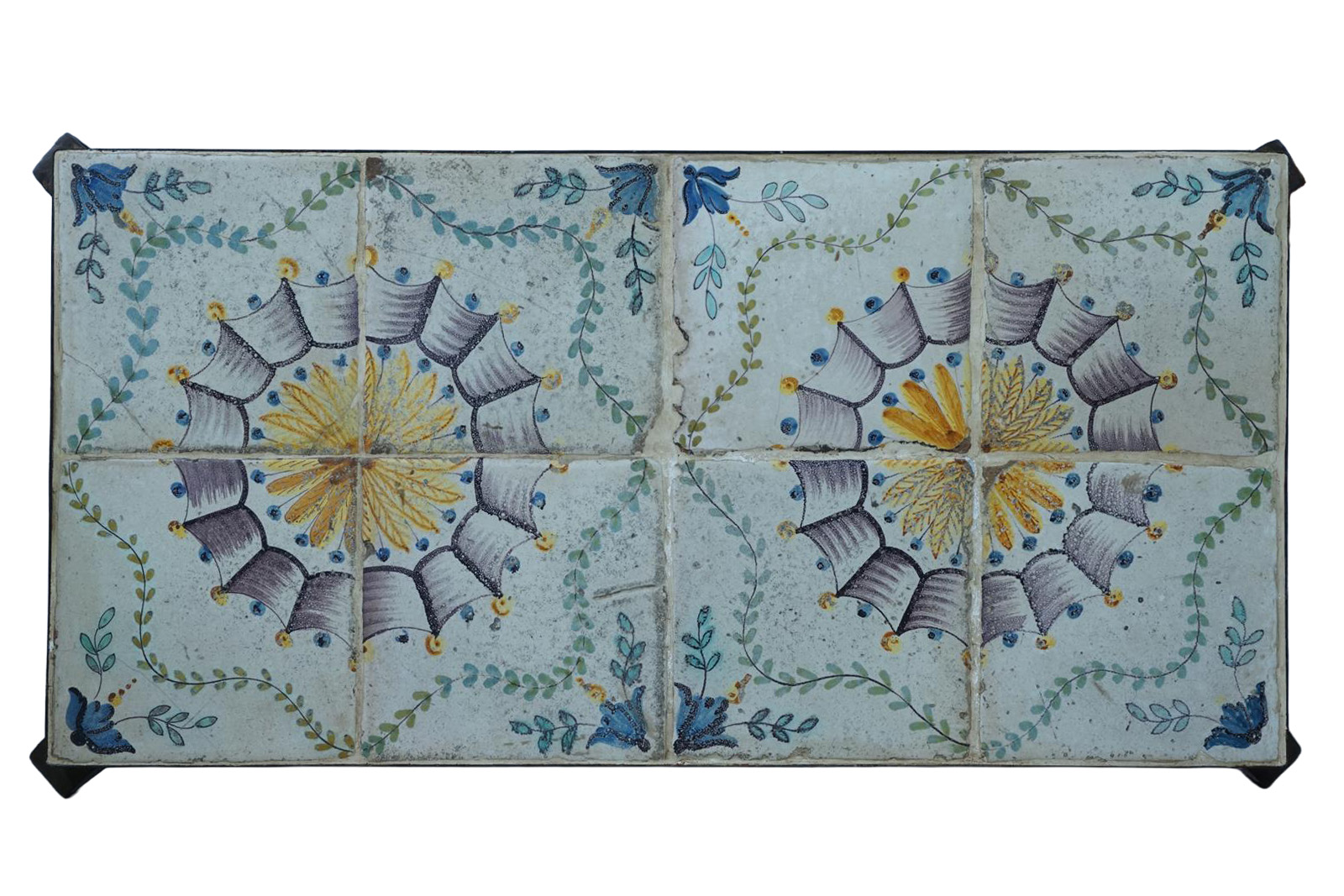 Pareja de mesas bajas hechas de hierro forjado y con la parte superior hecha de azulejos de cerámica «Ribesalbes», con una decoración floral dividida en ocho azulejos pintados a mano.