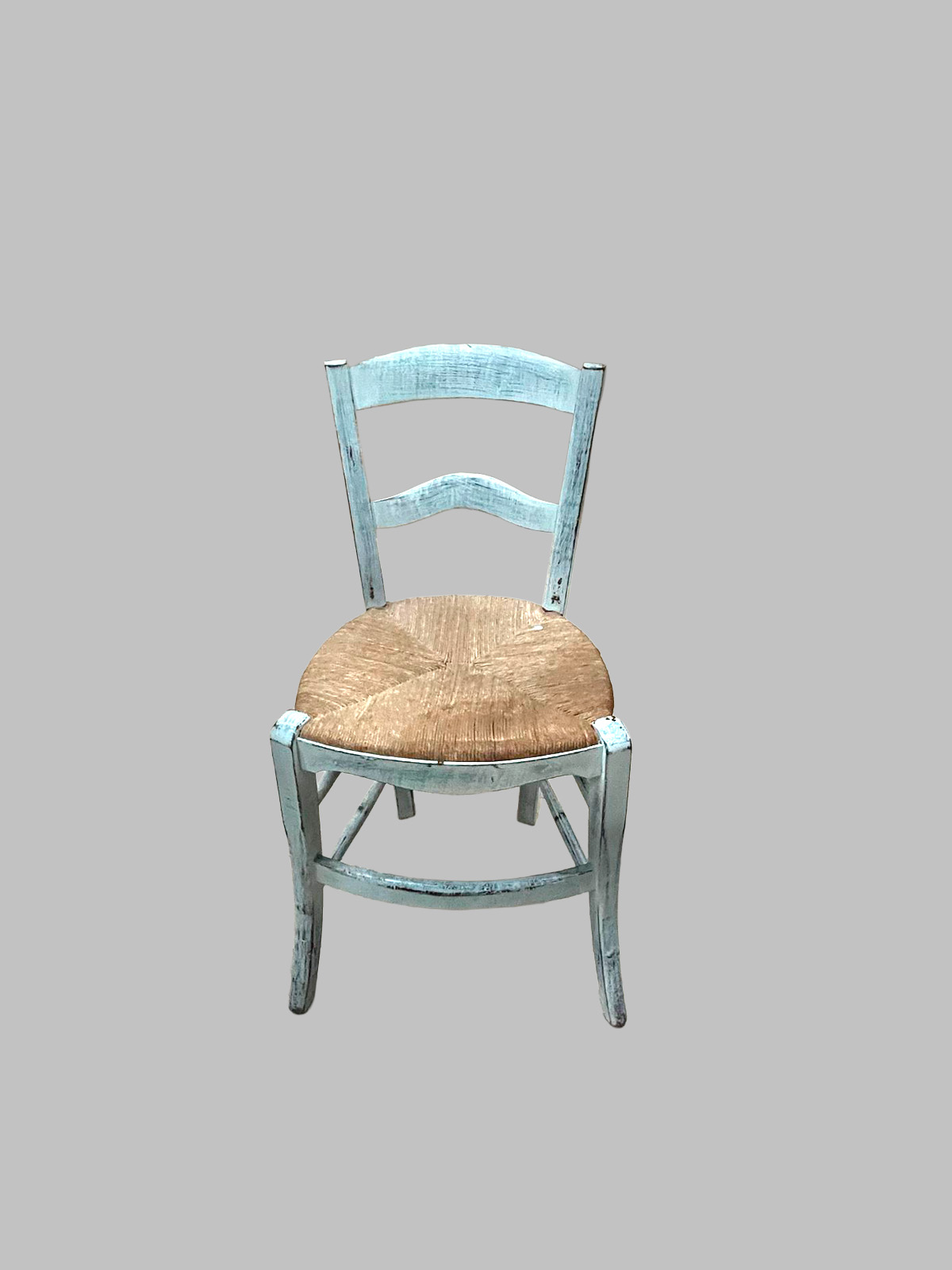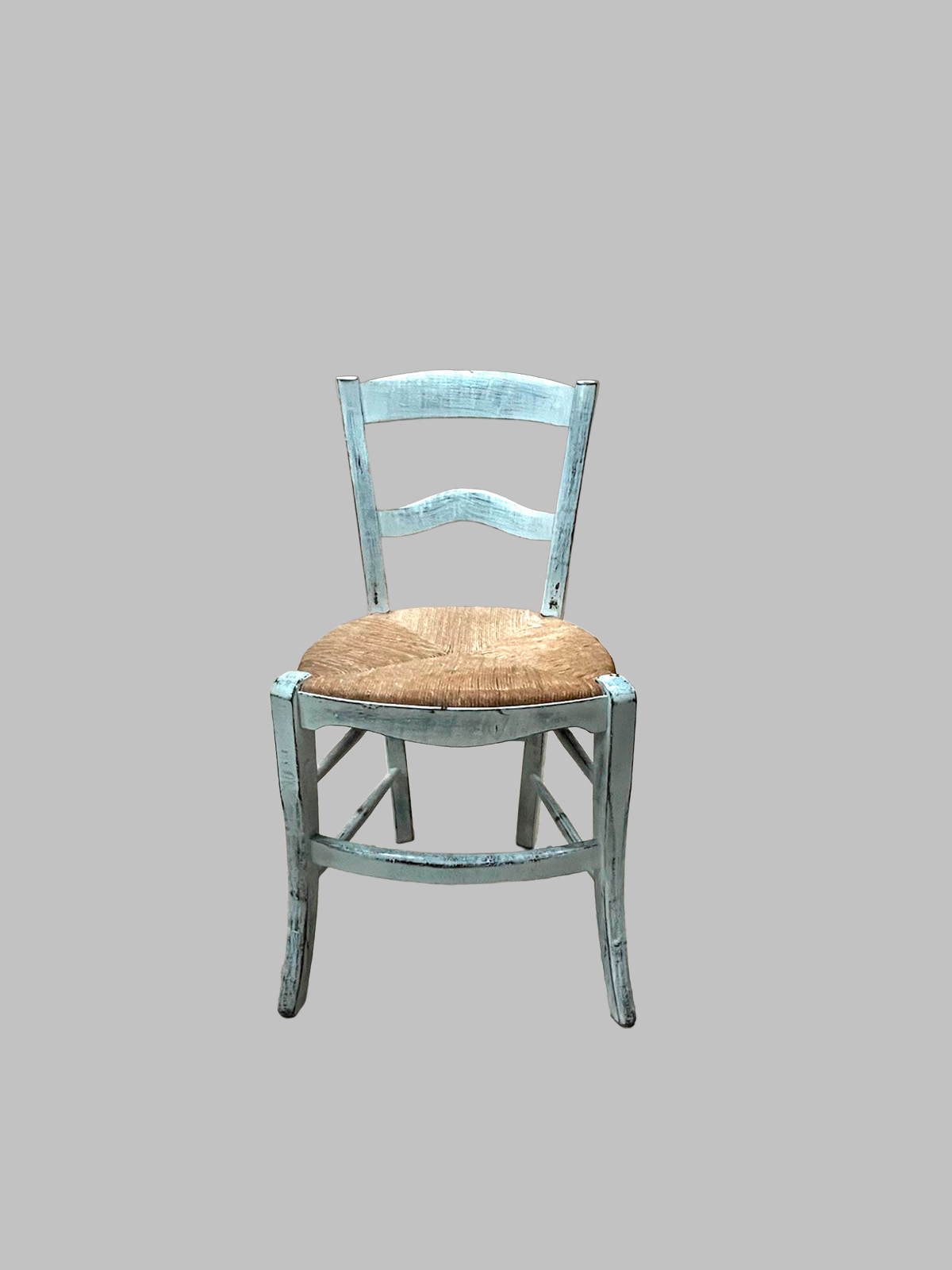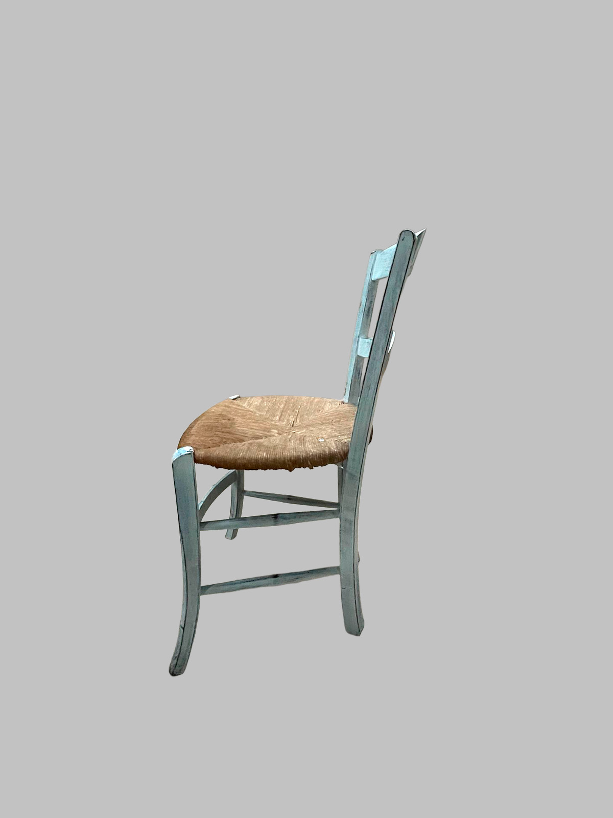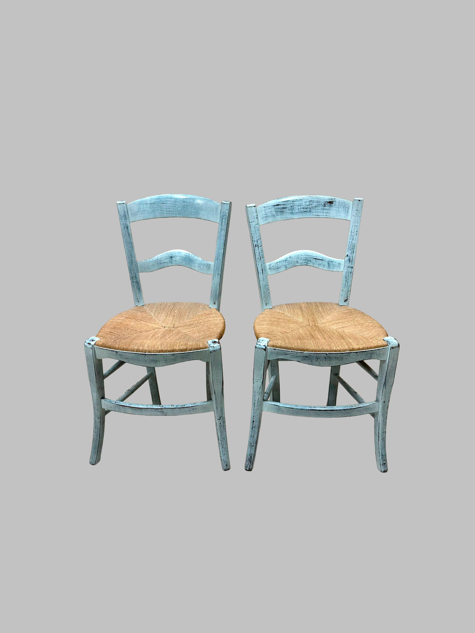 Pareja de sillas de estilo Imperio, realizadas en nogal macizo y decoradas con policromía en azul claro, datadas alrededor del año 1800, que destacan por su equilibrio, sobriedad y refinamiento neoclásico.