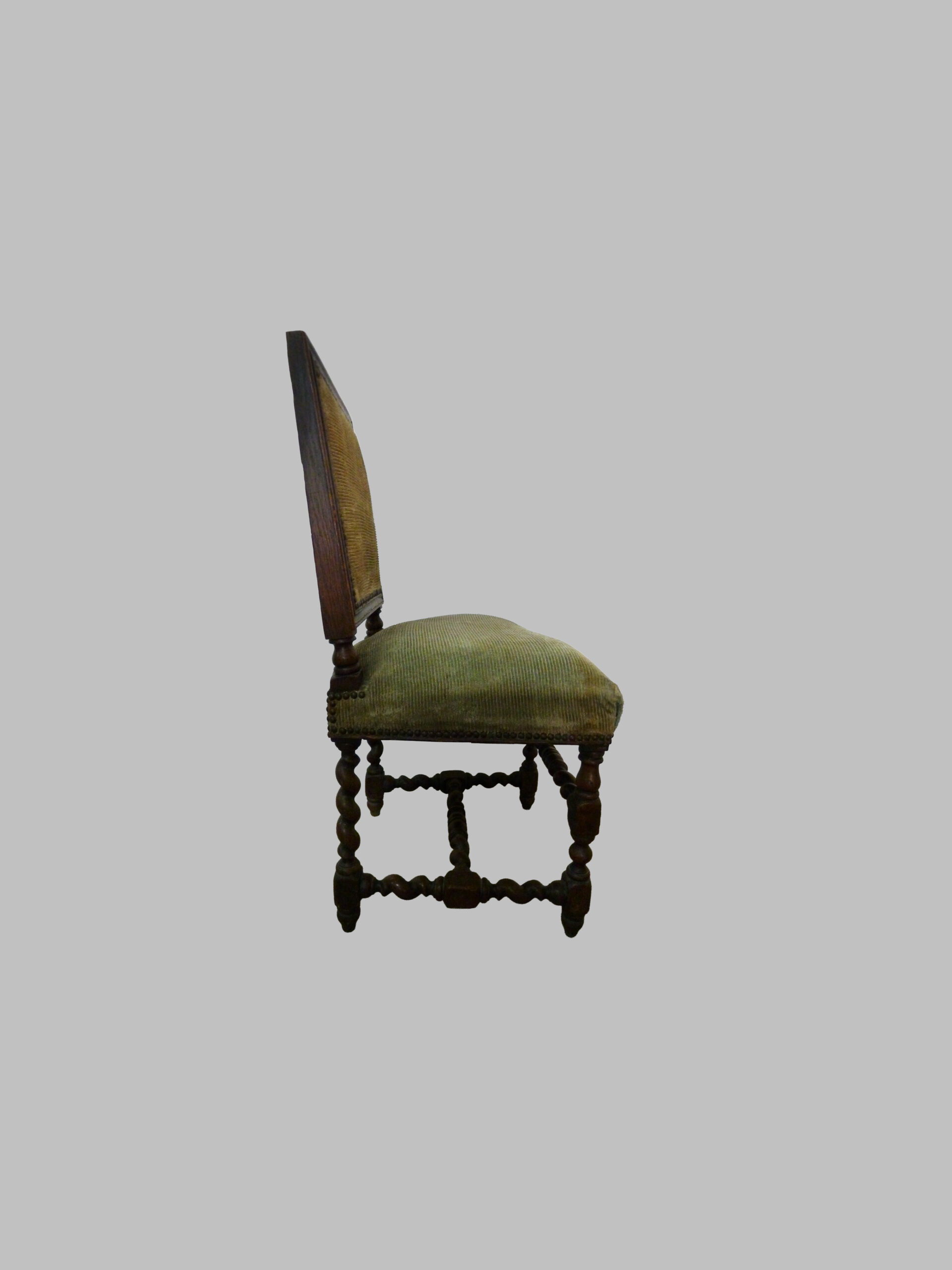 Estas sillas destacan por sus pies torneados en espiral o salomónicos, un detalle decorativo distintivo que aporta dinamismo, elegancia y carácter escultórico a la estructura. La madera de nogal, noble y resistente, ofrece durabilidad, una cálida tonalidad natural y belleza de veta, realzando la calidad artesanal y el valor histórico de las piezas.