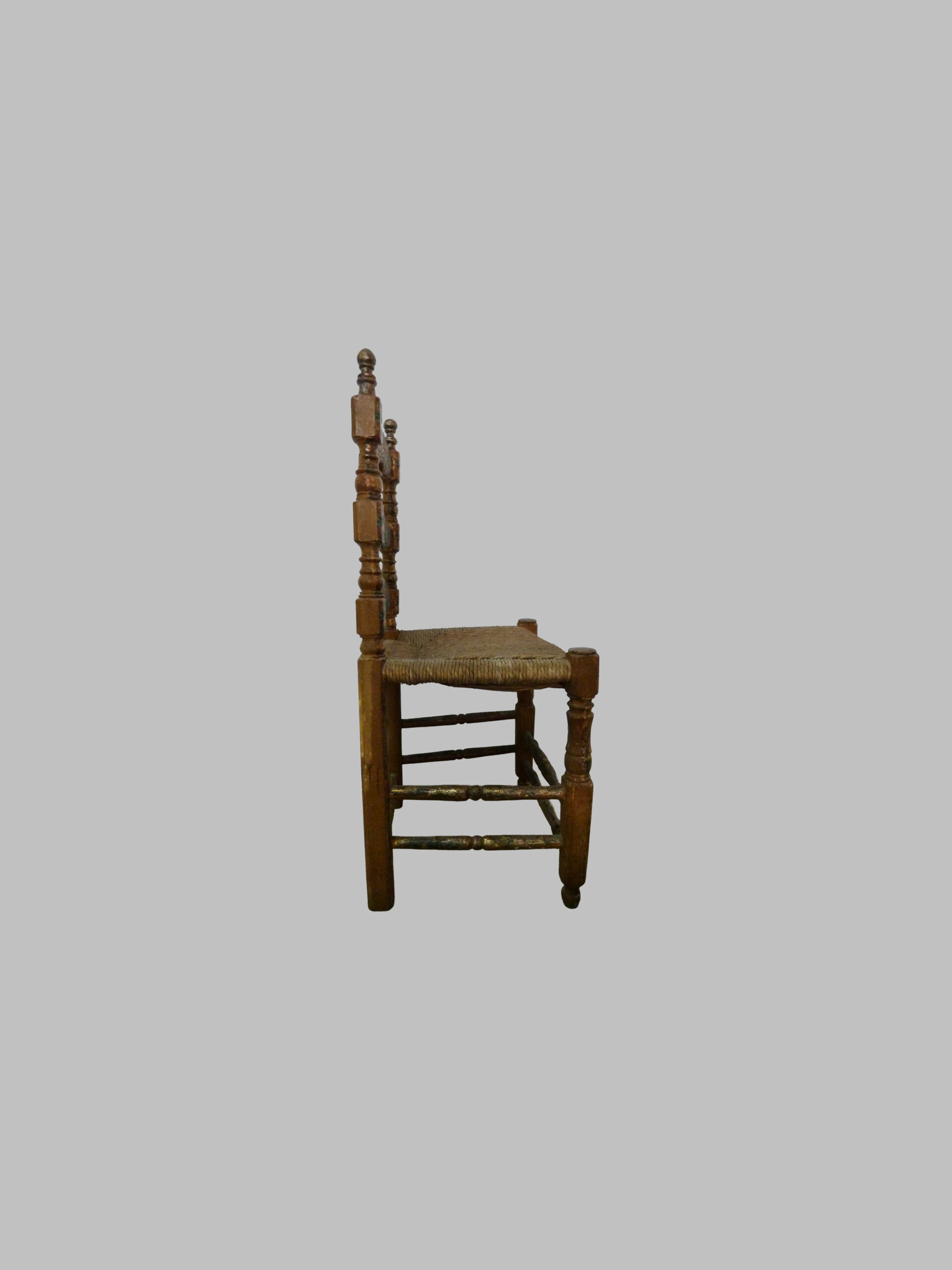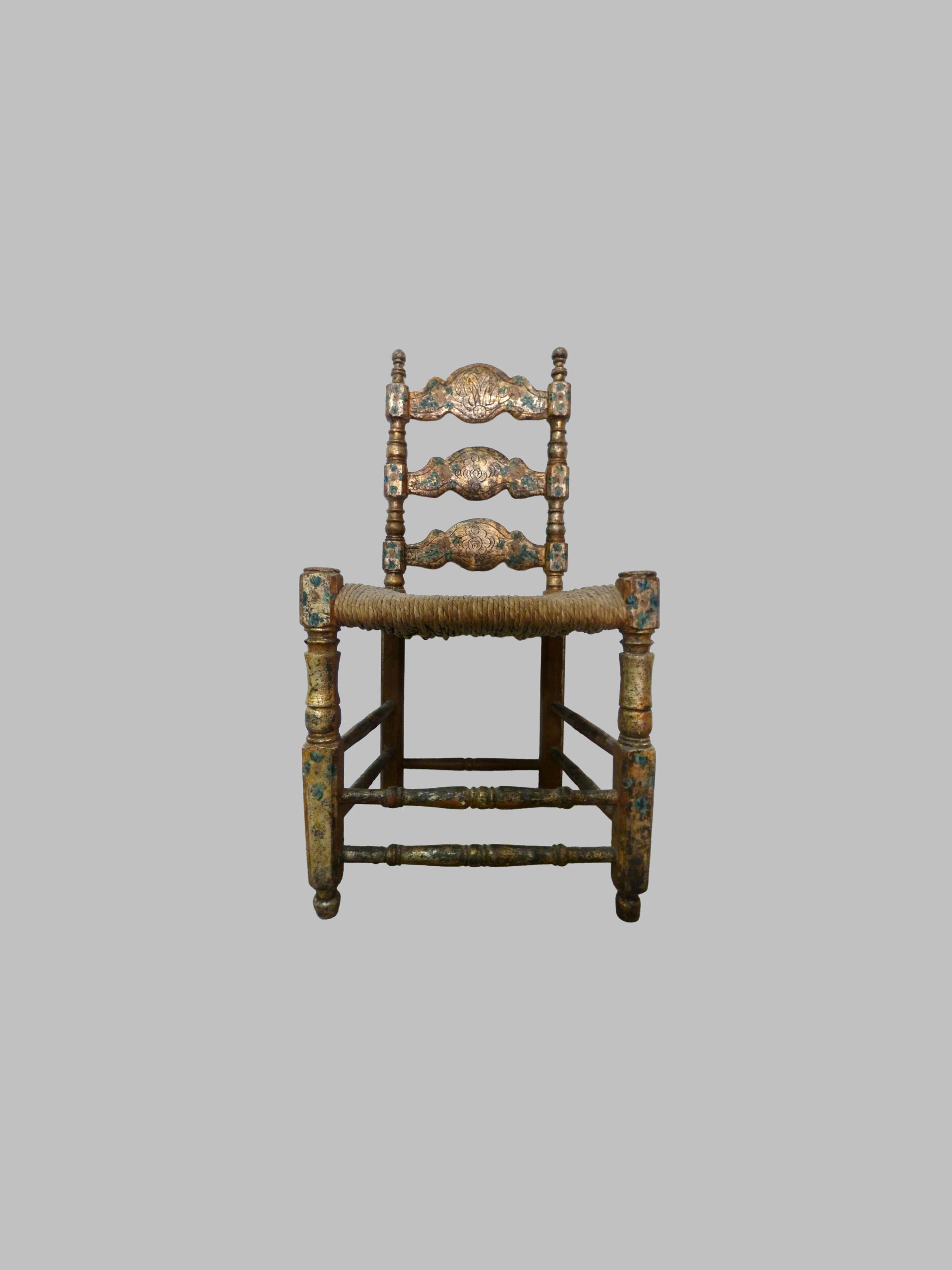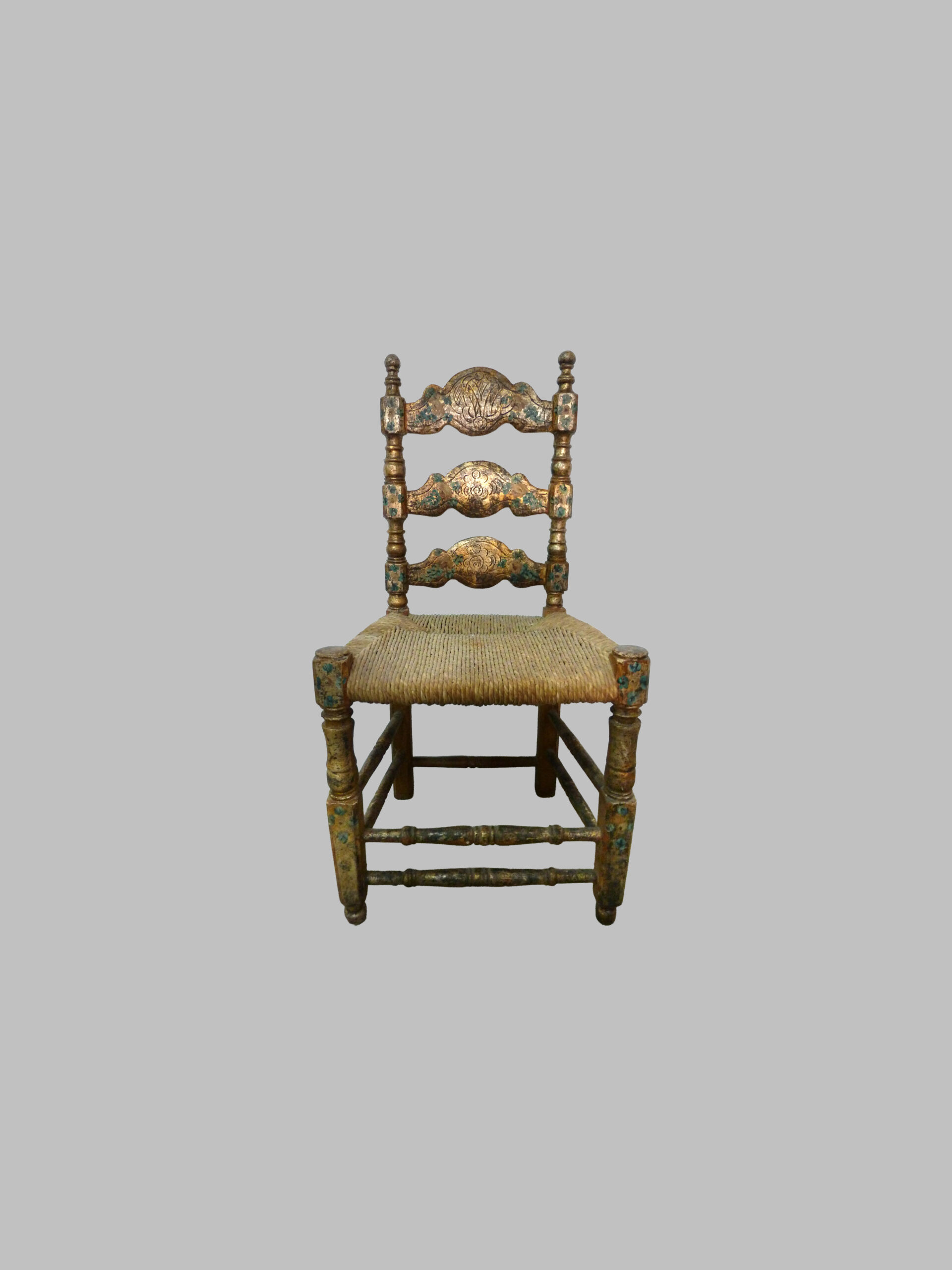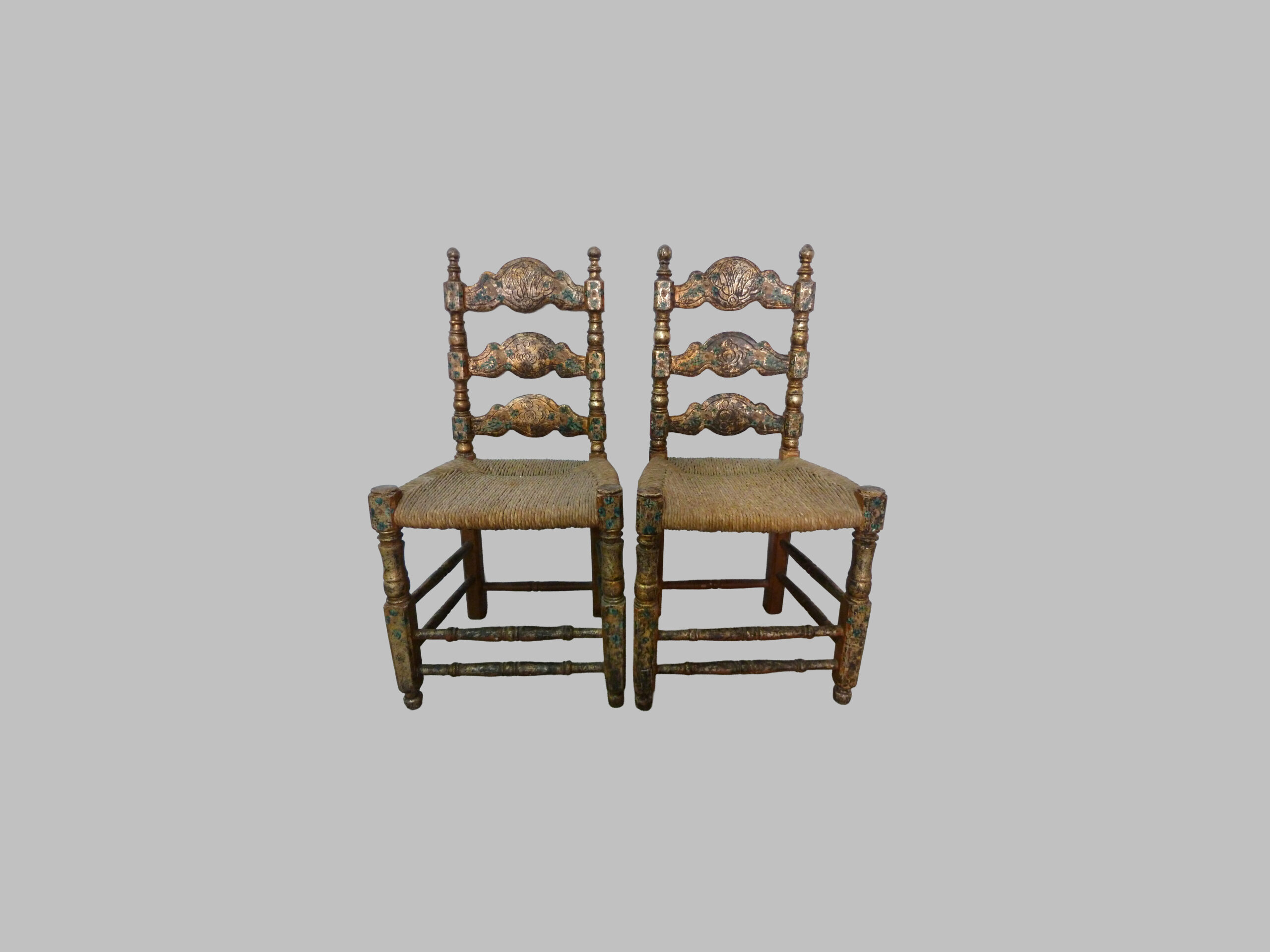 Pareja de sillas del siglo XVIII, con estructura policromada en plata y asiento de bova, que destacan por su elegancia decorativa y su carácter artesanal. Se trata de piezas con una presencia muy especial, capaces de aportar luminosidad, distinción y autenticidad a cualquier interior.
