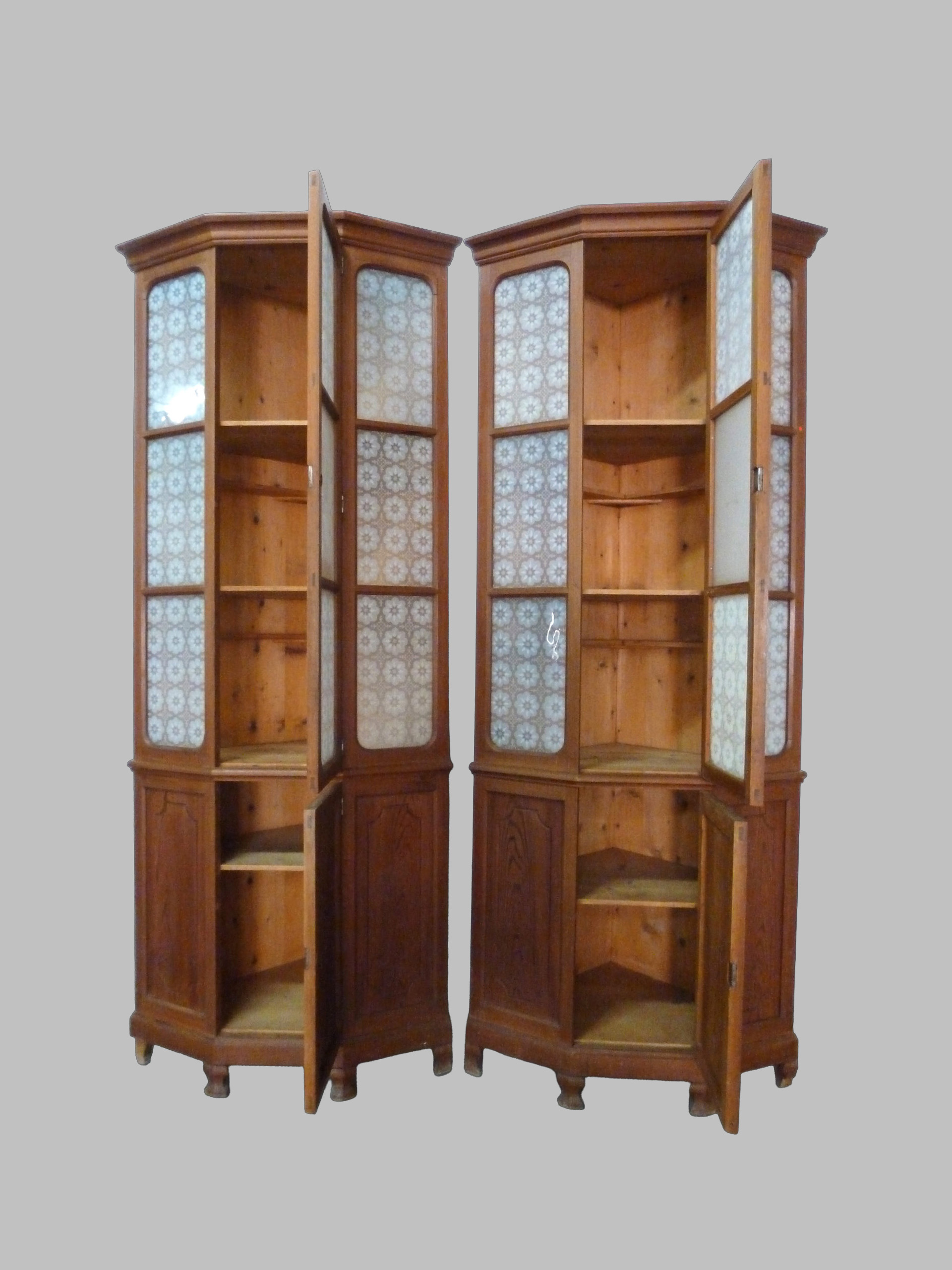Pareja de vitrinas rinconeras realizadas en madera de pino norte, datadas en el siglo XIX, piezas diseñadas para aprovechar los espacios de esquina aportando elegancia y funcionalidad al mismo tiempo.