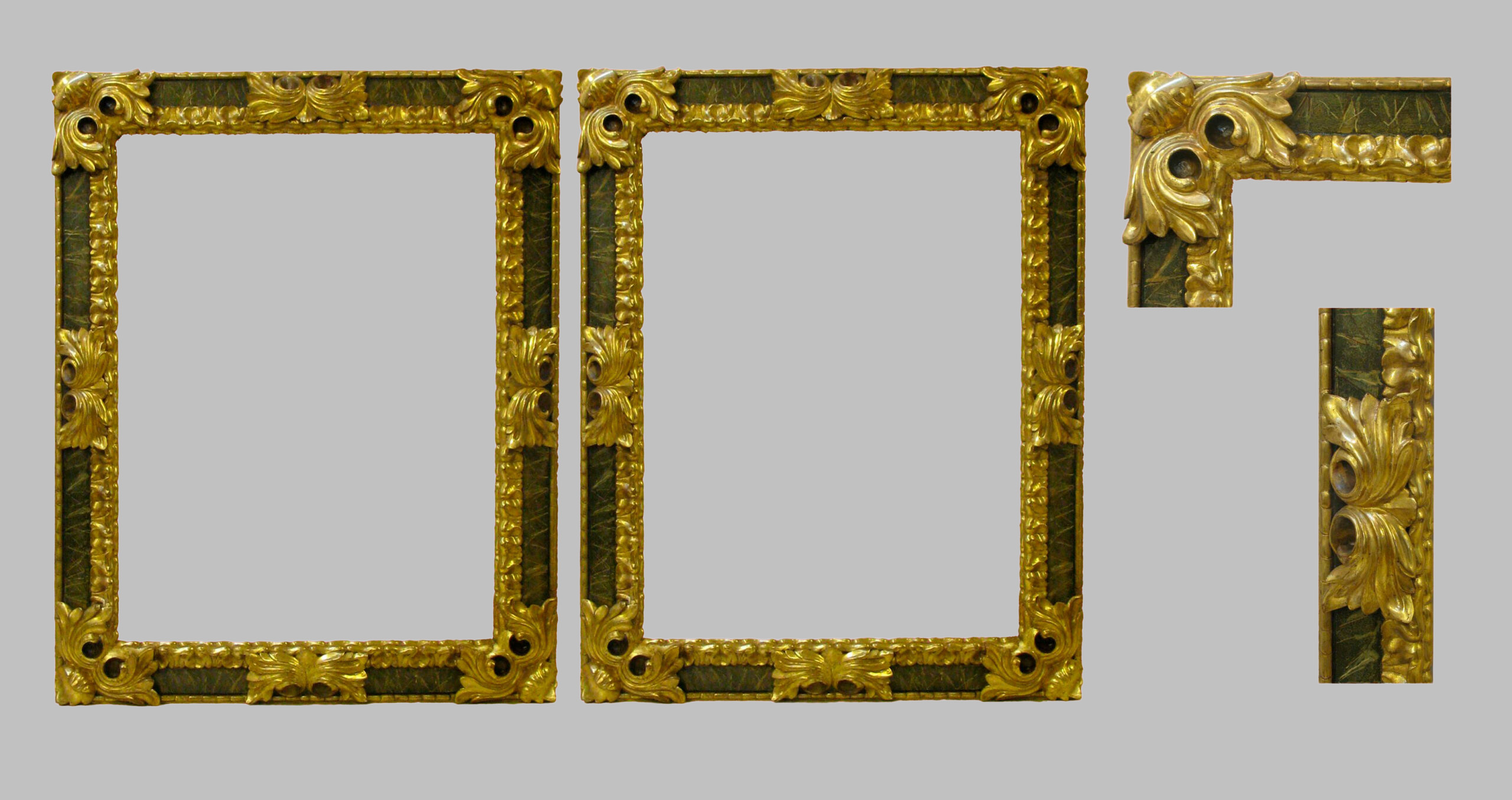 Pareja de Marcos Barrocos de talla dorada con oro fino y con fondo verde.  S. XIX