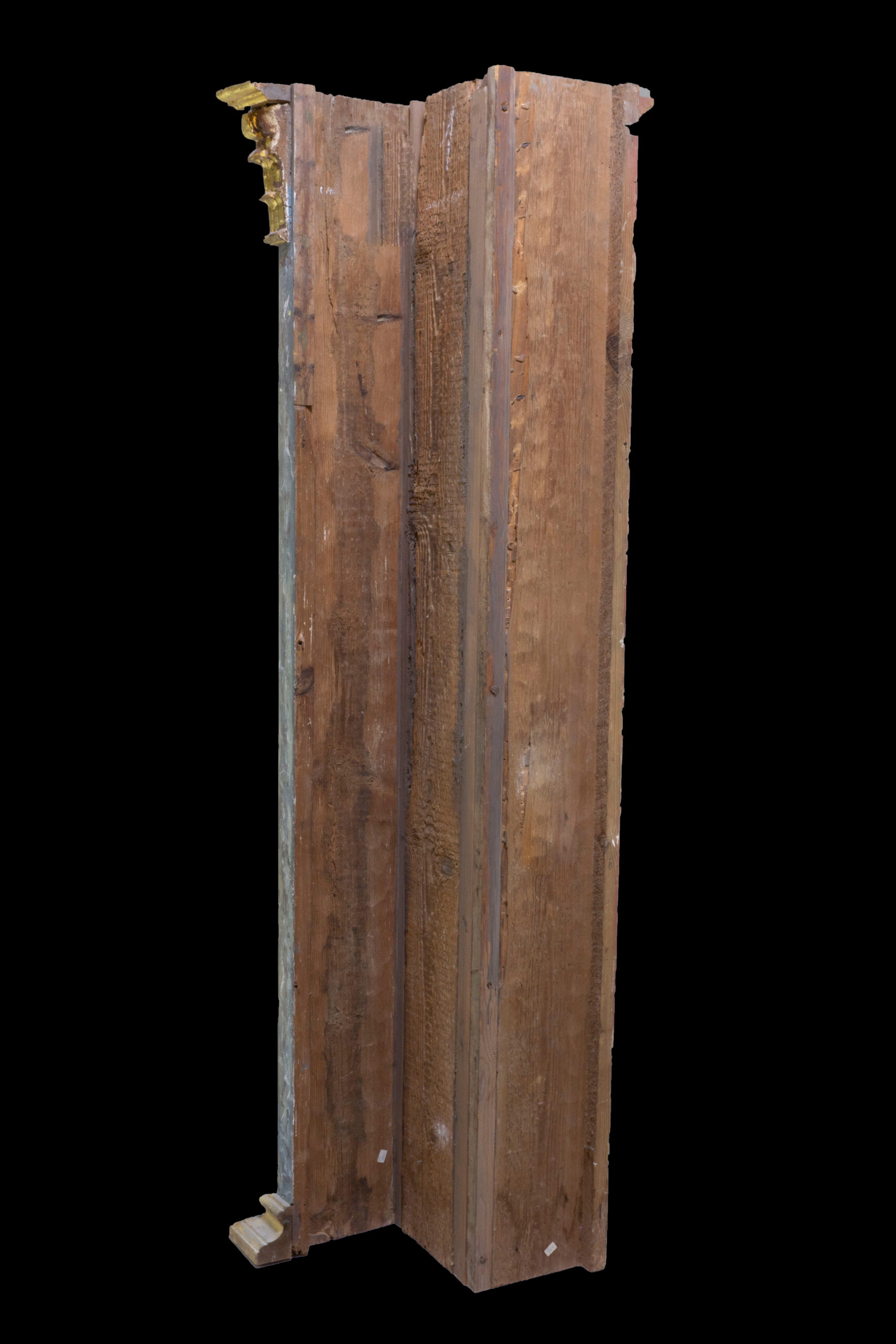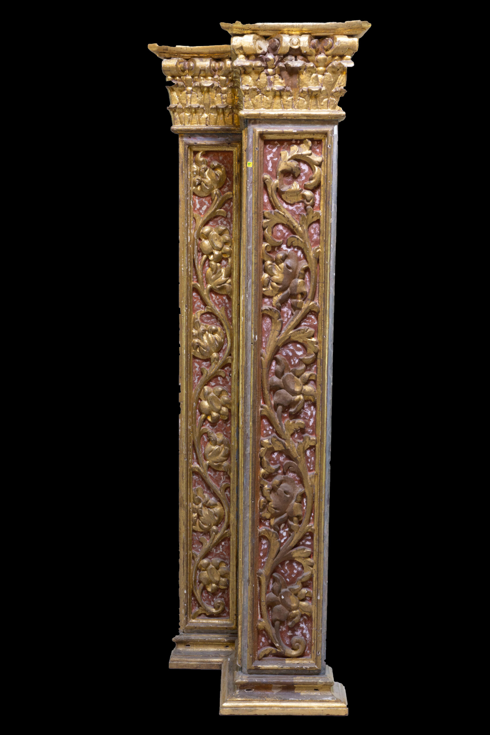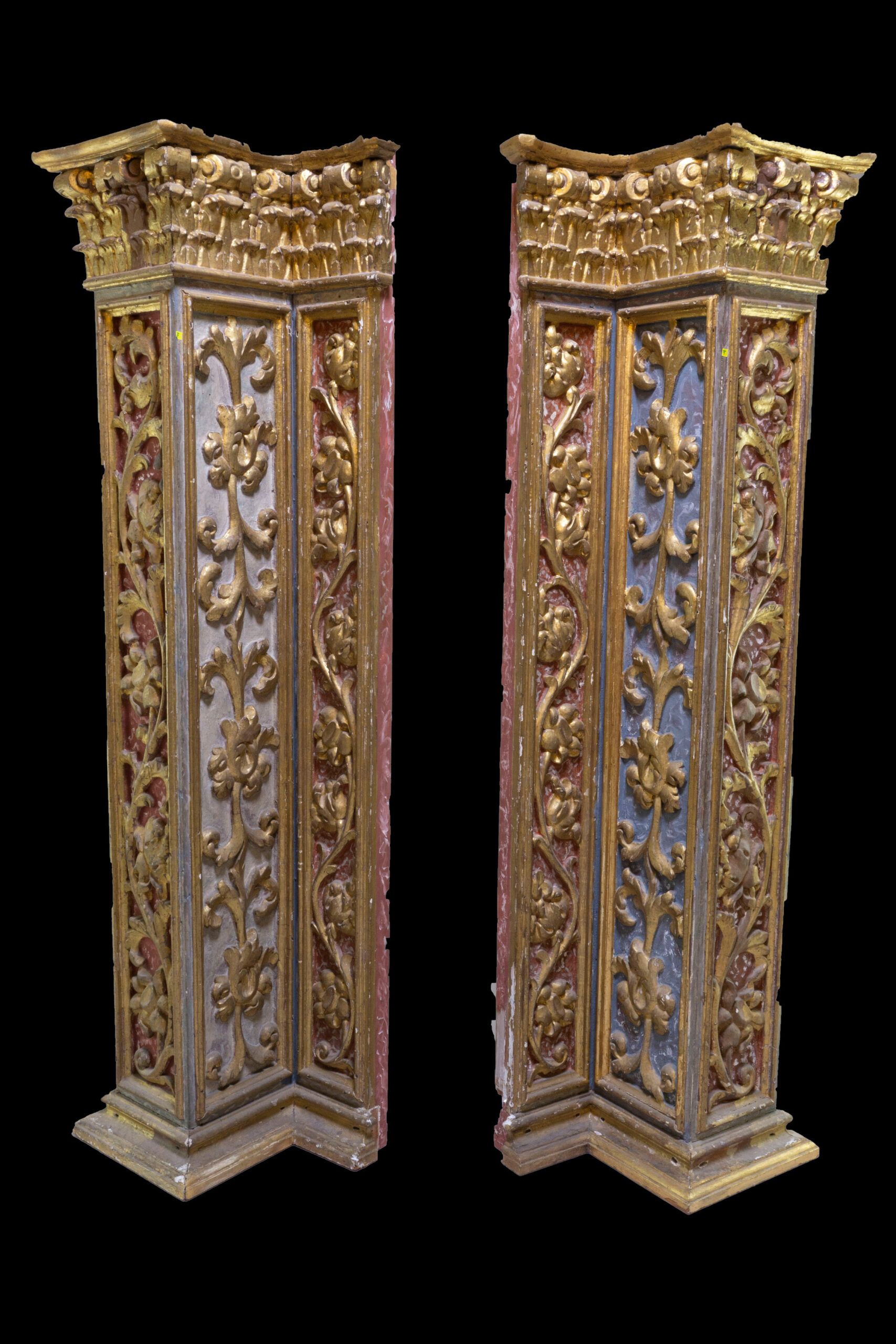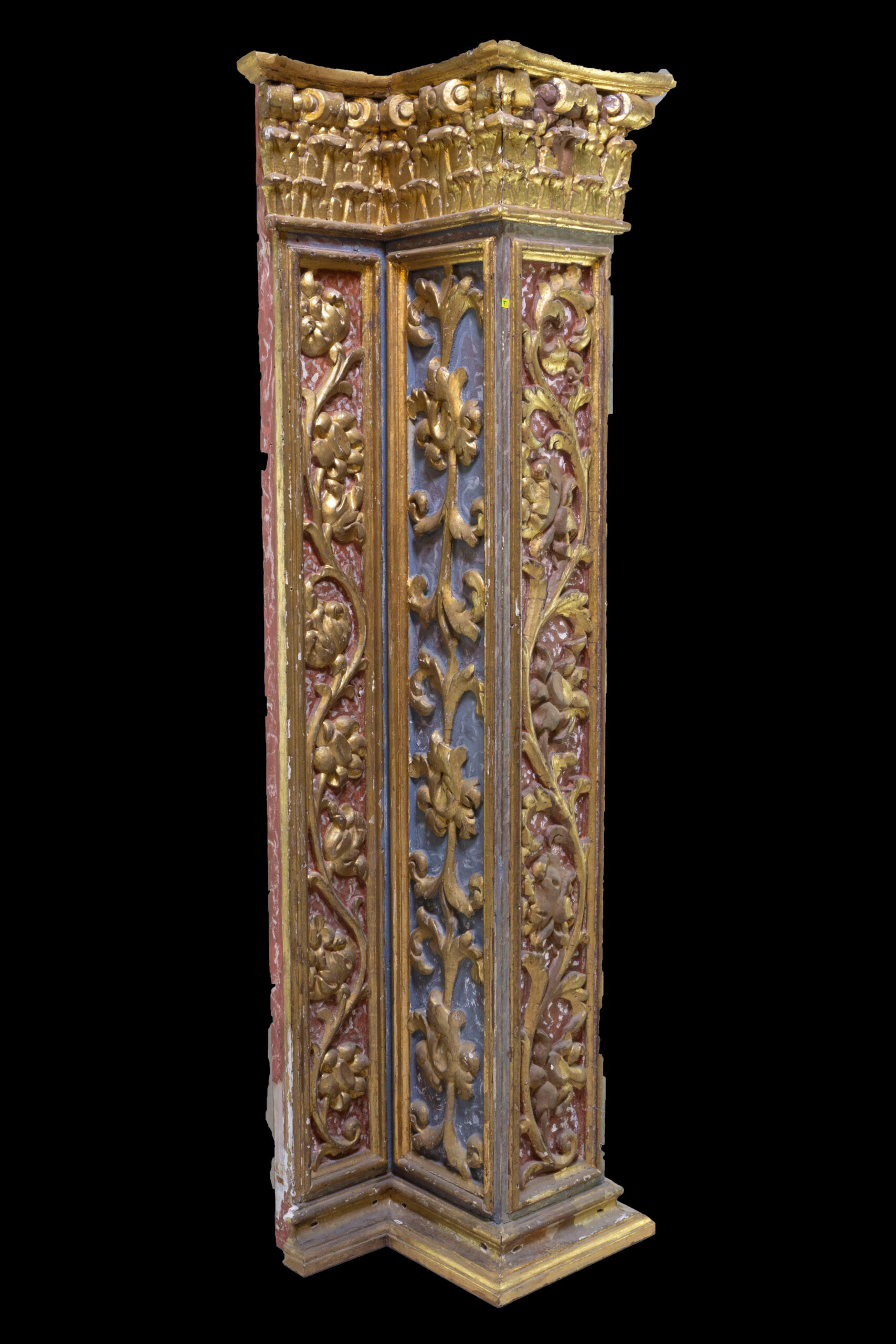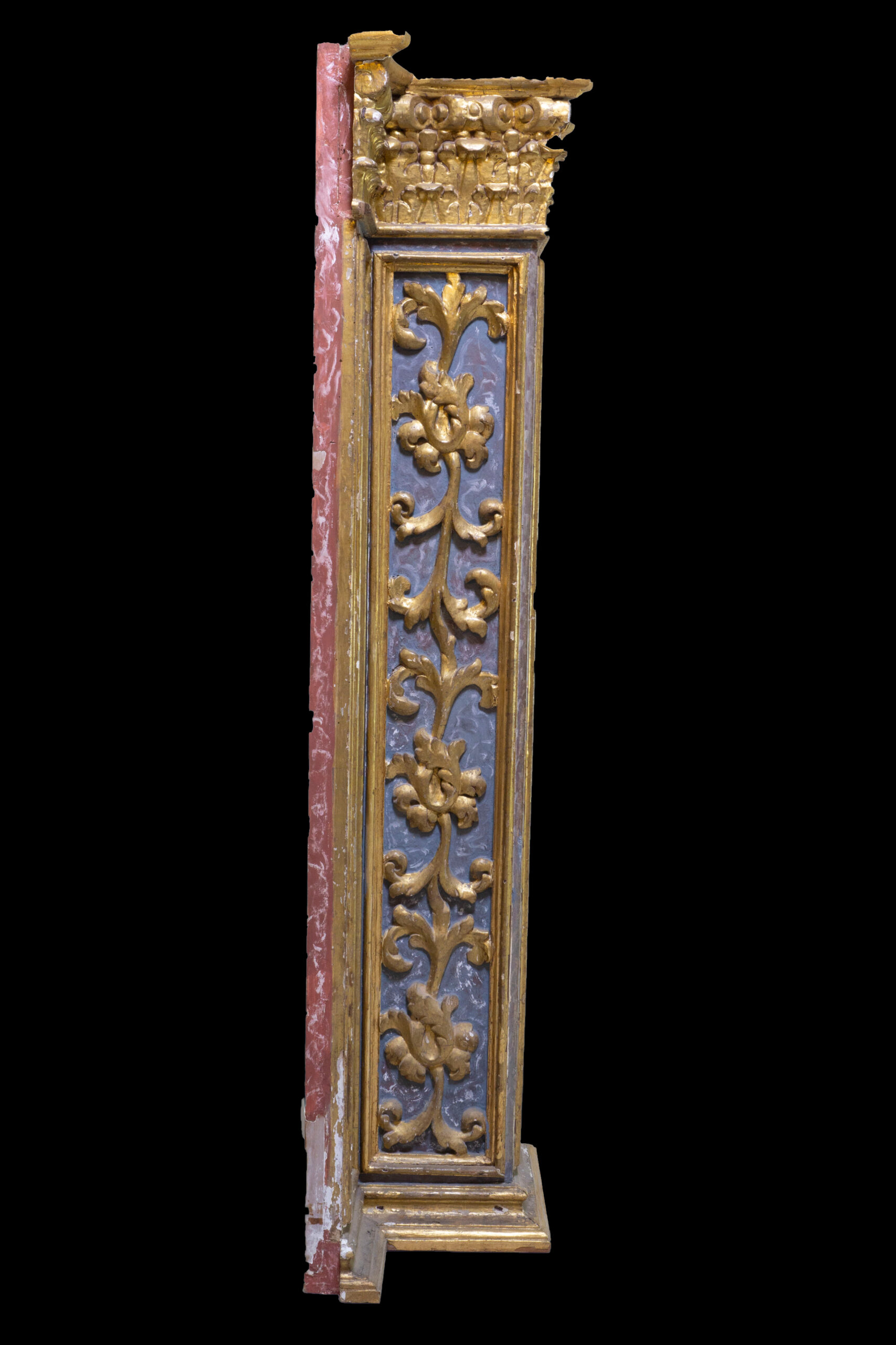 Pareja tallas policromadas, compuestas de tres columnas con sus capiteles, unidas en dos ángulos y en tonos azules, granates y dorados.