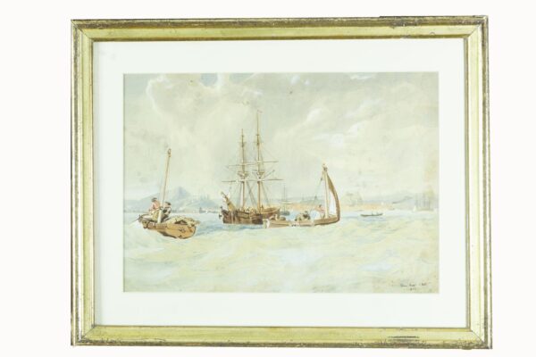 Pintura al Pastel de Van Der Elst: Marina con carabelas y barcas en primer plano y al fondo ciudad con montañas.