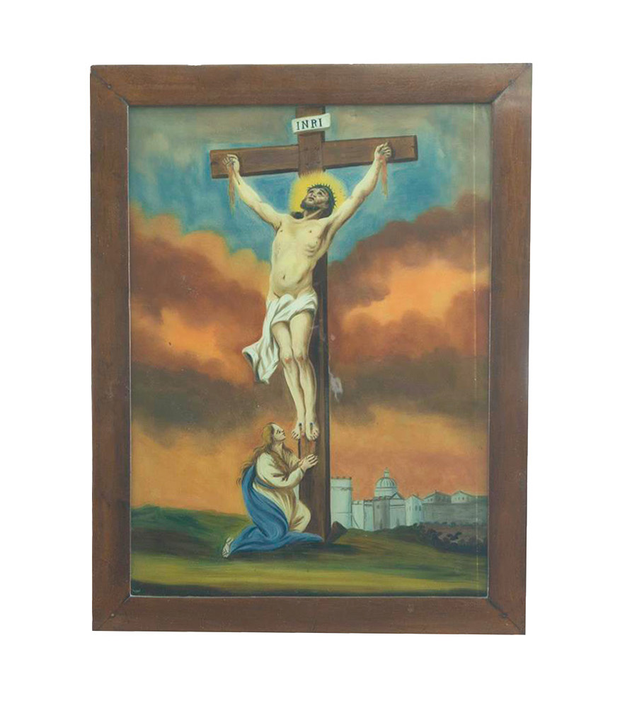 Elegante pintura sobre cristal del siglo XVIII que representa a Cristo en la Cruz, con la figura de una Santa a sus pies, en una composición de gran fuerza expresiva y refinada ejecución técnica.