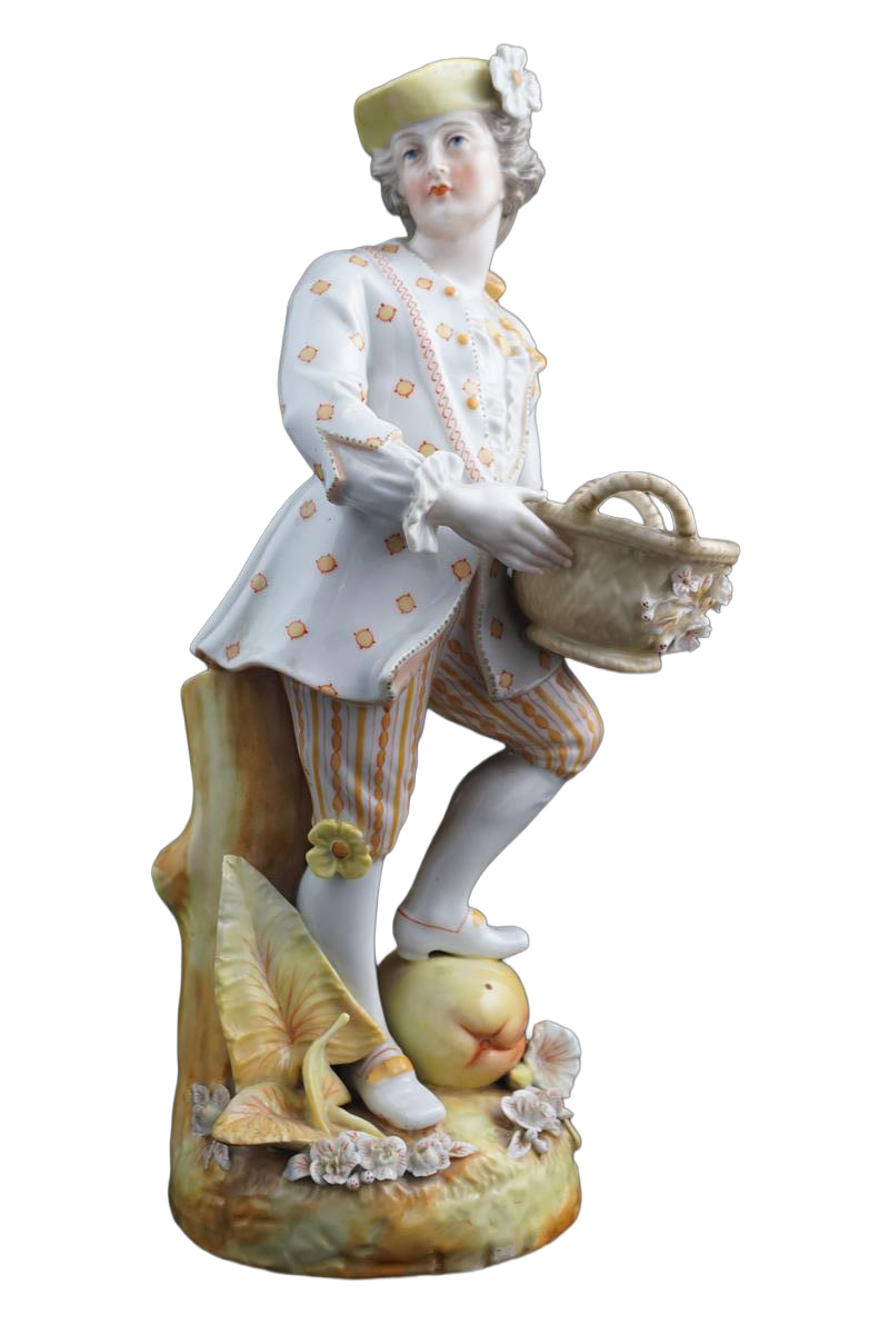 Saxony porcelain figurine: Man dressed in period clothing with striped baggy pants and a flower, a hat also with a flower and a white jacket with small rounded drawings, he is sitting on a log with one foot on a pumpkin and with a basket in his hands .