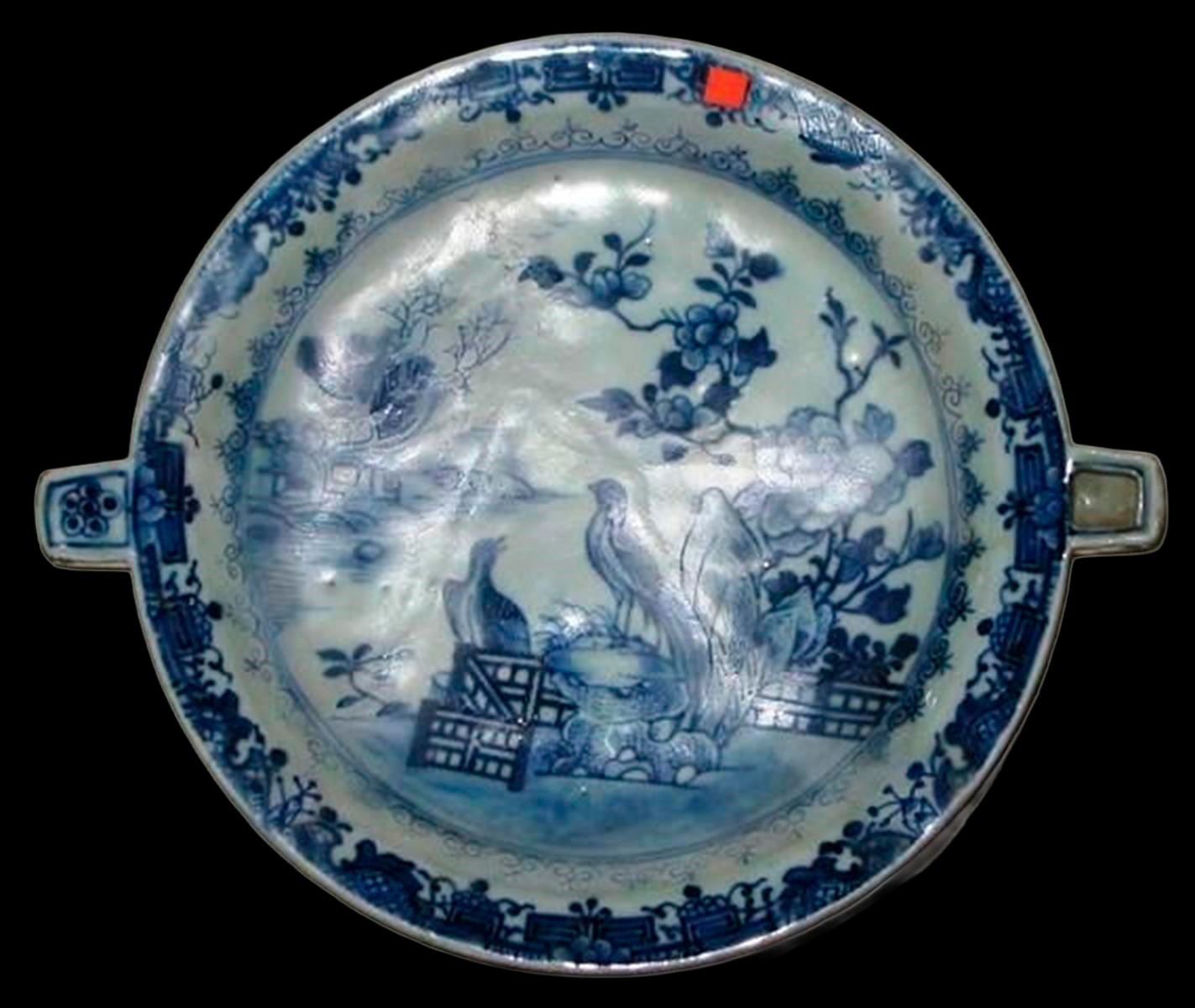 White and blue Canton porcelain plate, with a container in the lower part for hot water, decorated with oriental shrubs and birds.