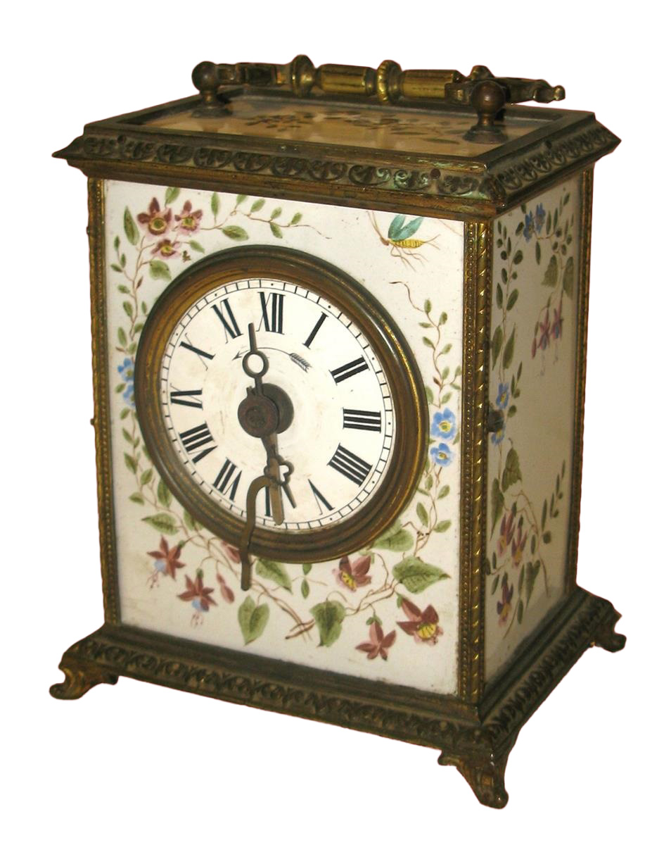 Reloj de carruaje francés de bronce con esmalte, decorado con motivos florales, esfera blanca y números romanos en negro.