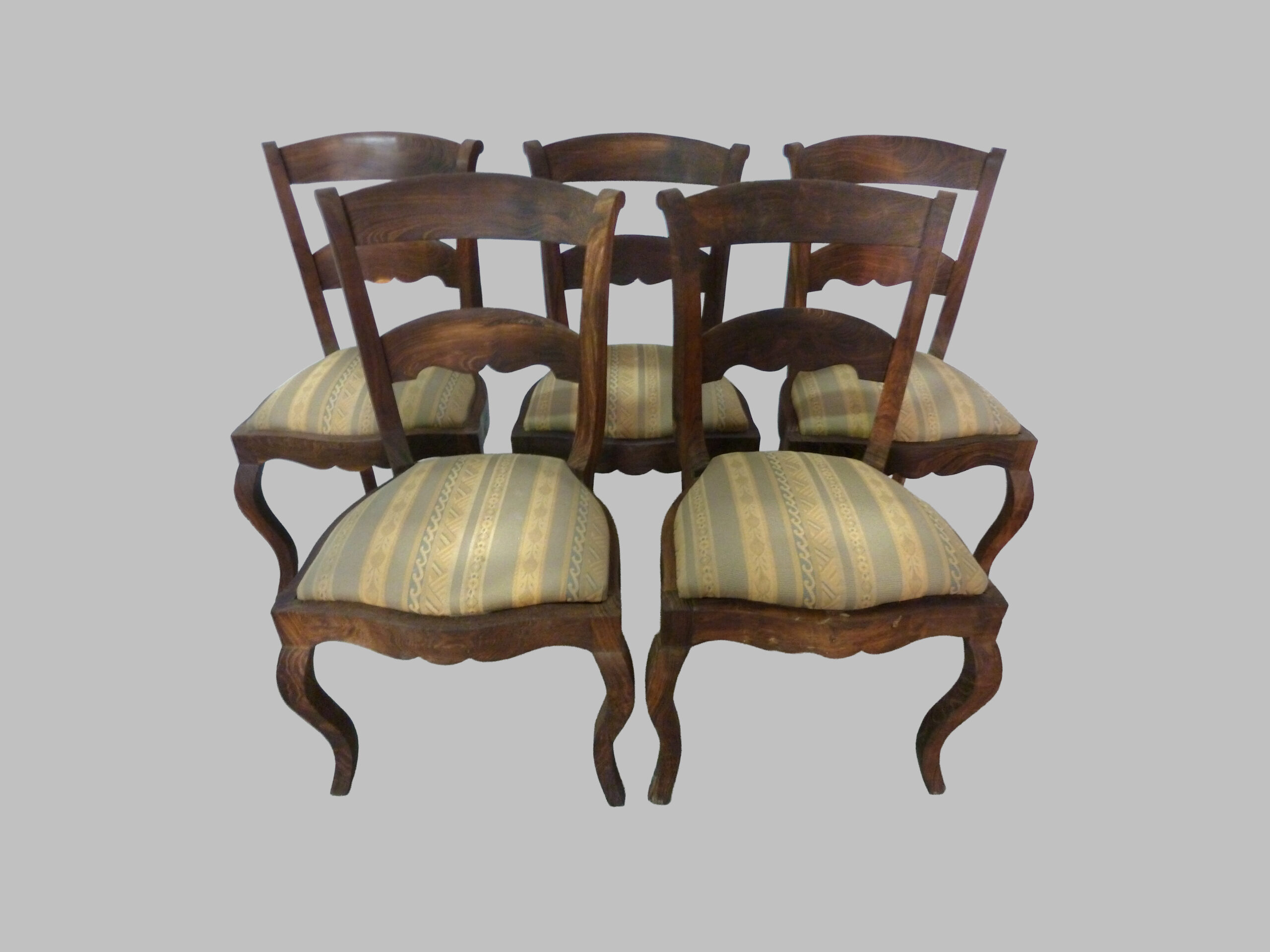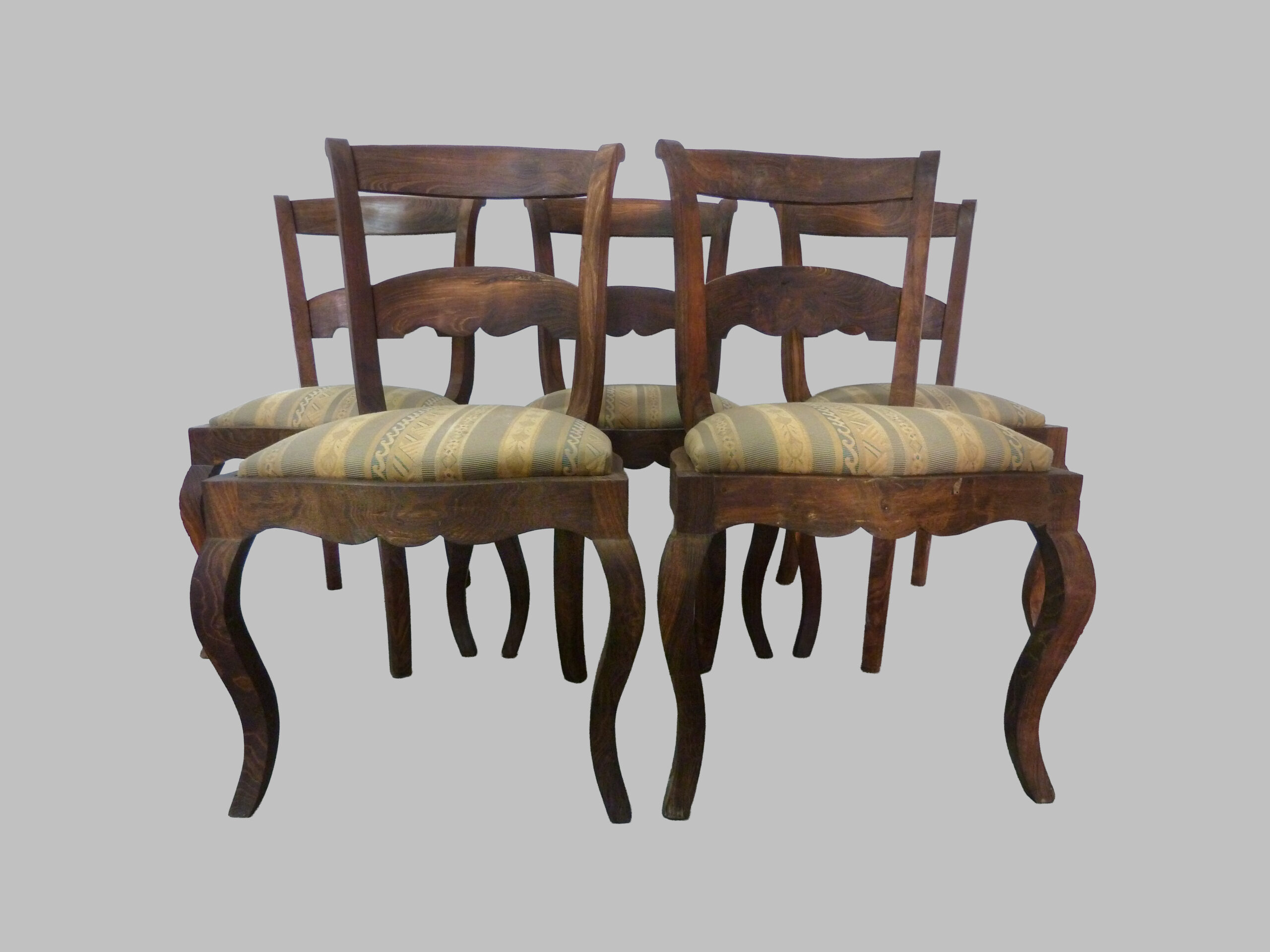 Conjunto de seis sillas de estilo Imperio, realizadas en madera de morera, datadas alrededor de 1800, que reflejan la sobriedad y el equilibrio del mobiliario neoclásico de principios del siglo XIX.