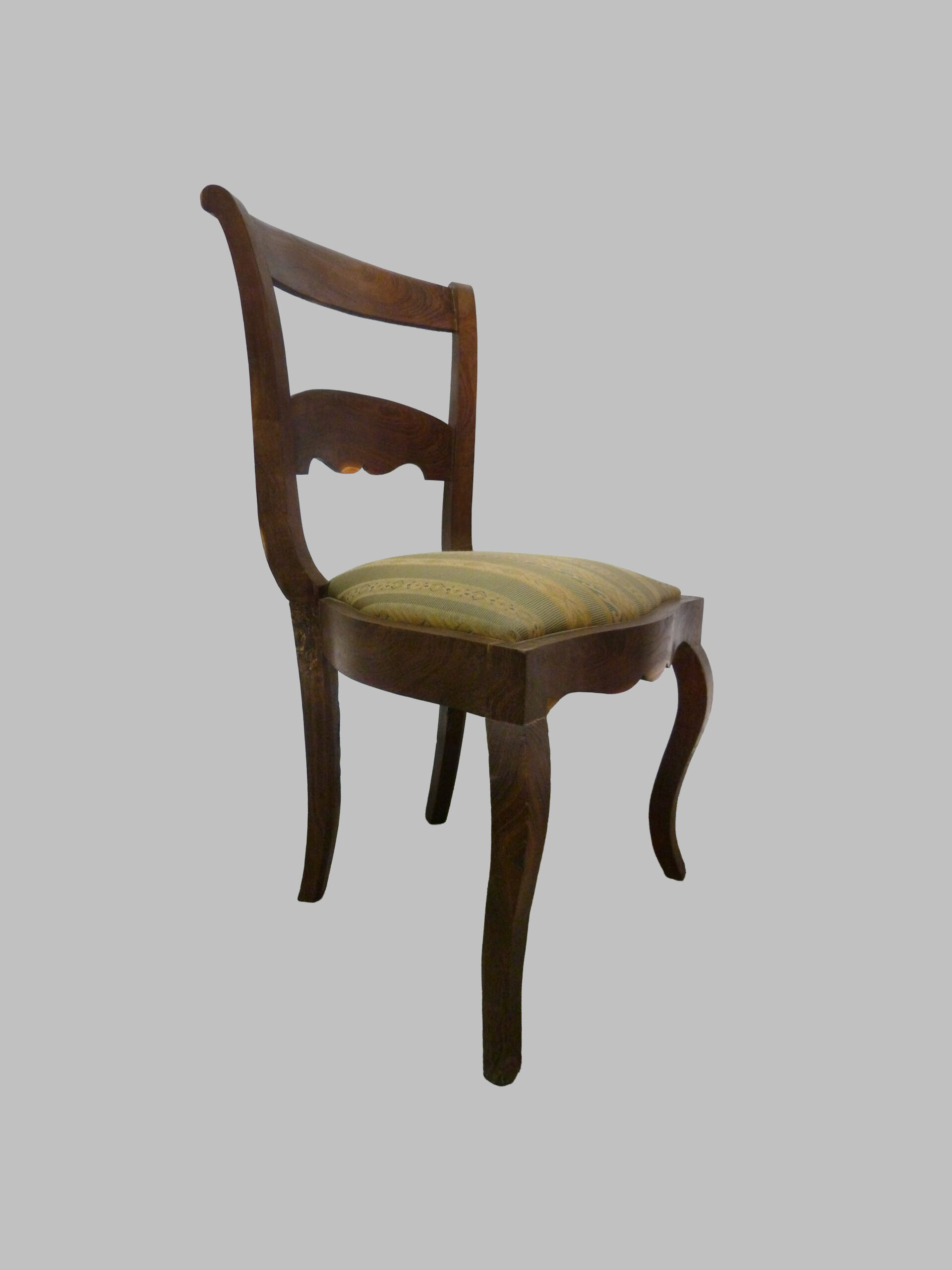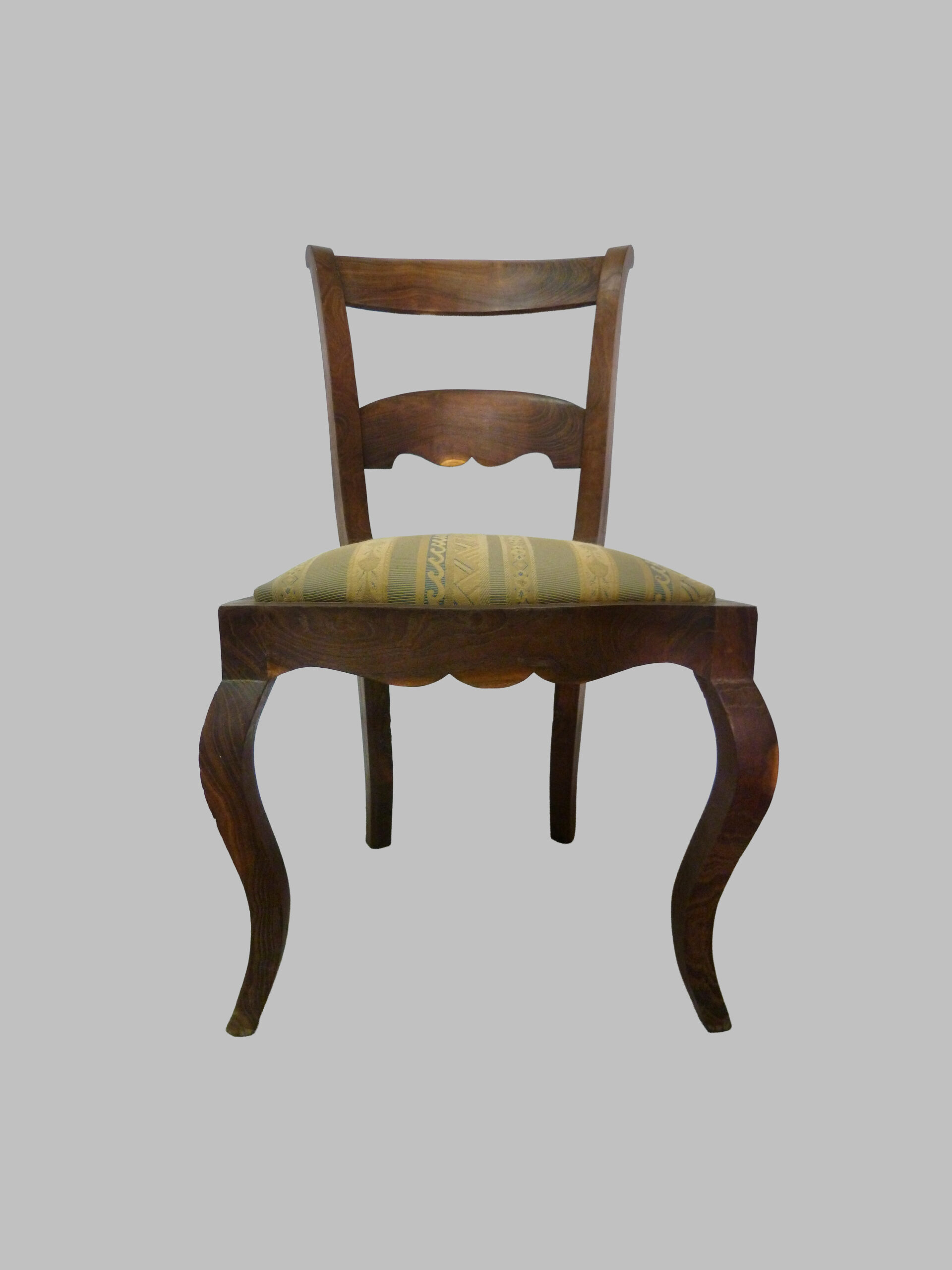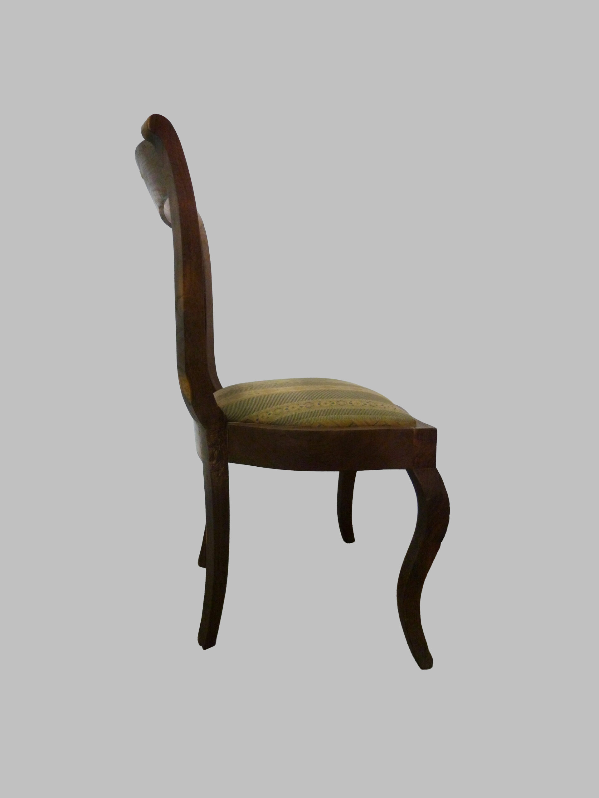 Las sillas destacan por su respaldo de pala, un diseño característico del estilo Imperio que aporta simplicidad elegante y comodidad, así como por sus pies curvados, que añaden dinamismo y refinamiento a la estructura. La madera de morera, apreciada por su resistencia y cálida tonalidad, realza el carácter natural y la autenticidad de estas piezas.