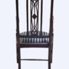 Sillón Eduardiano de caoba con dos óvalos de limoncillo en el respaldo, uno en la parte central del respaldo y el otro en la parte superior del mismo, los brazos son curvos y el asiento está tapizado a rayas blancas y azules con cenefa blanca en el borde.
