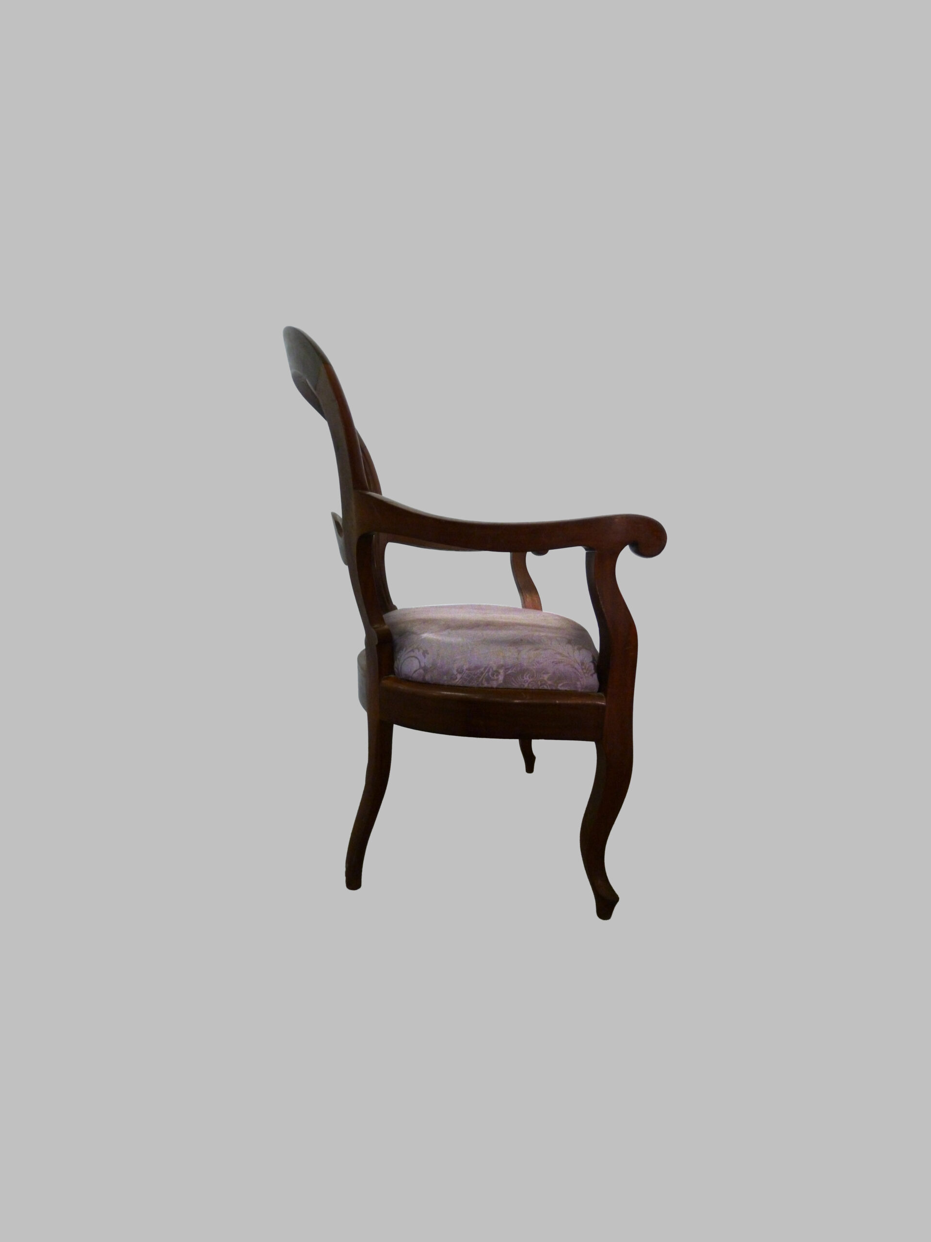La silla presenta una estructura sólida y equilibrada, propia del estilo isabelino, con líneas sobrias que aportan armonía y elegancia. La caoba, madera noble ampliamente utilizada en el siglo XIX, proporciona resistencia, durabilidad y una cálida tonalidad natural, resaltando la belleza de la veta y la calidad del trabajo artesanal.