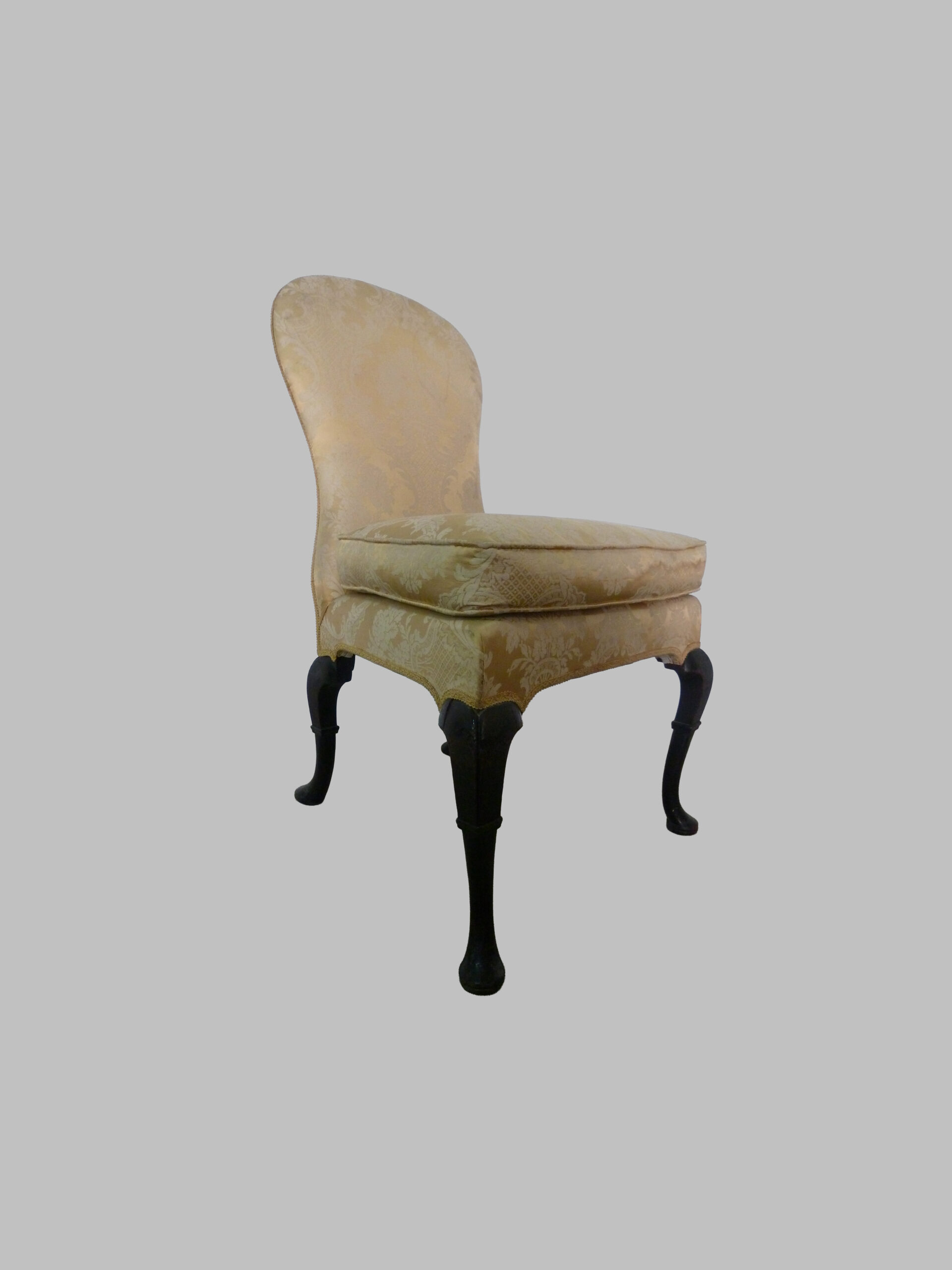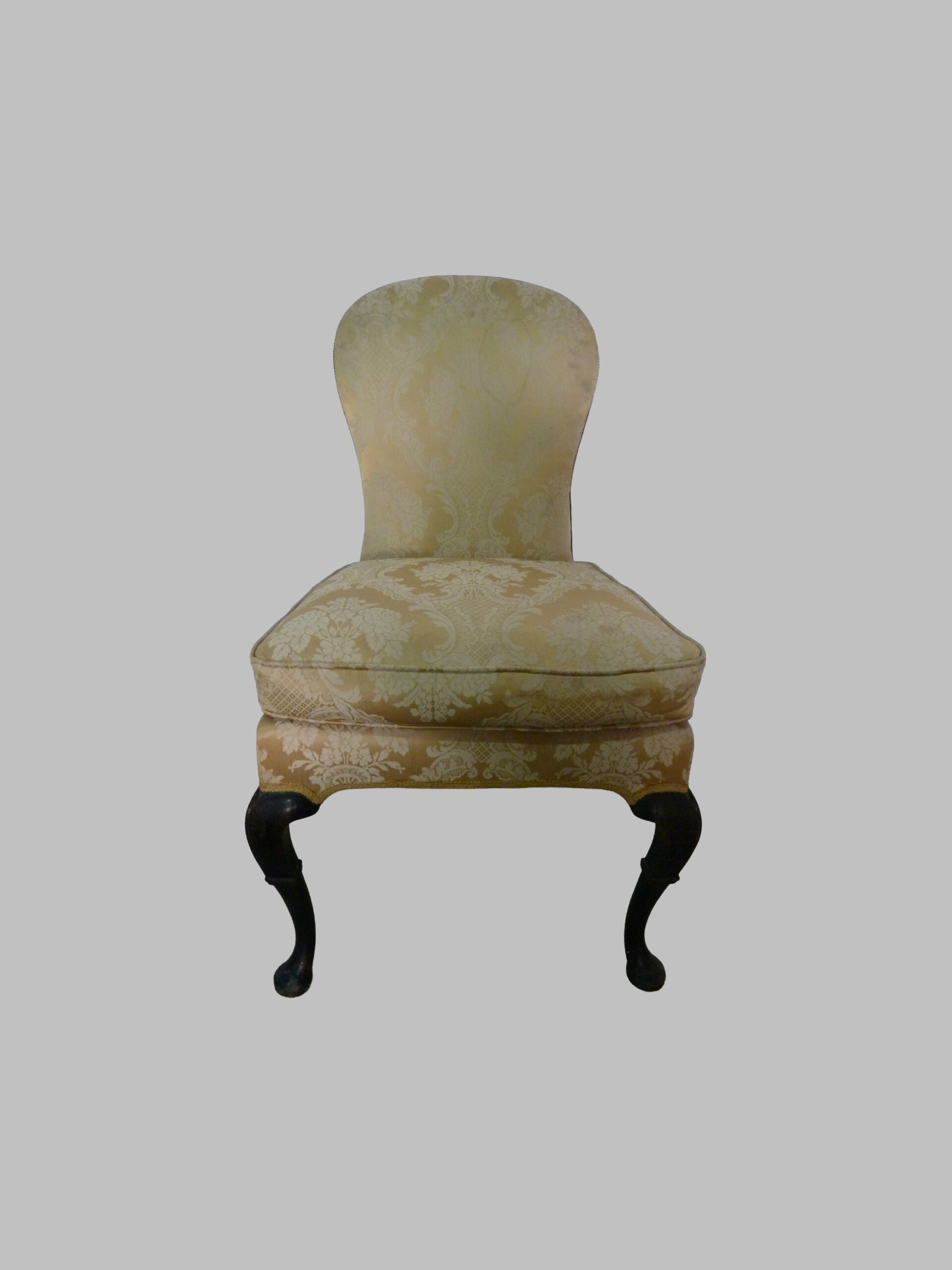 La pieza cuenta con un respaldo y asiento tapizados en damasco dorado, aportando lujo, calidez y un aire aristocrático a cualquier estancia. Sus líneas equilibradas y curvas suaves reflejan la elegancia clásica inglesa, mientras que la estructura cuidadosamente trabajada ofrece resistencia y confort.