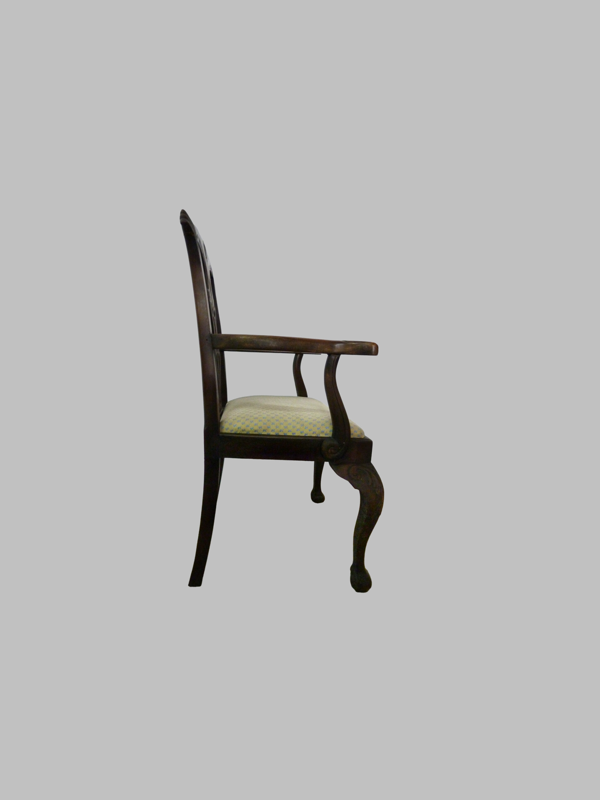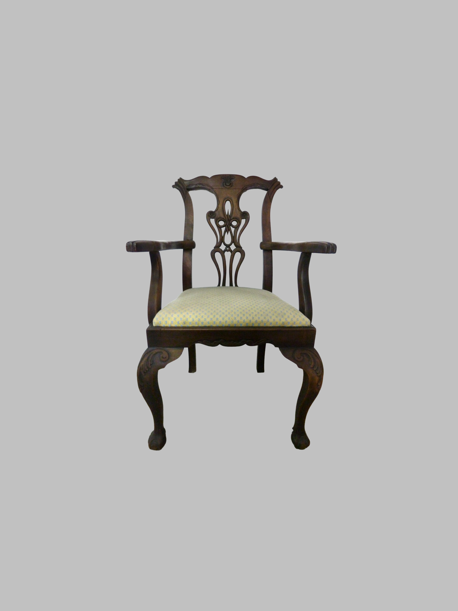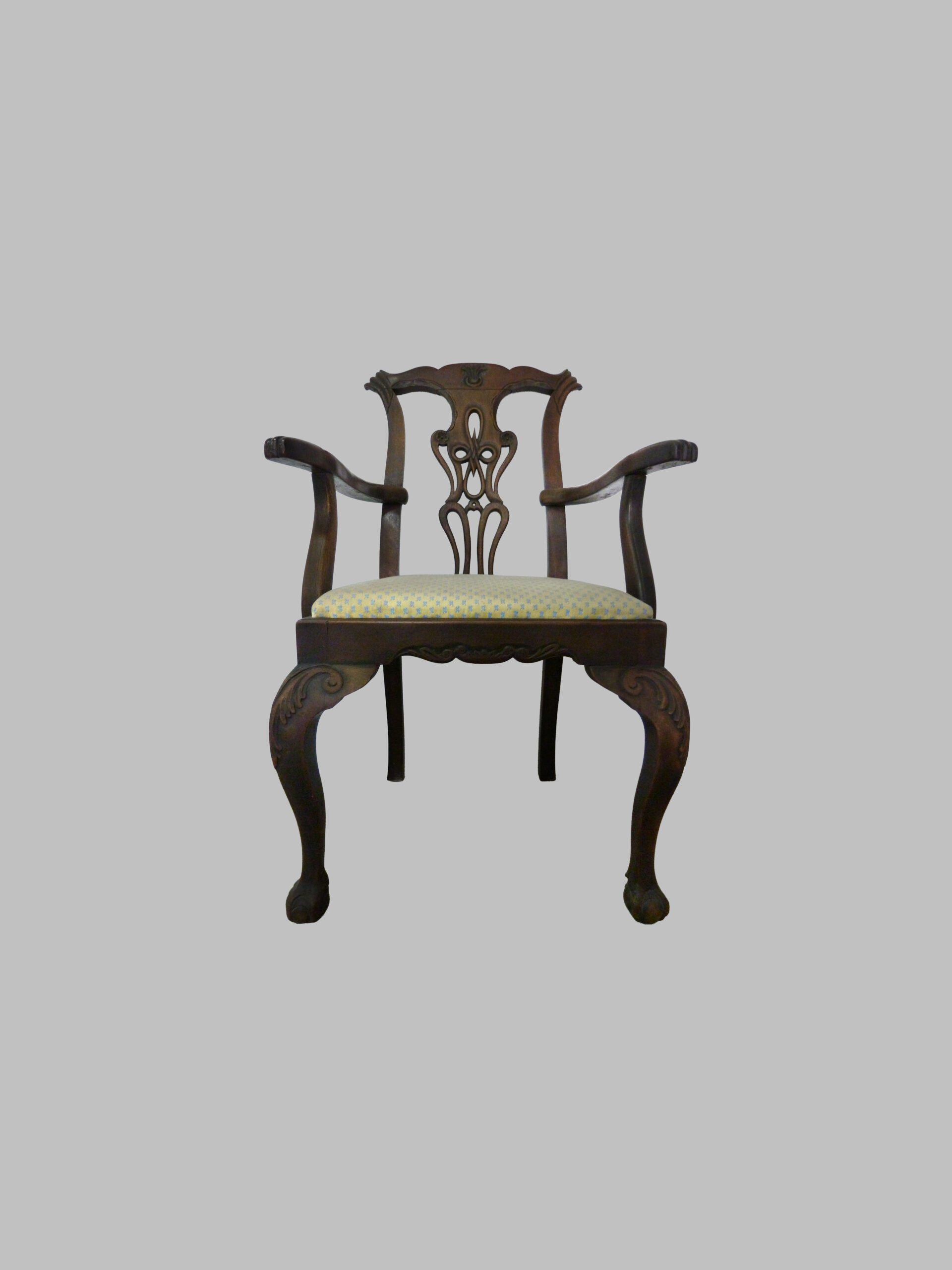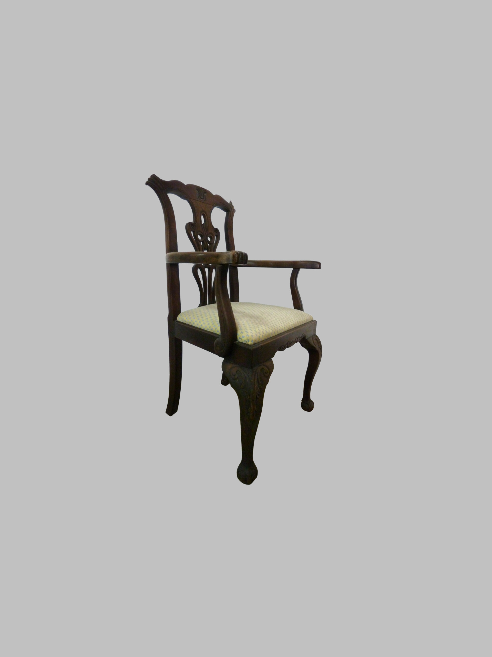 La pieza destaca por sus brazos y pies curvados, que aportan comodidad, fluidez visual y un perfil estilizado, característico del estilo Chippendale. La caoba, madera noble y duradera, proporciona resistencia, tonalidad cálida y belleza natural de la veta, resaltando la calidad artesanal y el refinamiento de la pieza.