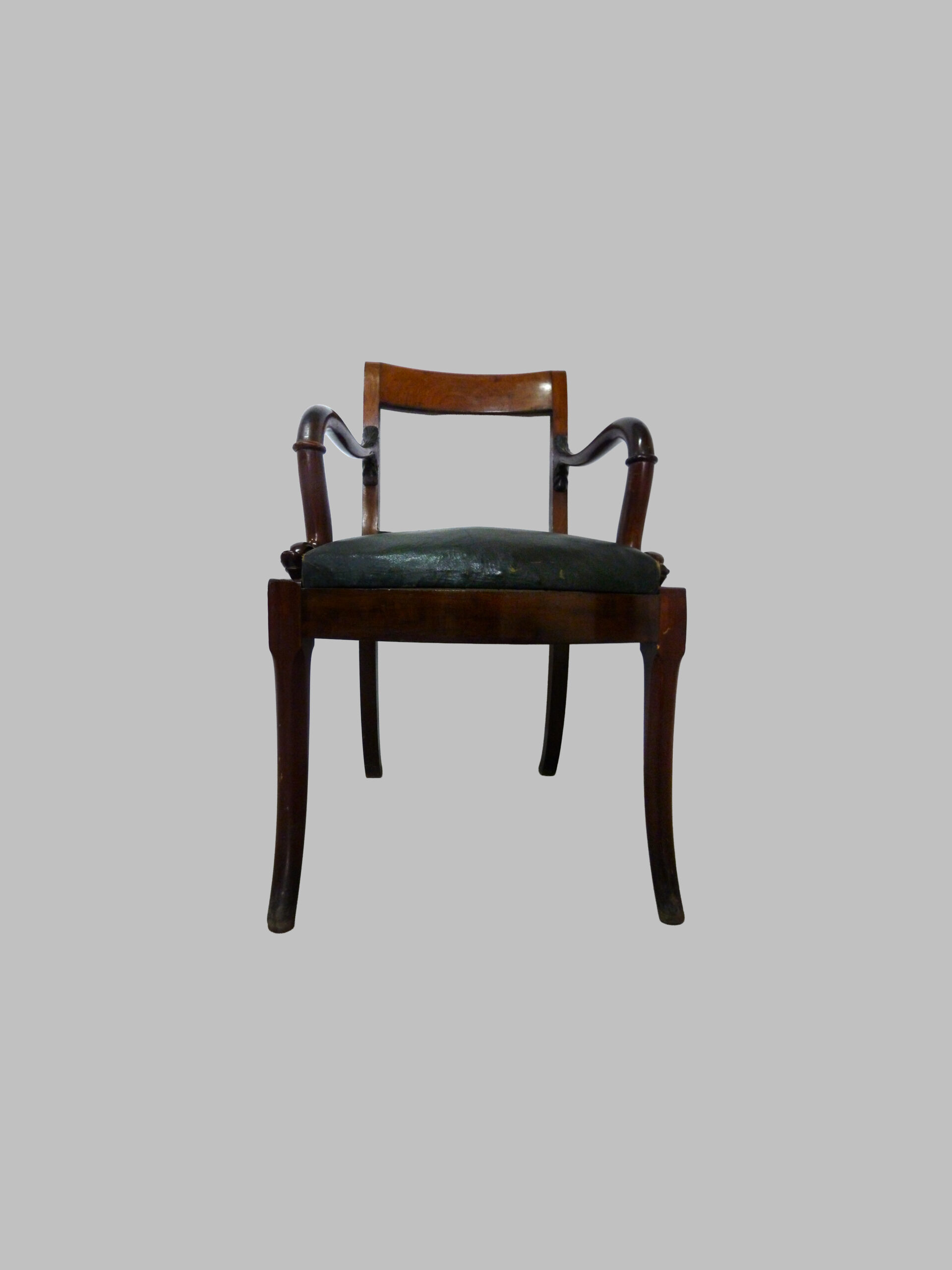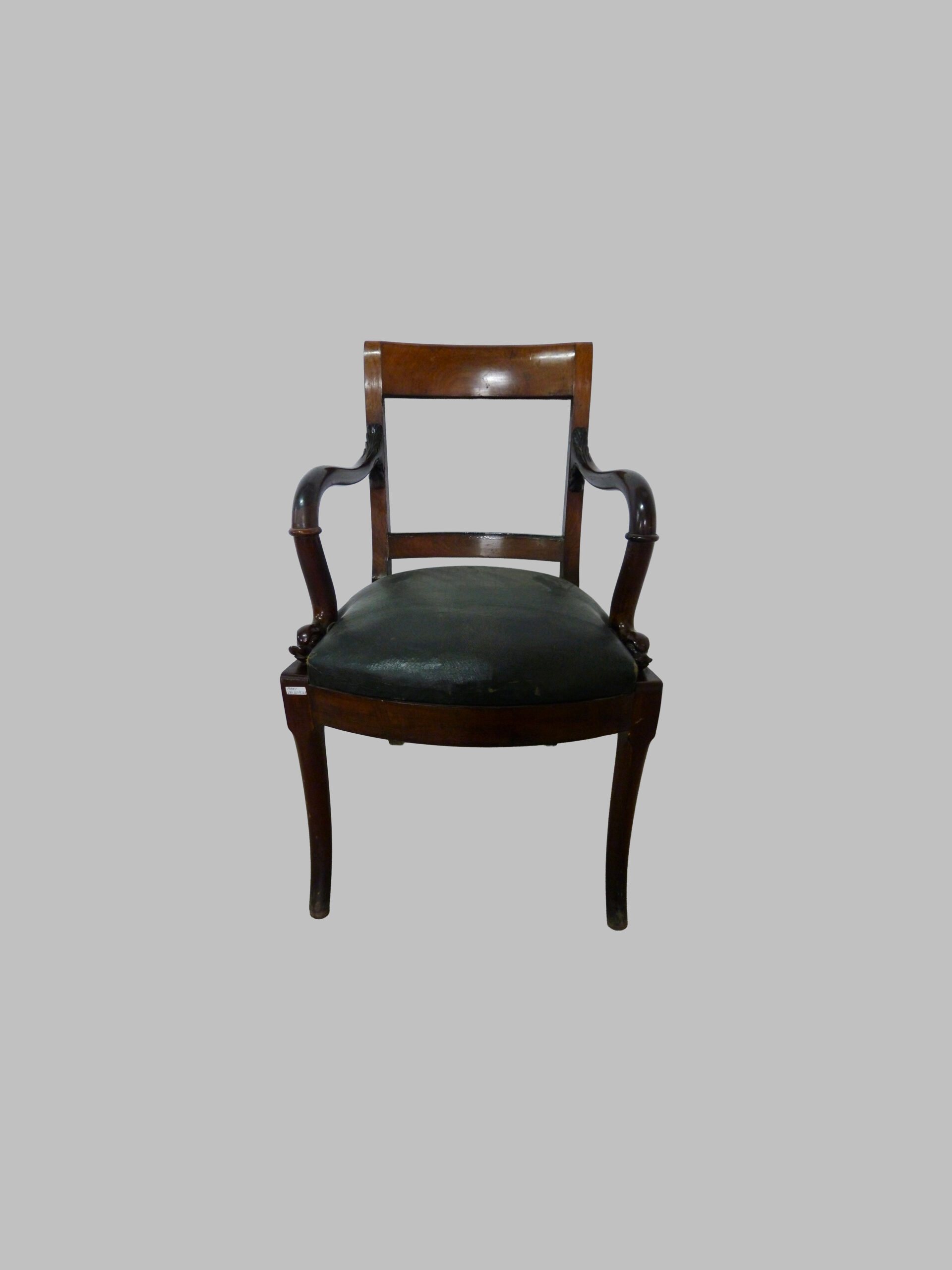 Sillón de estilo Imperio realizado en madera de caoba, datado alrededor del año 1800, que refleja la sofisticación y el simbolismo del mobiliario europeo de principios del siglo XIX.