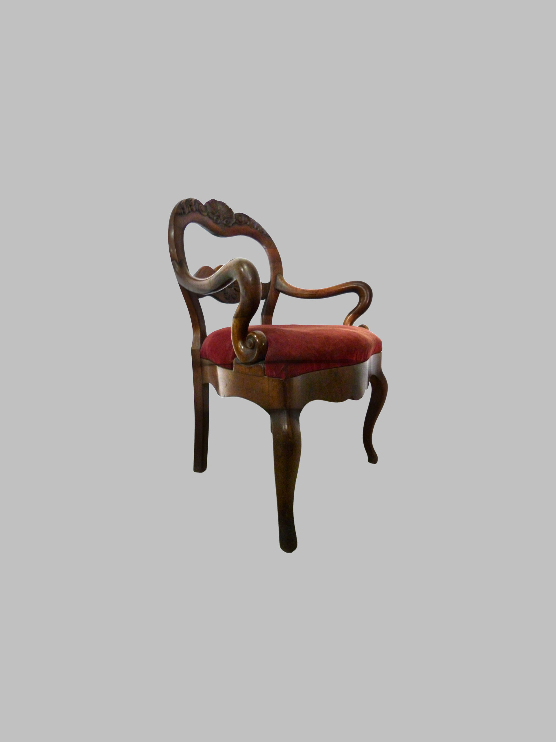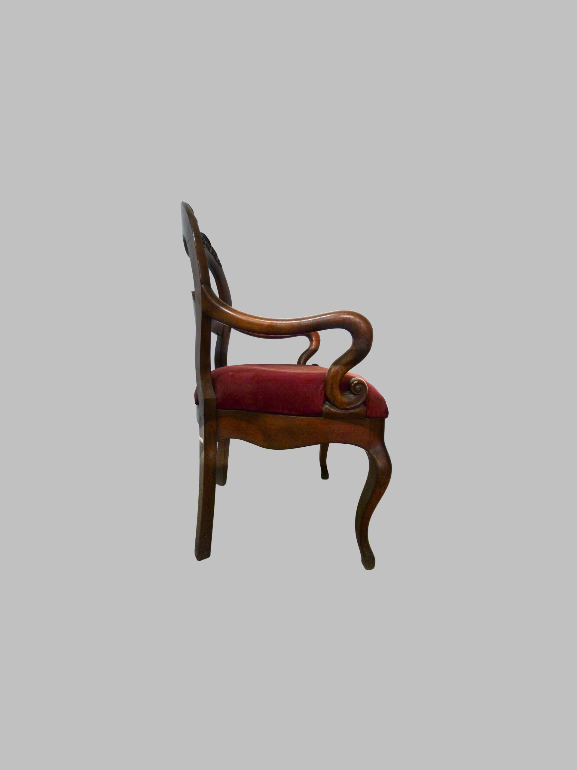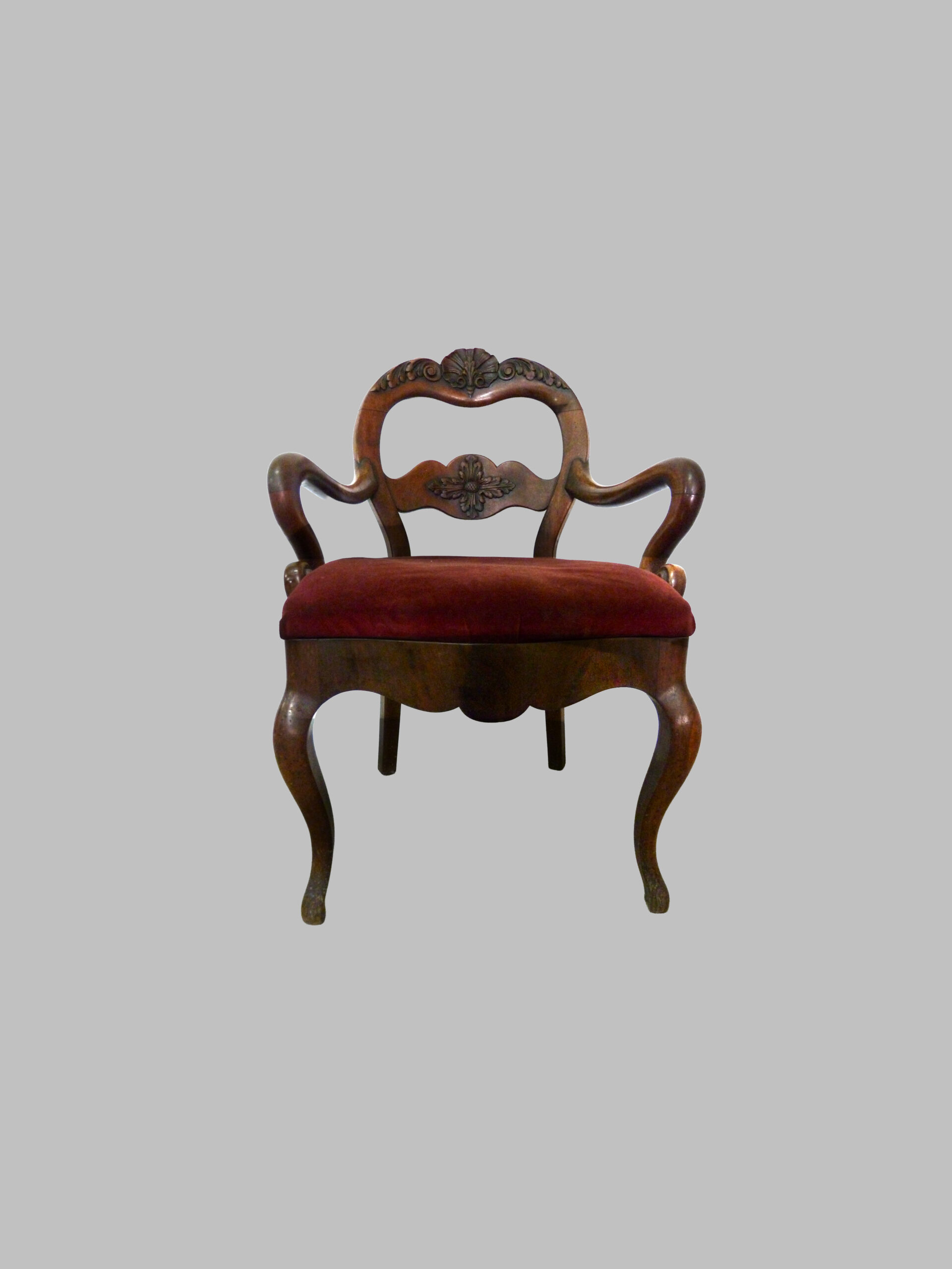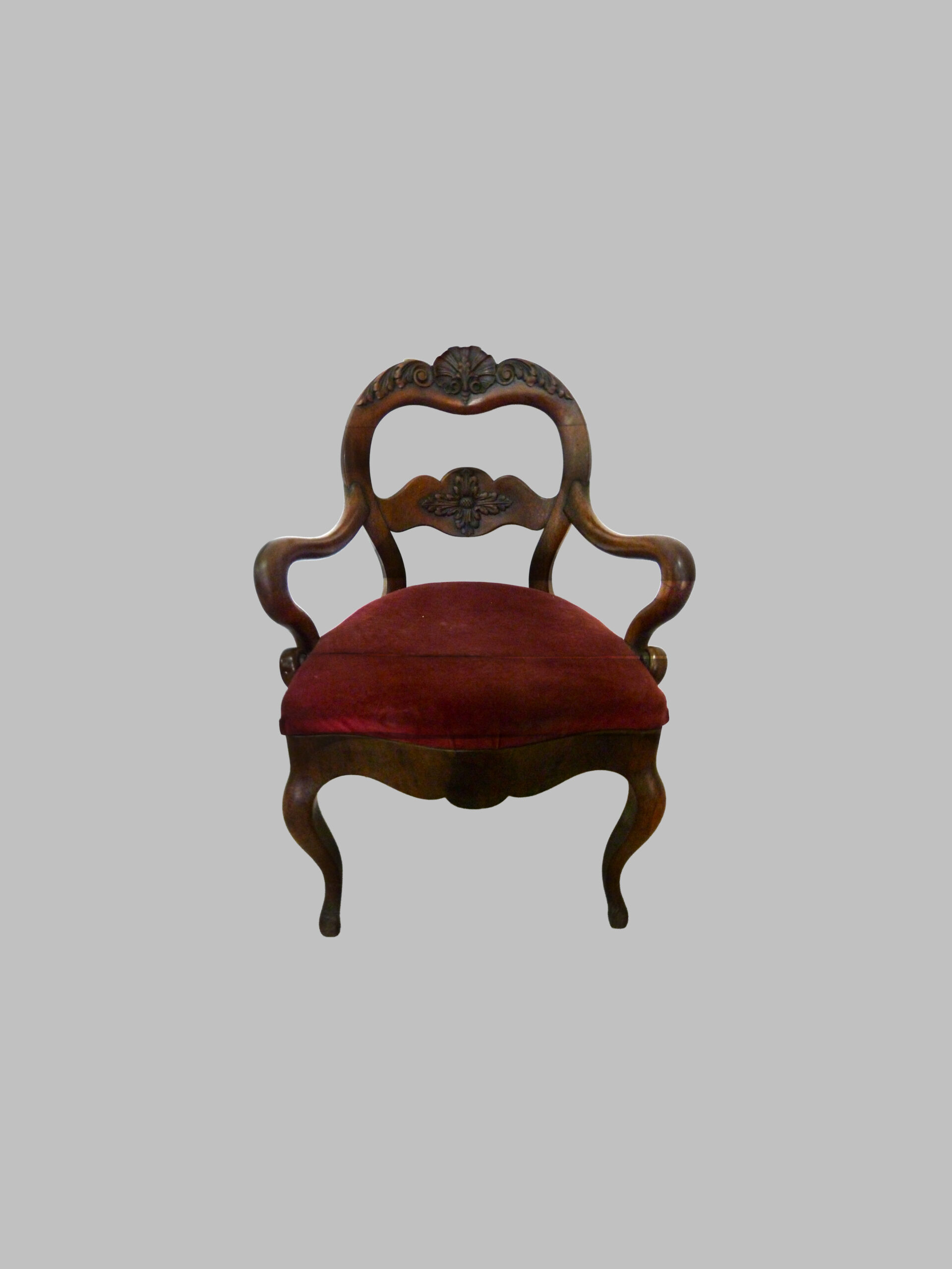 Destaca por su respaldo con talla decorativa, que aporta sofisticación y detalle artístico, y por sus brazos y pies curvados, que confieren movimiento, elegancia y armonía al diseño. La caoba maciza proporciona resistencia, durabilidad y una cálida tonalidad que realza la belleza natural de la madera.
