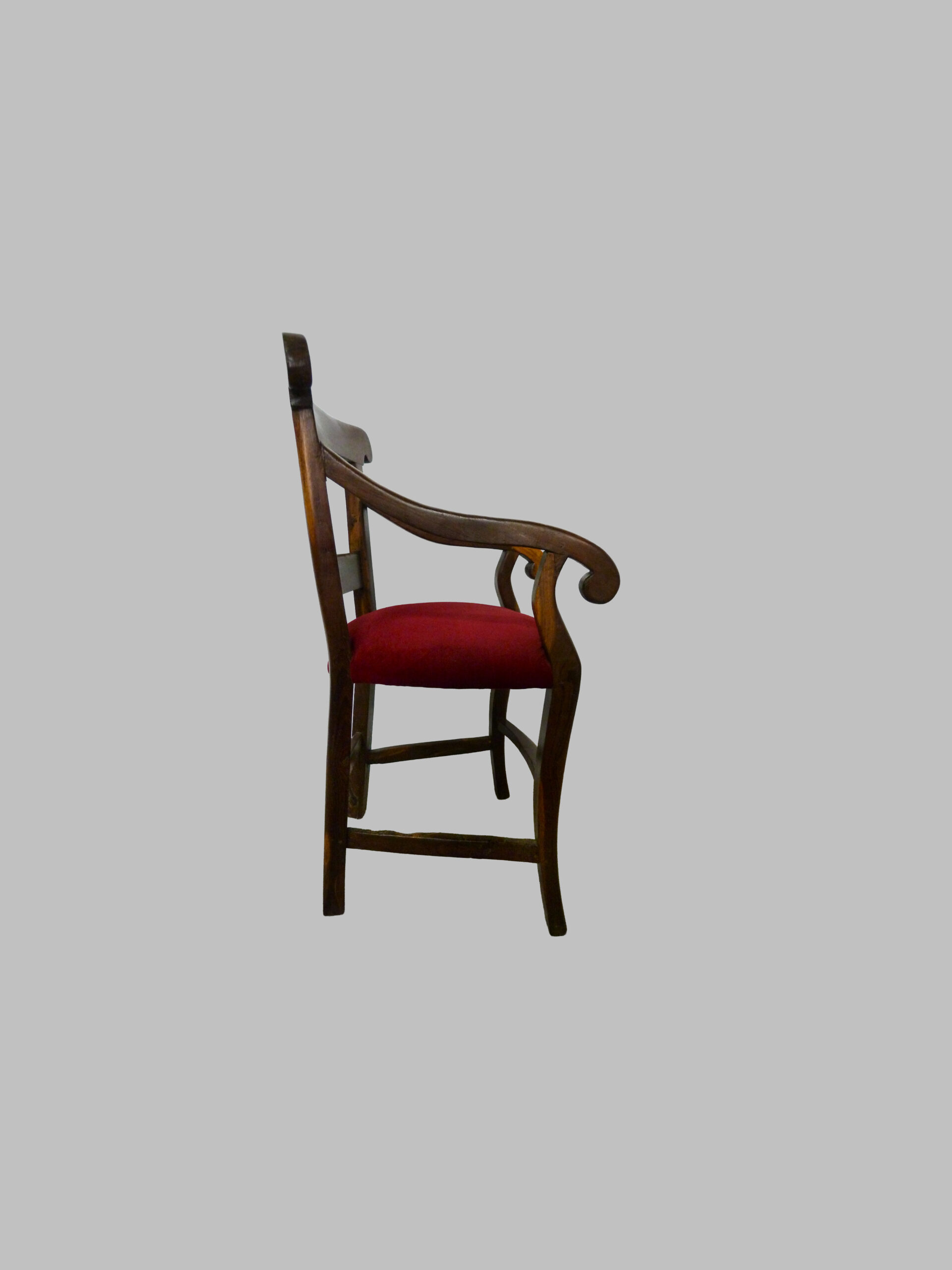 La estructura de morera maciza aporta solidez y una tonalidad cálida muy característica de la ebanistería tradicional. El sillón se completa con un tapizado en tono granate, que añade profundidad cromática y un contraste elegante con la madera
