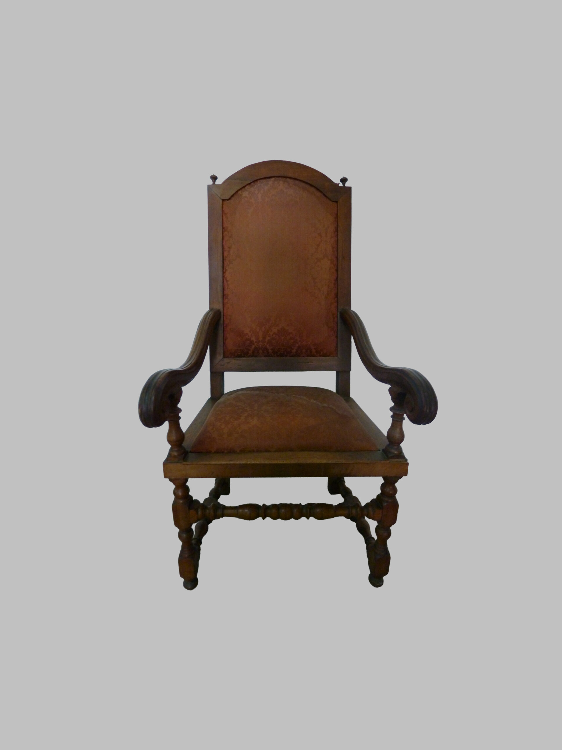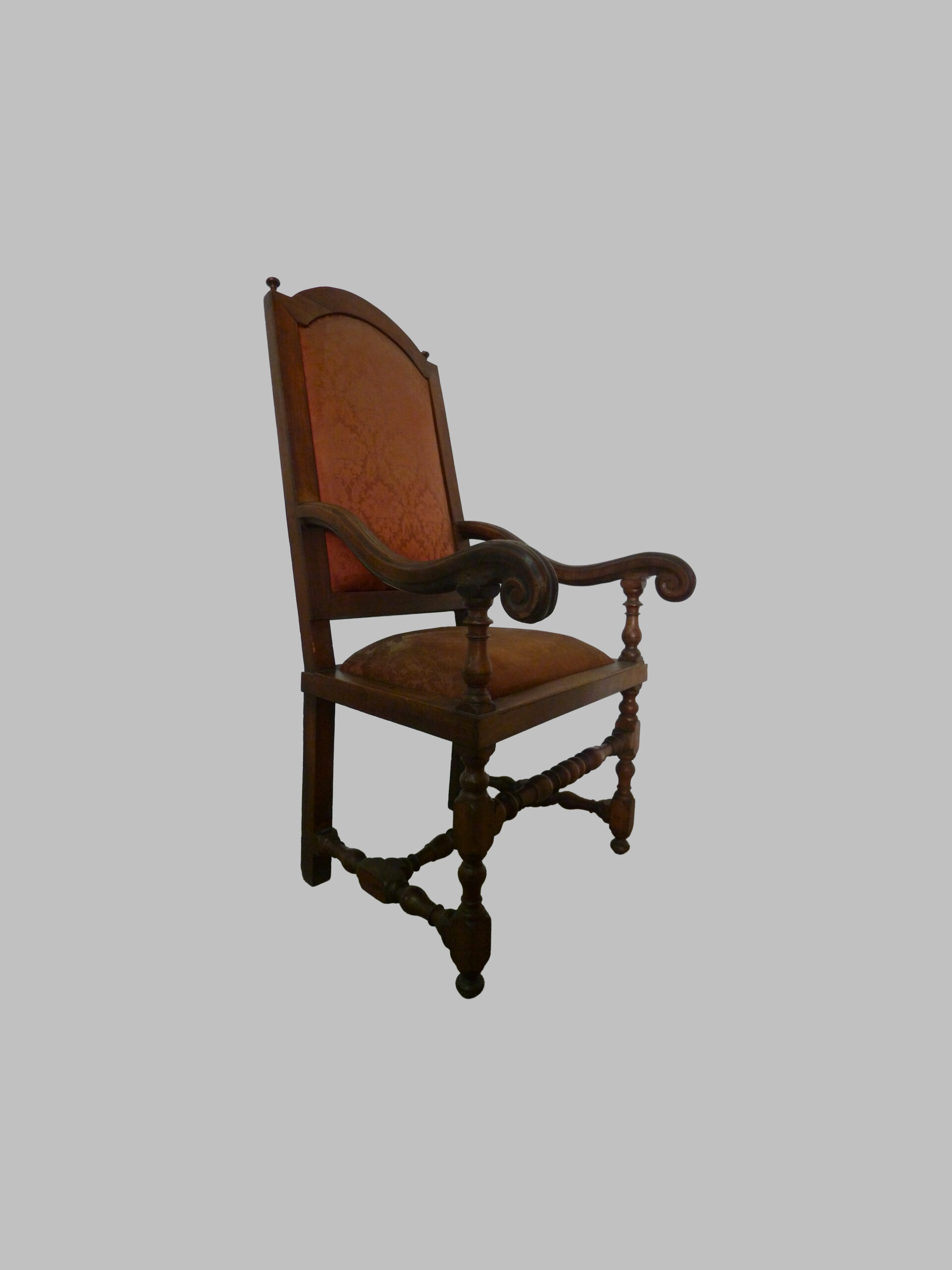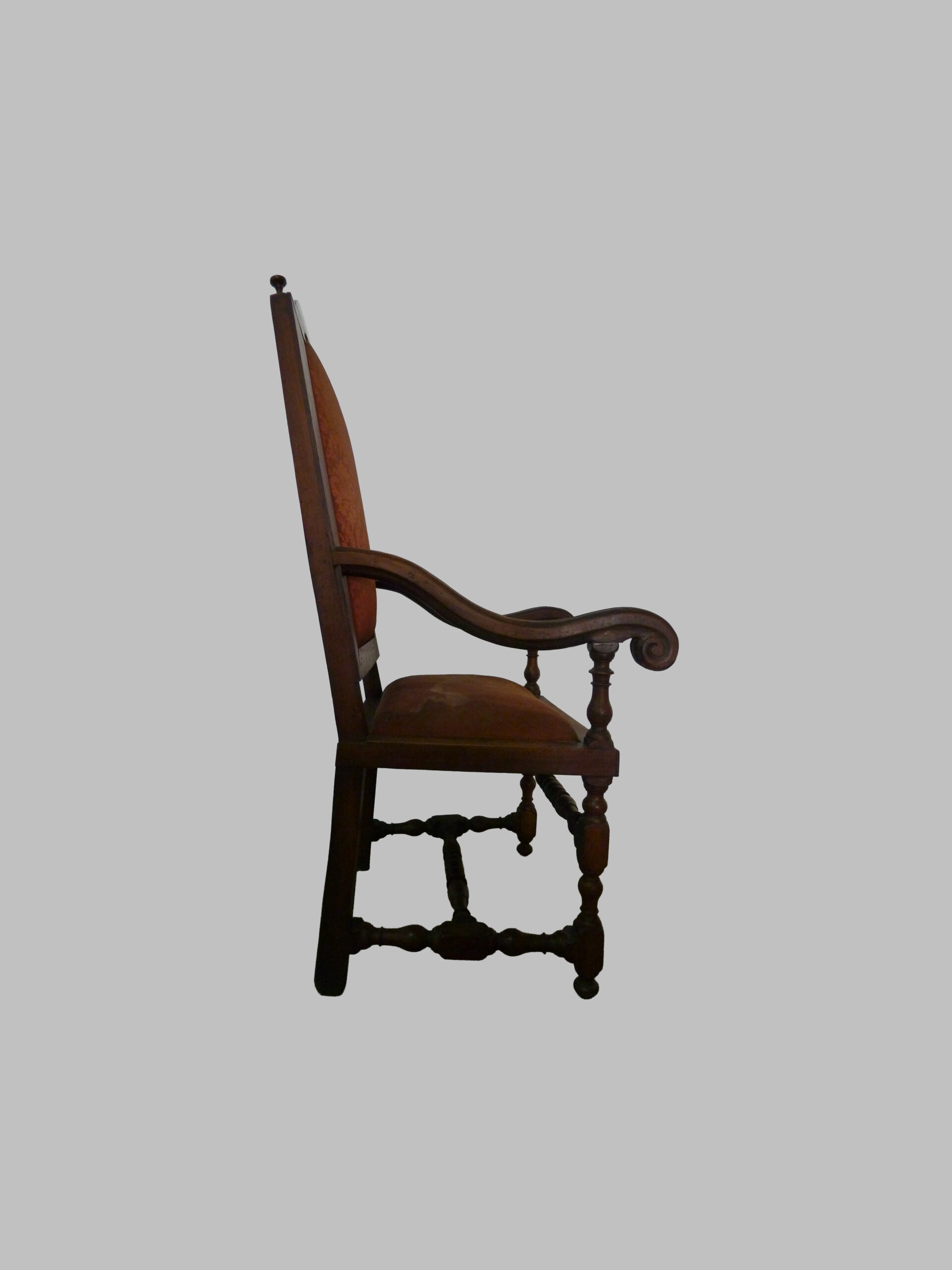 Sillón de estilo Luis XIII, realizado en nogal macizo y datado en el siglo XVII, que refleja la solidez, la majestuosidad y el refinamiento del mobiliario barroco francés.