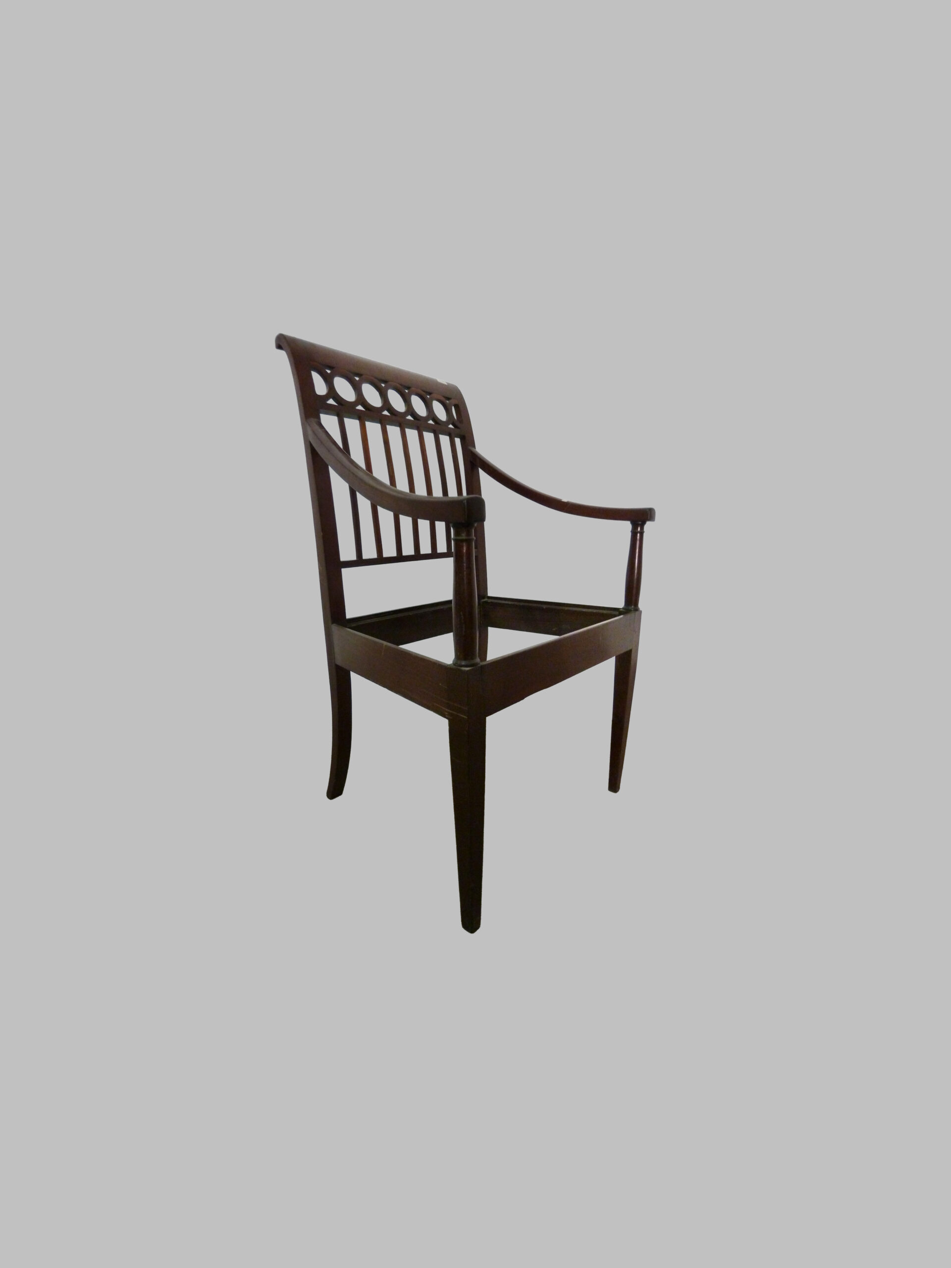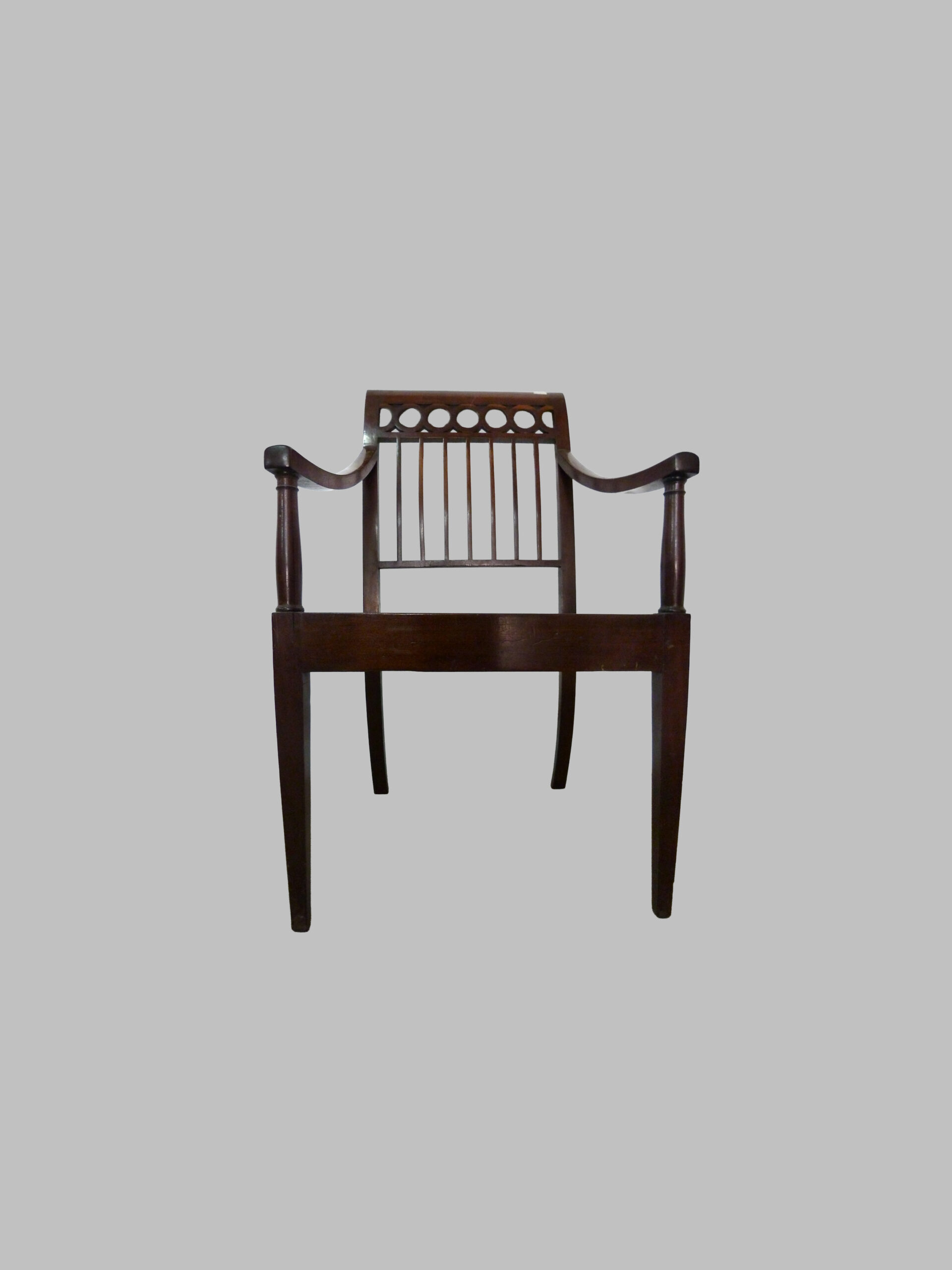 Sillón menorquín de estilo Imperio, realizado en caoba maciza y datado alrededor de 1800, que refleja la sobriedad, elegancia y funcionalidad del mobiliario neoclásico español.