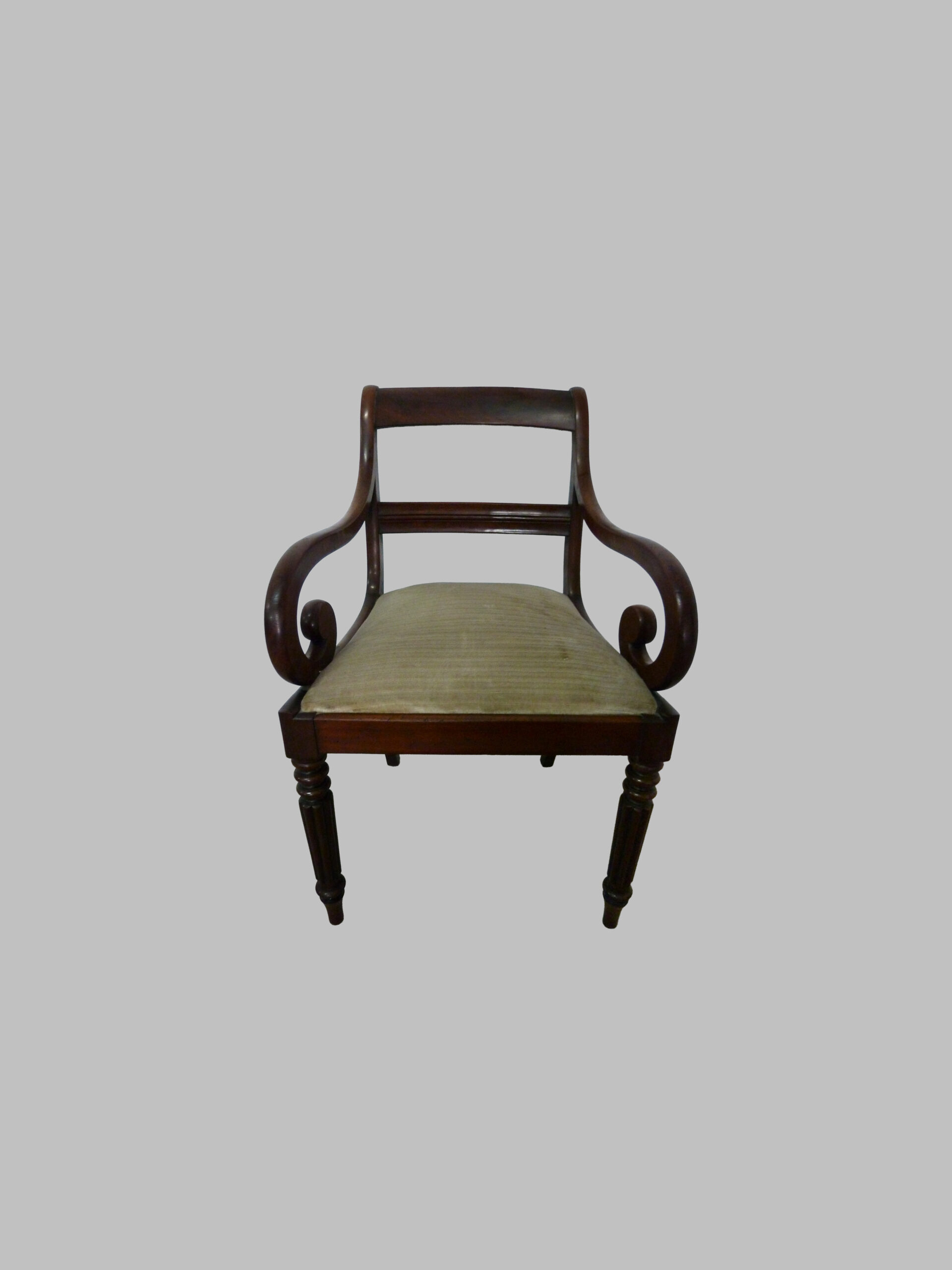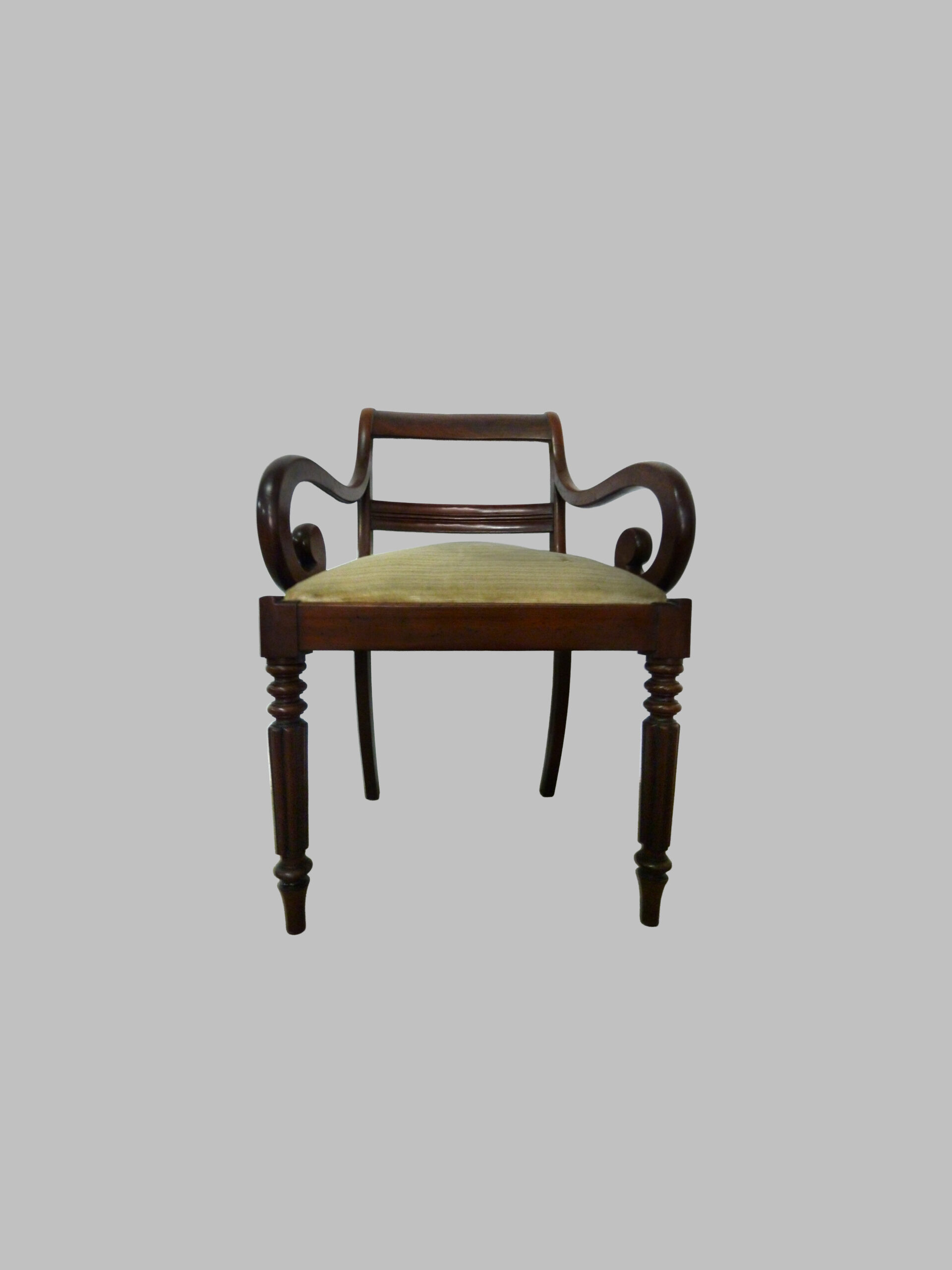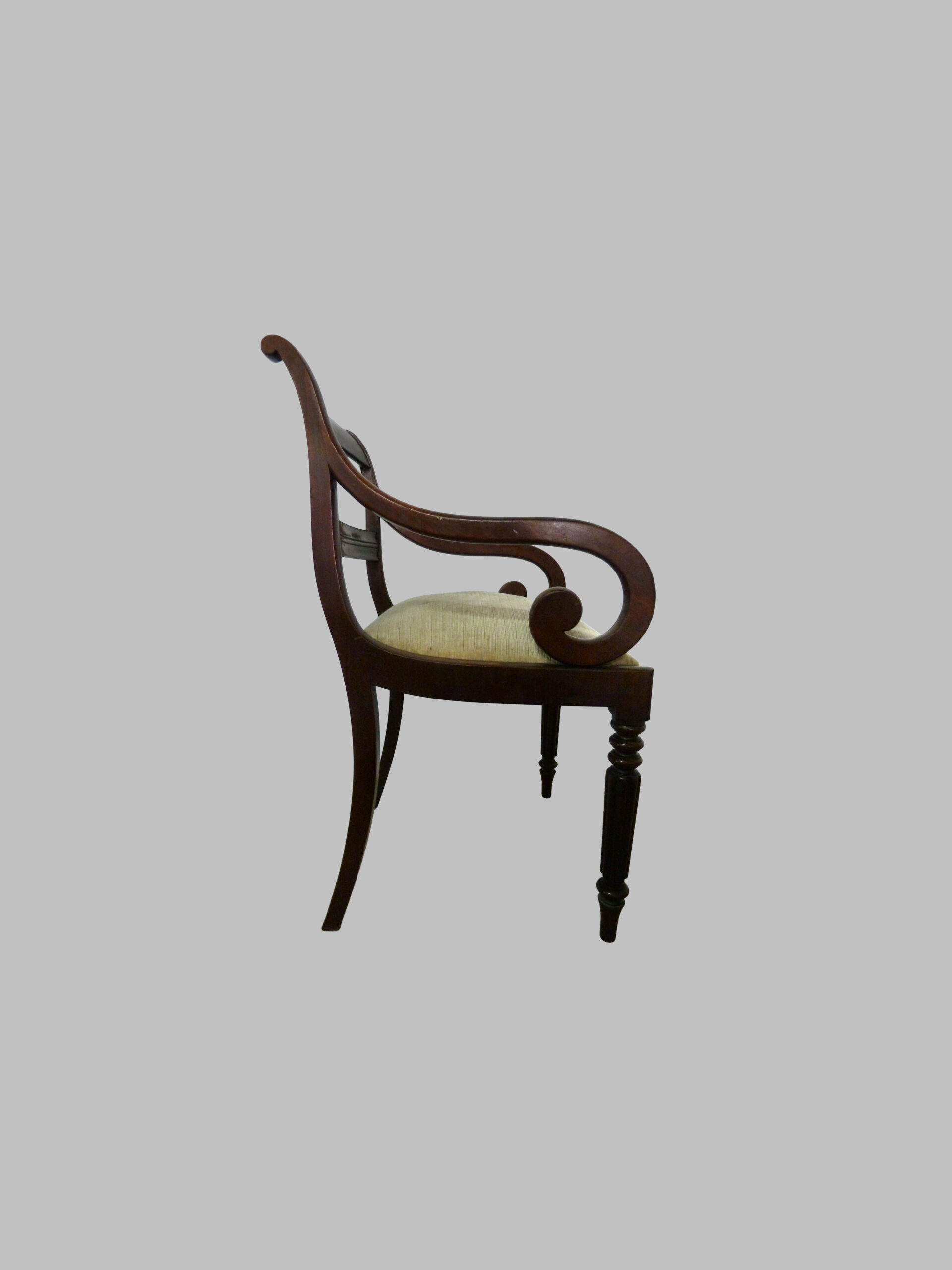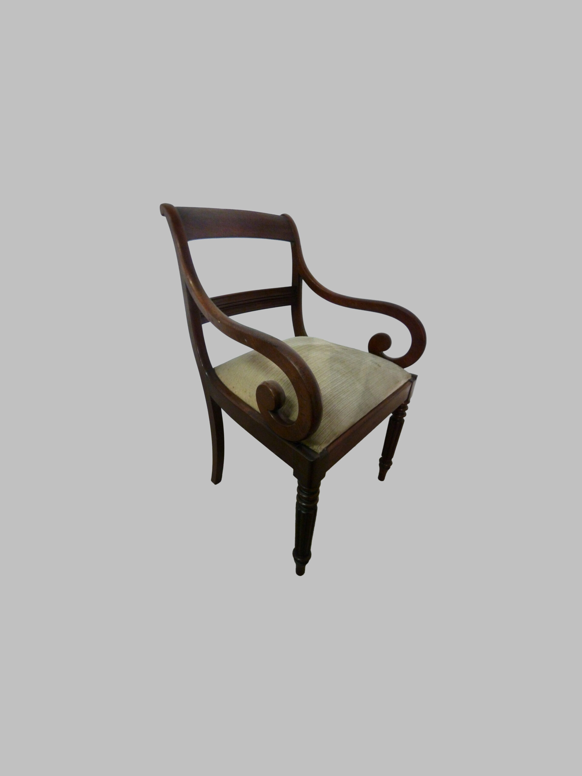 La pieza destaca por sus brazos curvados, que aportan comodidad y elegancia visual, y sus pies torneados, un detalle característico del trabajo artesanal victoriano que resalta la riqueza ornamental y la atención al detalle. Este sillón combina proporciones equilibradas y diseño funcional, ofreciendo confort y presencia decorativa.