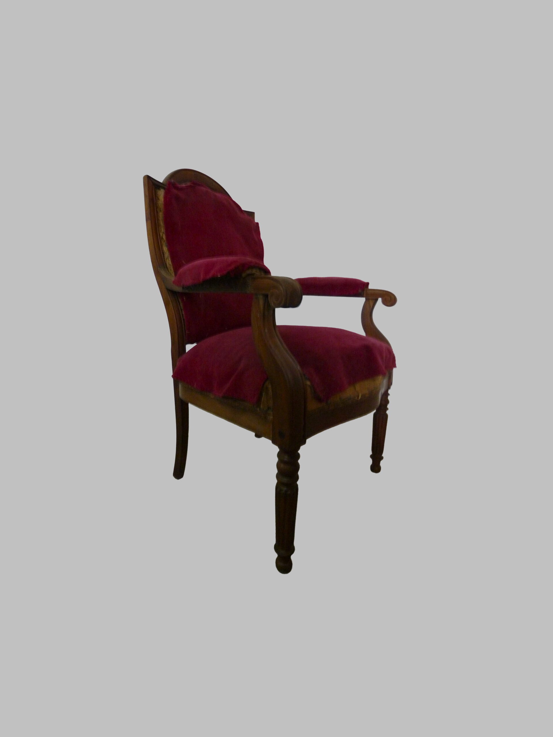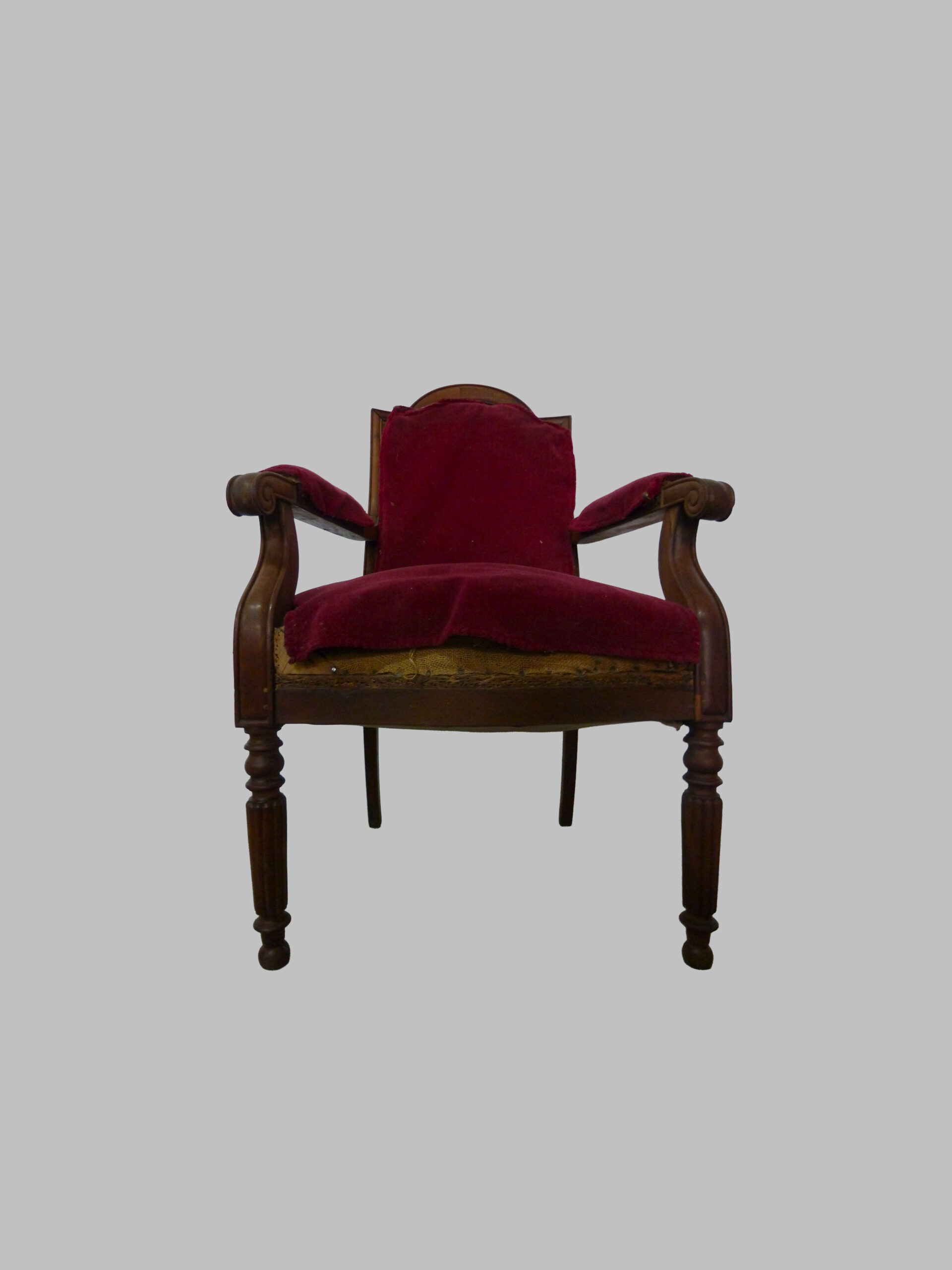 La pieza destaca por sus brazos curvados, que aportan comodidad y fluidez visual, y por sus pies frontales torneados, un detalle artesanal que realza su elegancia y calidad constructiva. La caoba, madera noble por excelencia, ofrece resistencia, durabilidad y una cálida tonalidad natural, resaltando la belleza de la veta y el acabado del conjunto.