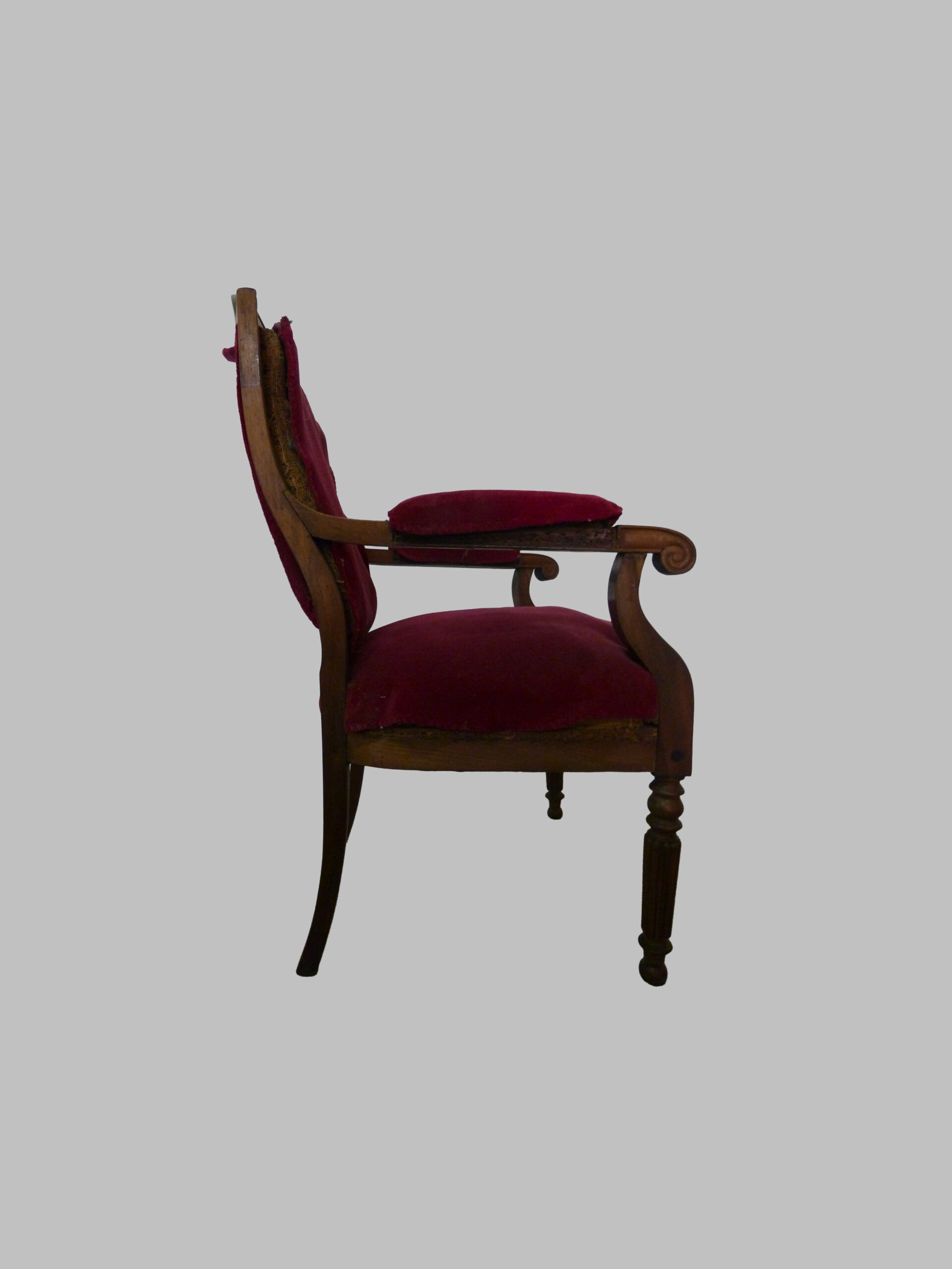 Sillón de estilo victoriano, realizado en caoba maciza y datado en el siglo XIX, que refleja la riqueza ornamental y el confort característico del mobiliario inglés de la época.