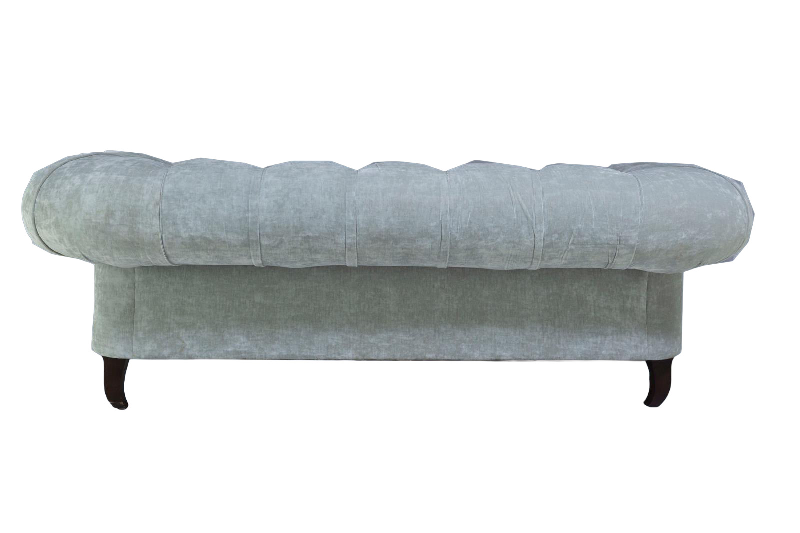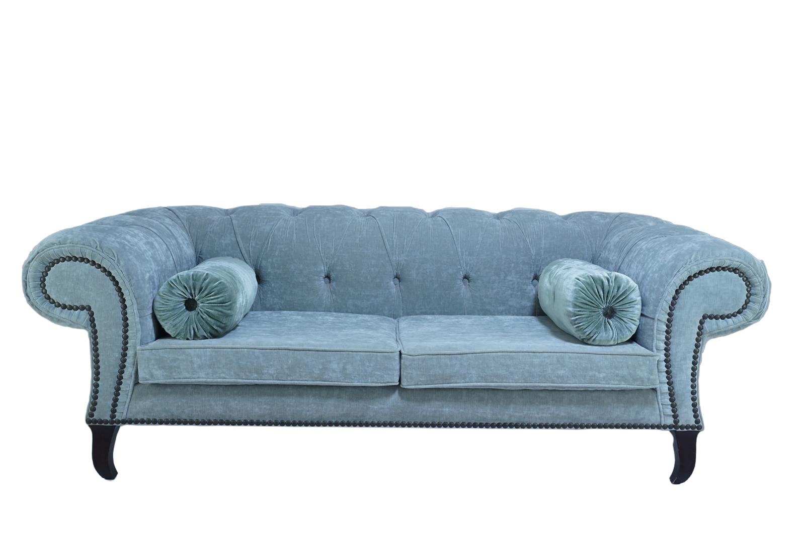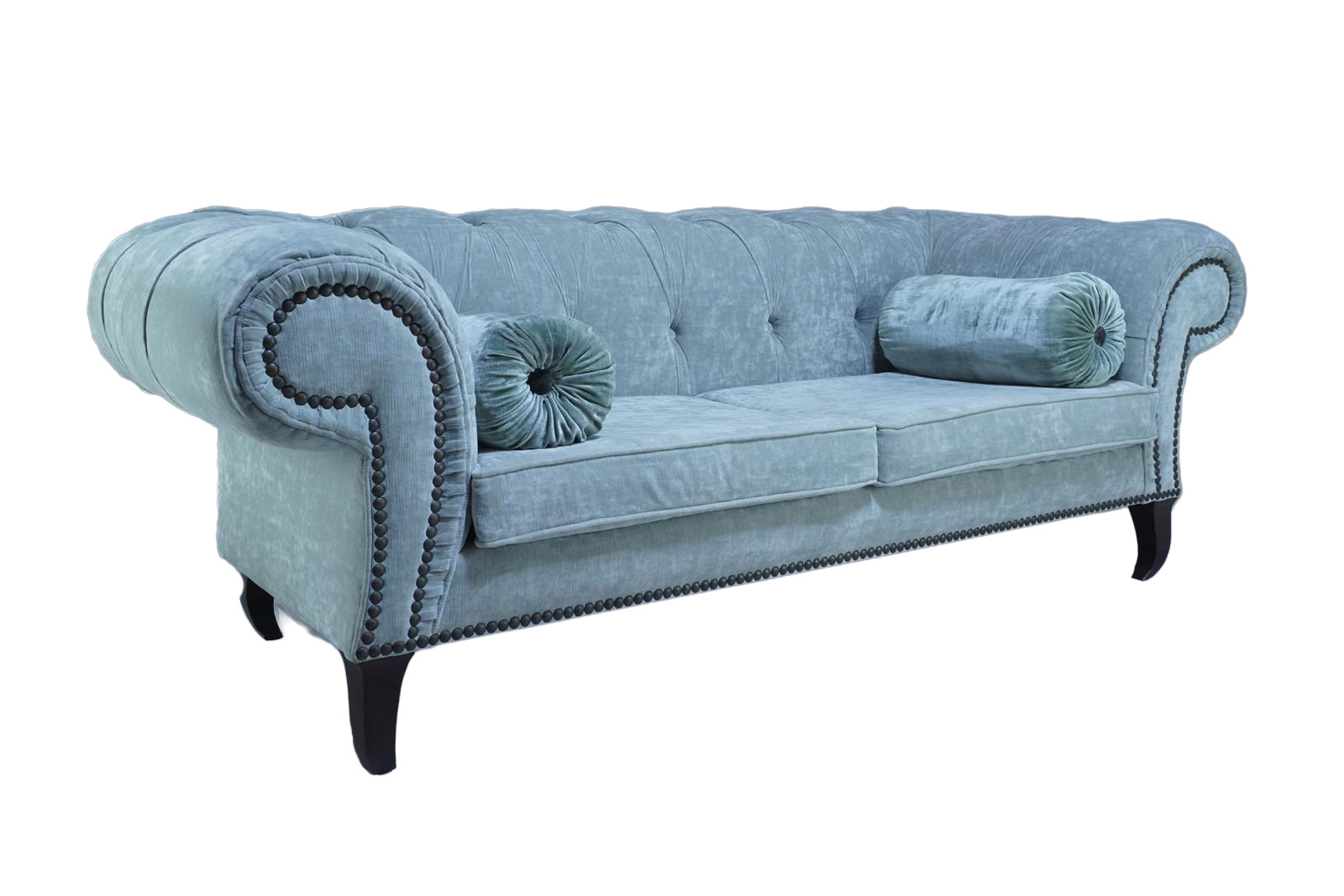 Sofá italiano con respaldo capitoné y brazos curvados, con parte frontal tachonada, el asiento está compuesto de dos cojines rectangulares, pies curvados hacia dentro, y complementado por dos cojines redondos como decoración.